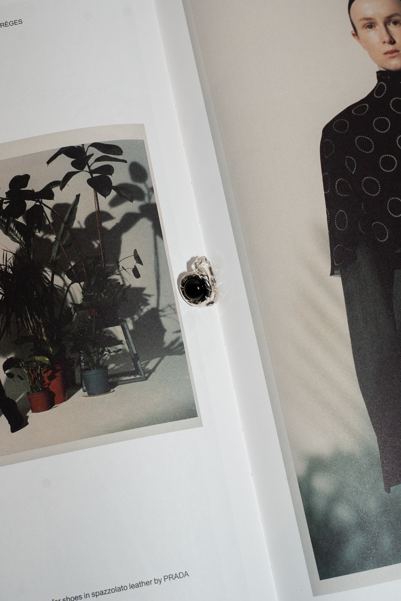 Organic shaped ring with twist detail onyx stone setting in recycled Sterling Silver. Stones are natural and slight variations in colors can occur.