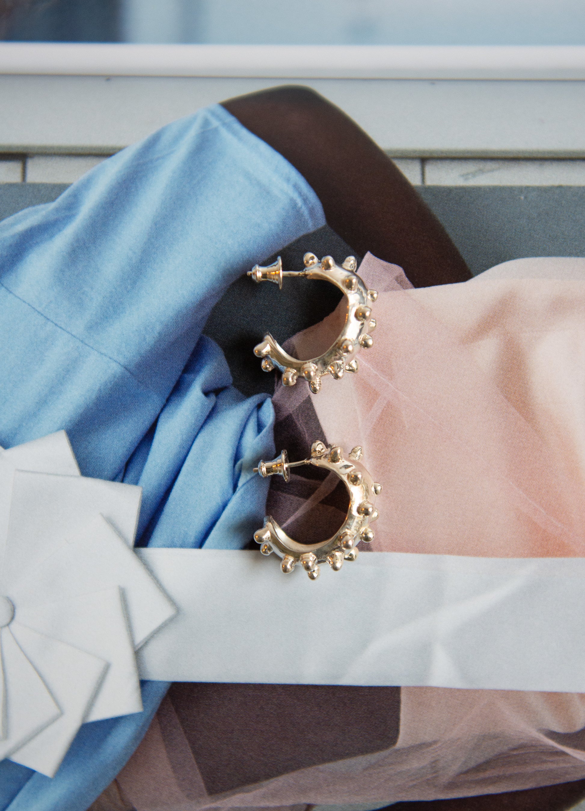 Dotted hoop earrings in sterling silver. Open hoop silhouette.