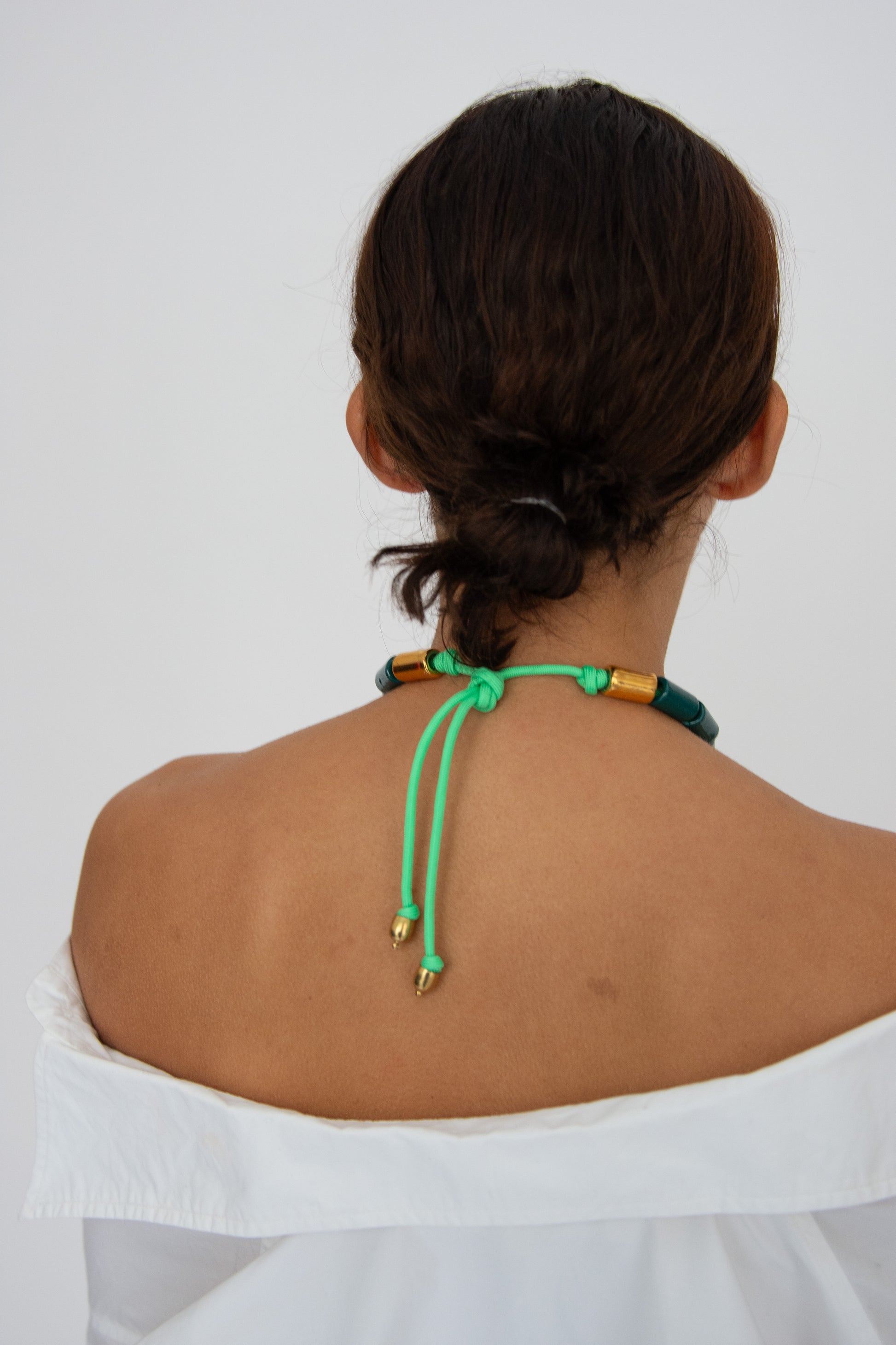 Adjustable necklace with large long ceramic stacked beads. Mix of forrest green and gold gloss ceramic beads. Cord in neon green color. Knotted cording with brass ends. Adjustable length.