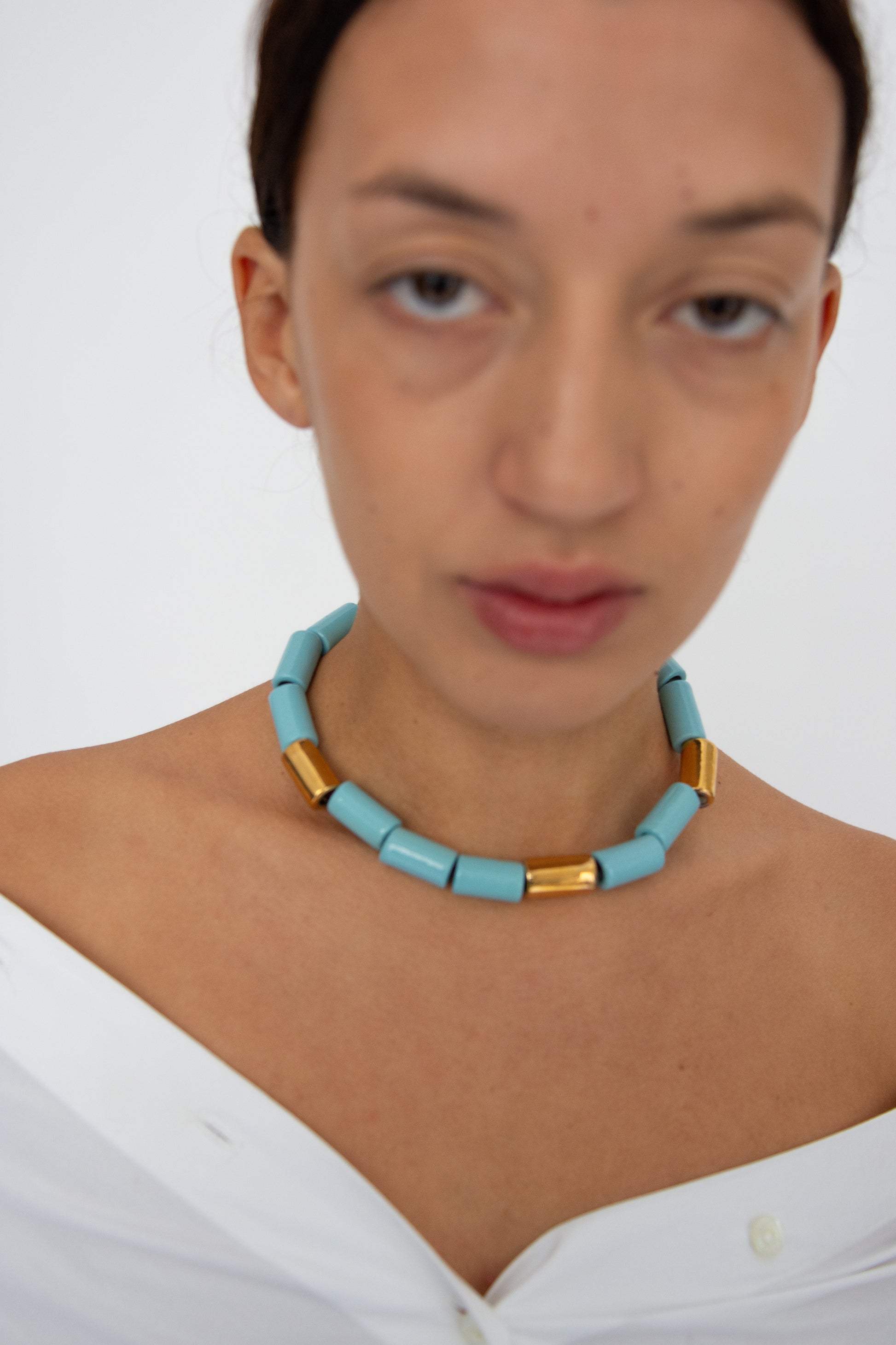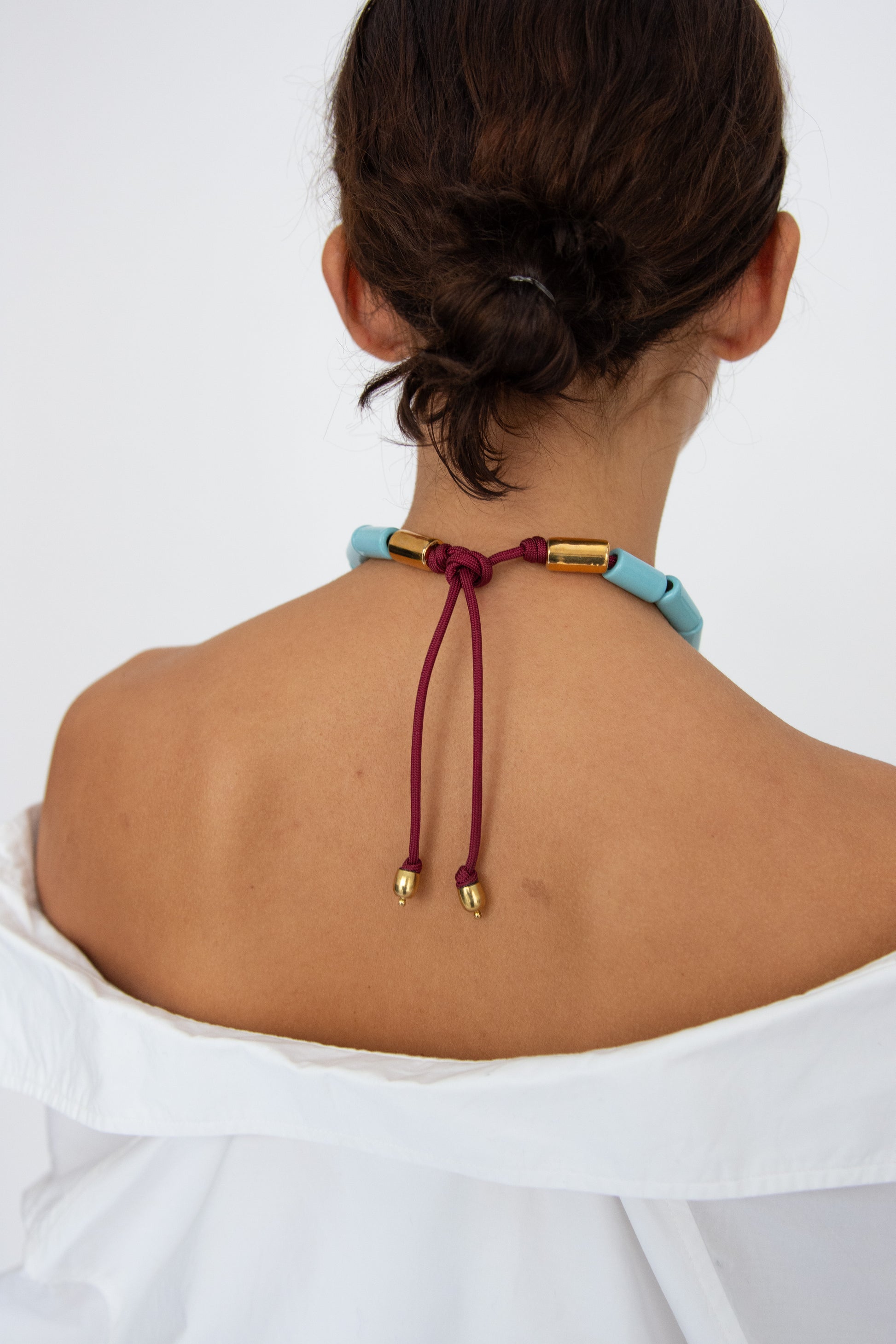 Adjustable necklace with large long ceramic stacked beads. Mix of baby blue and gold gloss ceramic beads. Cord in burgundy color. Knotted cording with brass ends. Adjustable length.