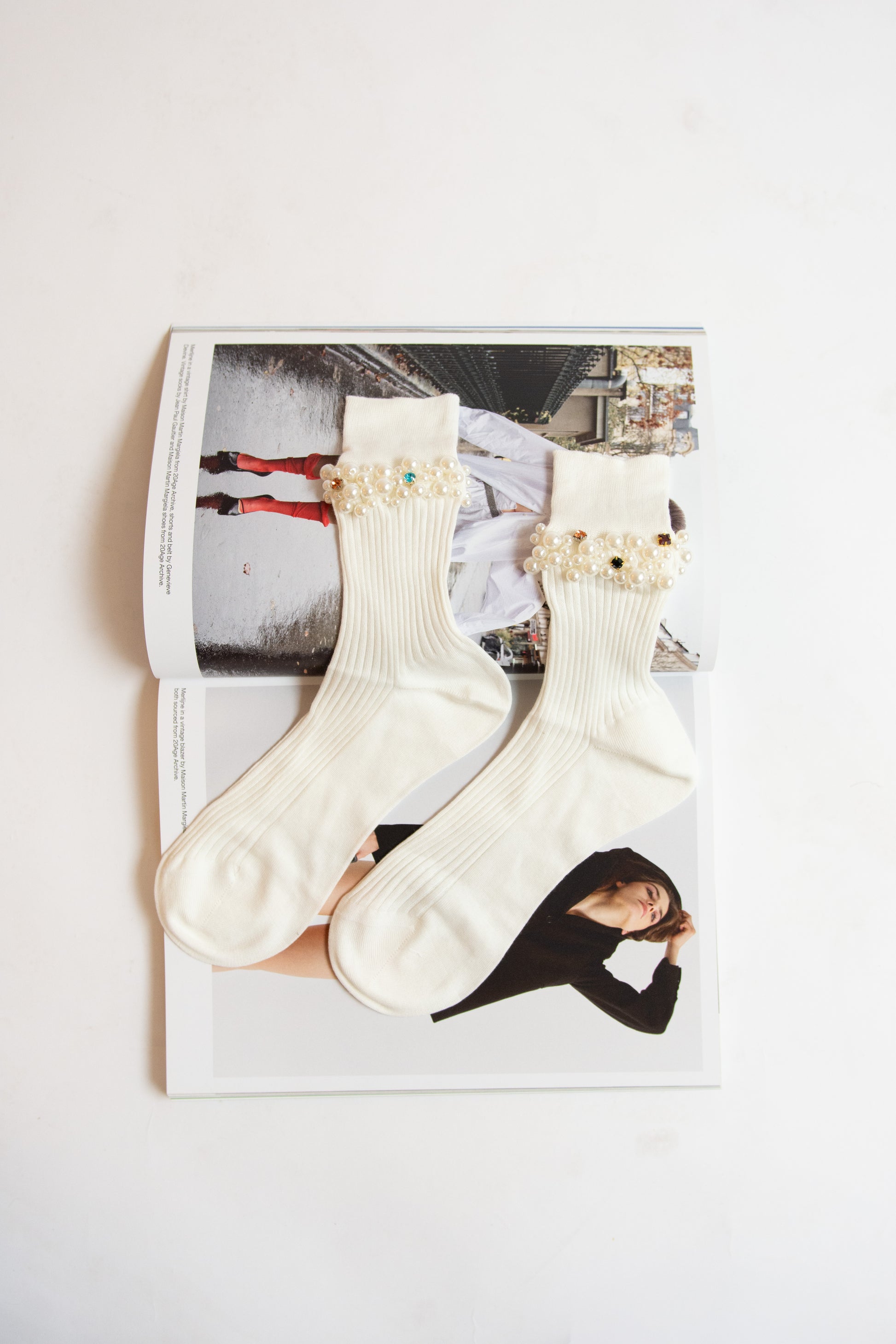 Ribbed cotton socks in Off White. Rhinestone and pearl beading trim around the ankle. The trim is a mix of mother-of-pearl beads and different colored rhinestones.