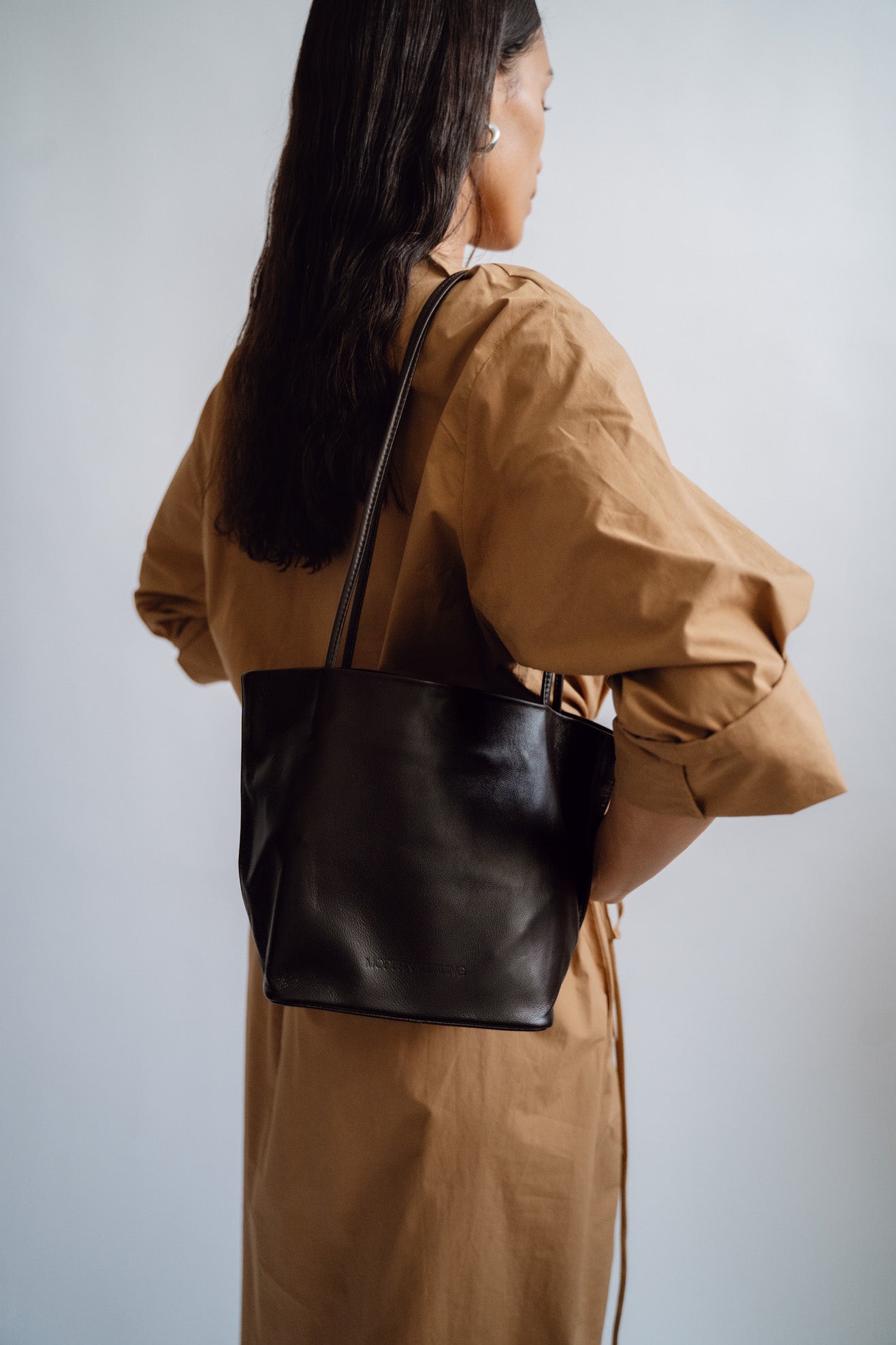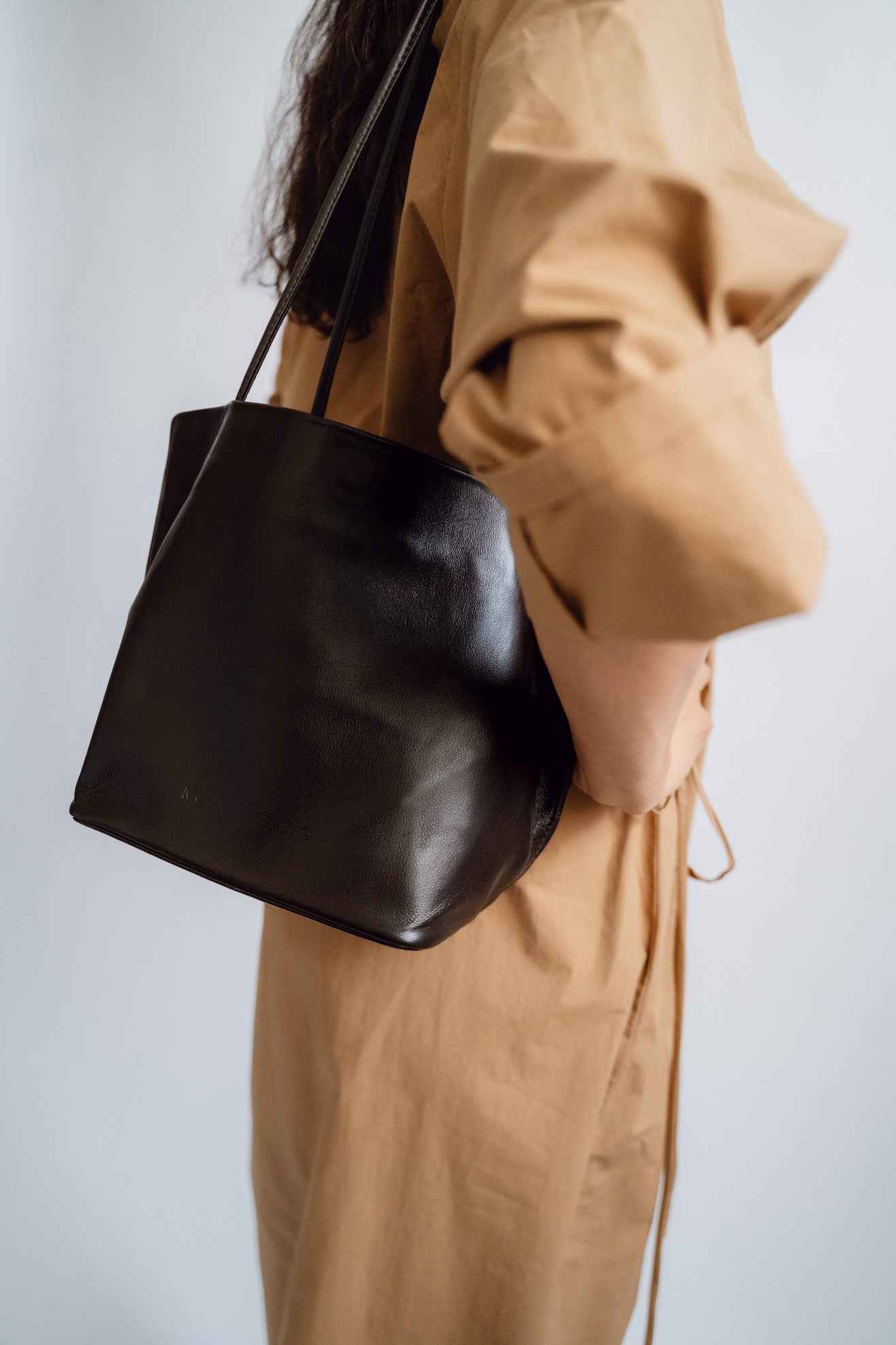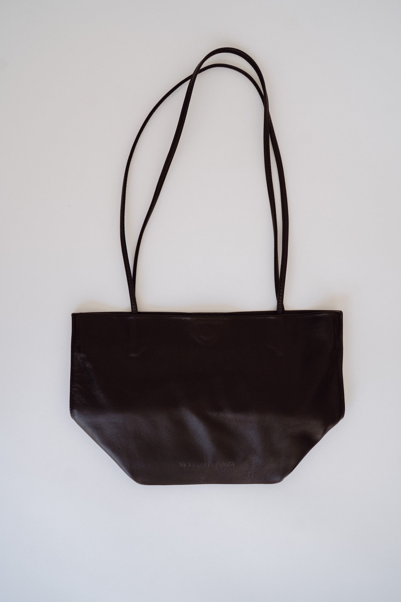 Small tote bag in dark brown leather. Unlined. Slim straps. Soft-structure with reinforced base. Magnetic closure. Embossed logo.