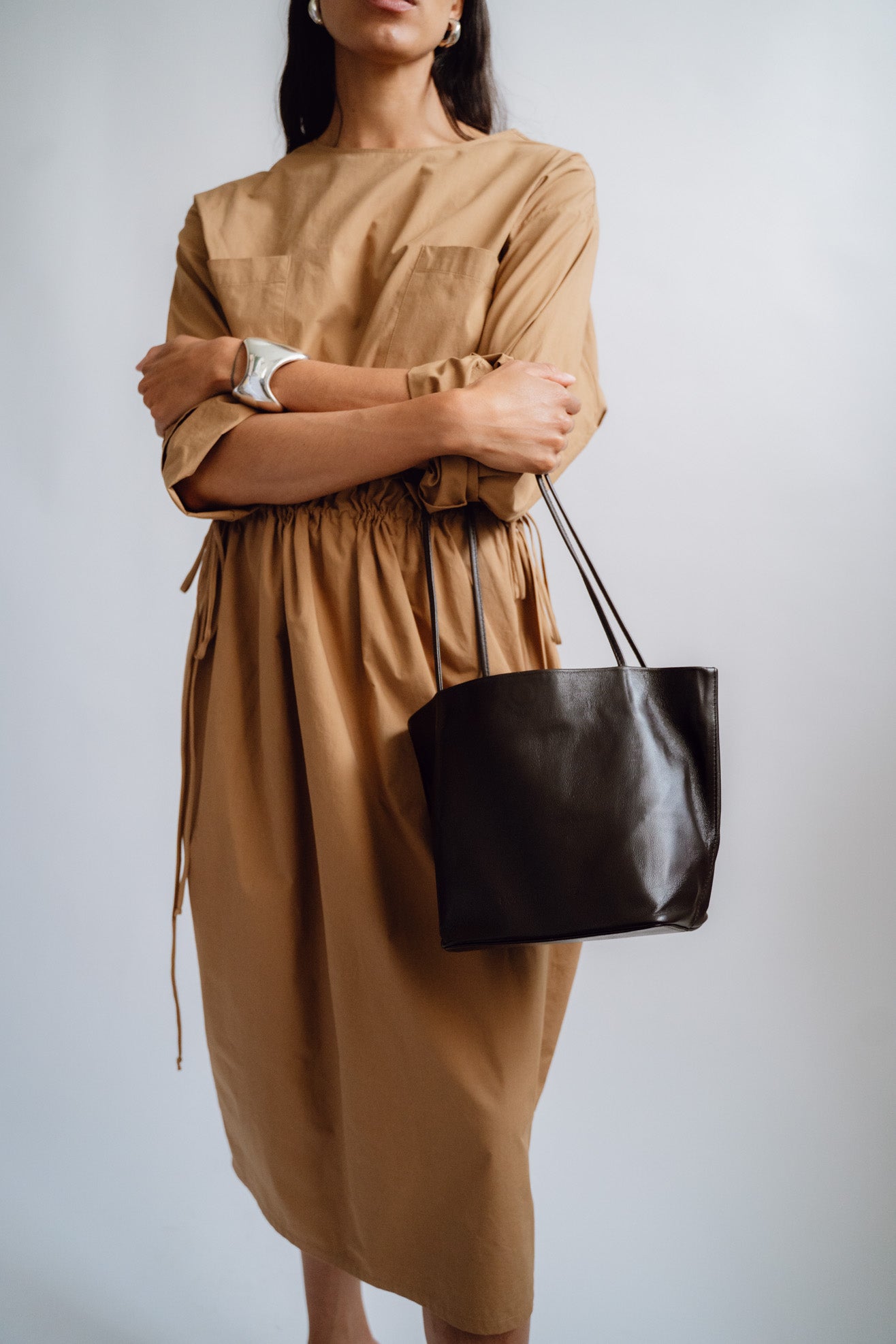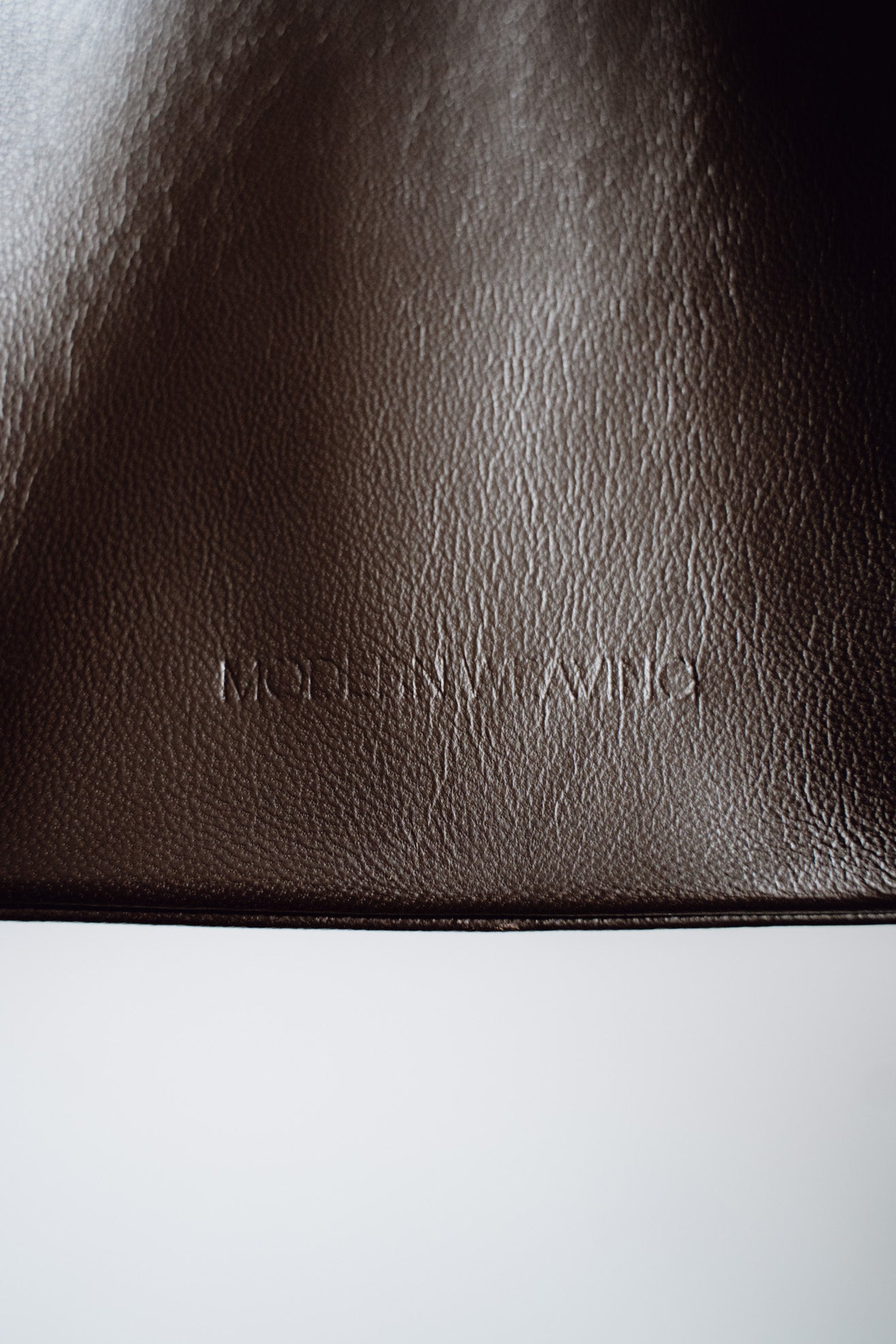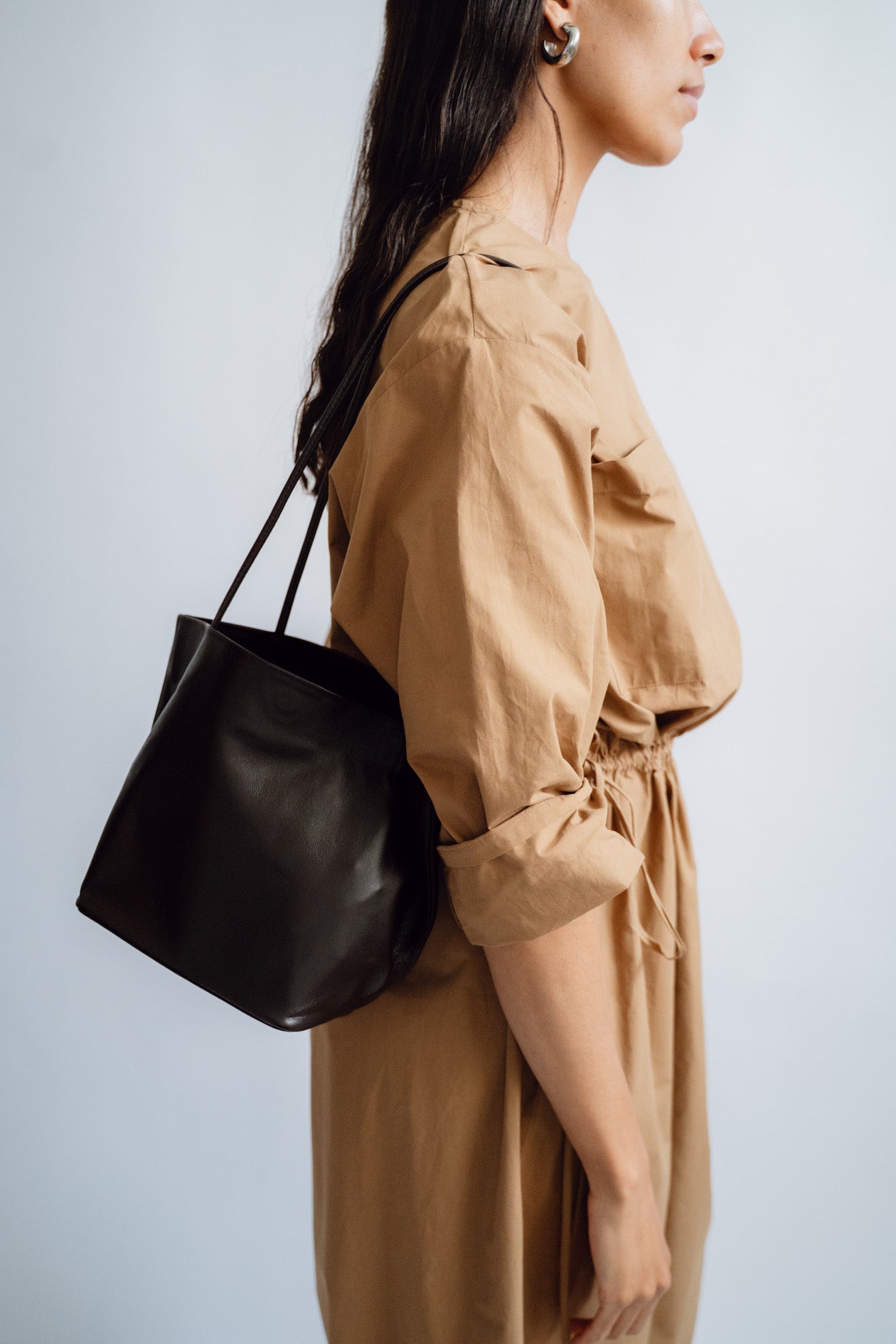 Small tote bag in dark brown leather. Unlined. Slim straps. Soft-structure with reinforced base. Magnetic closure. Embossed logo.