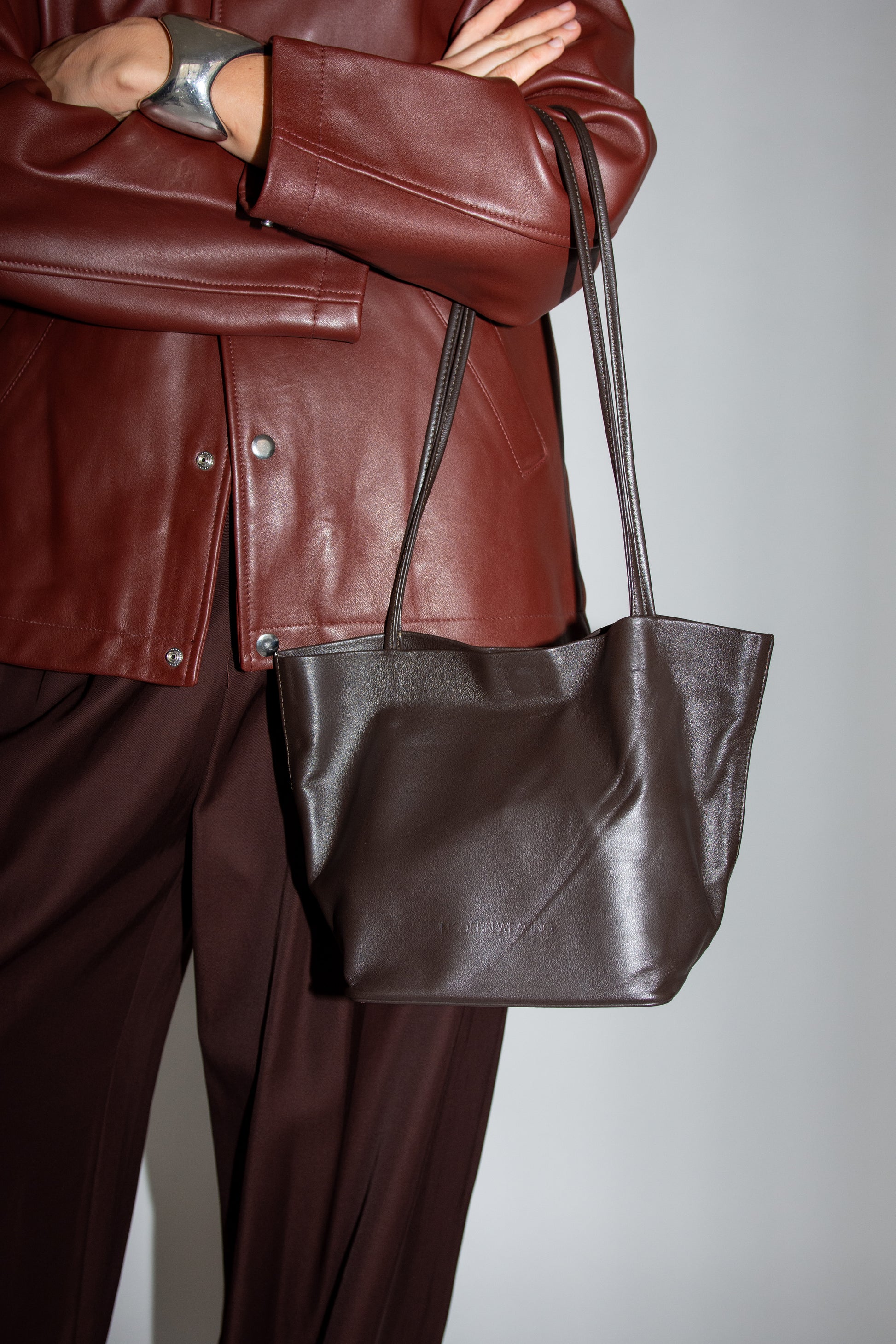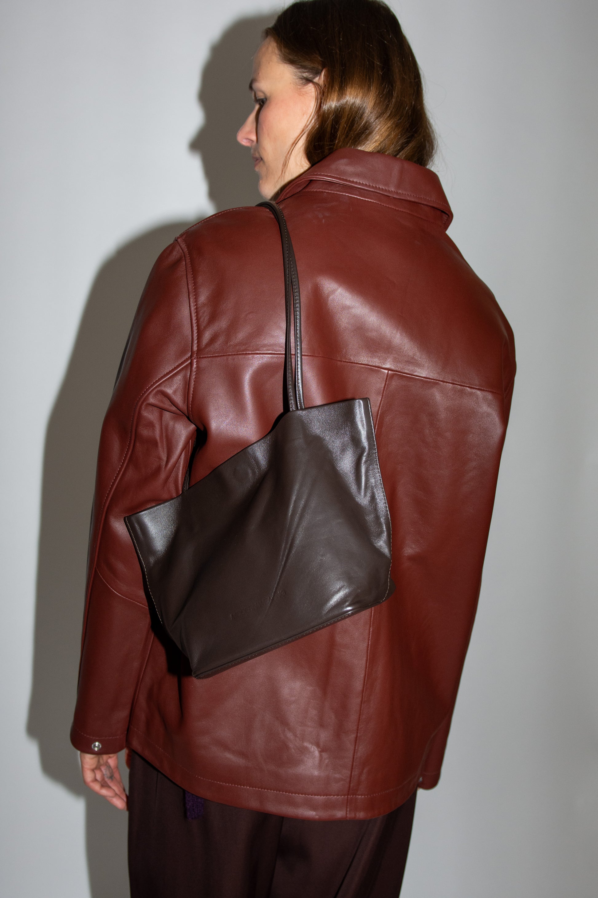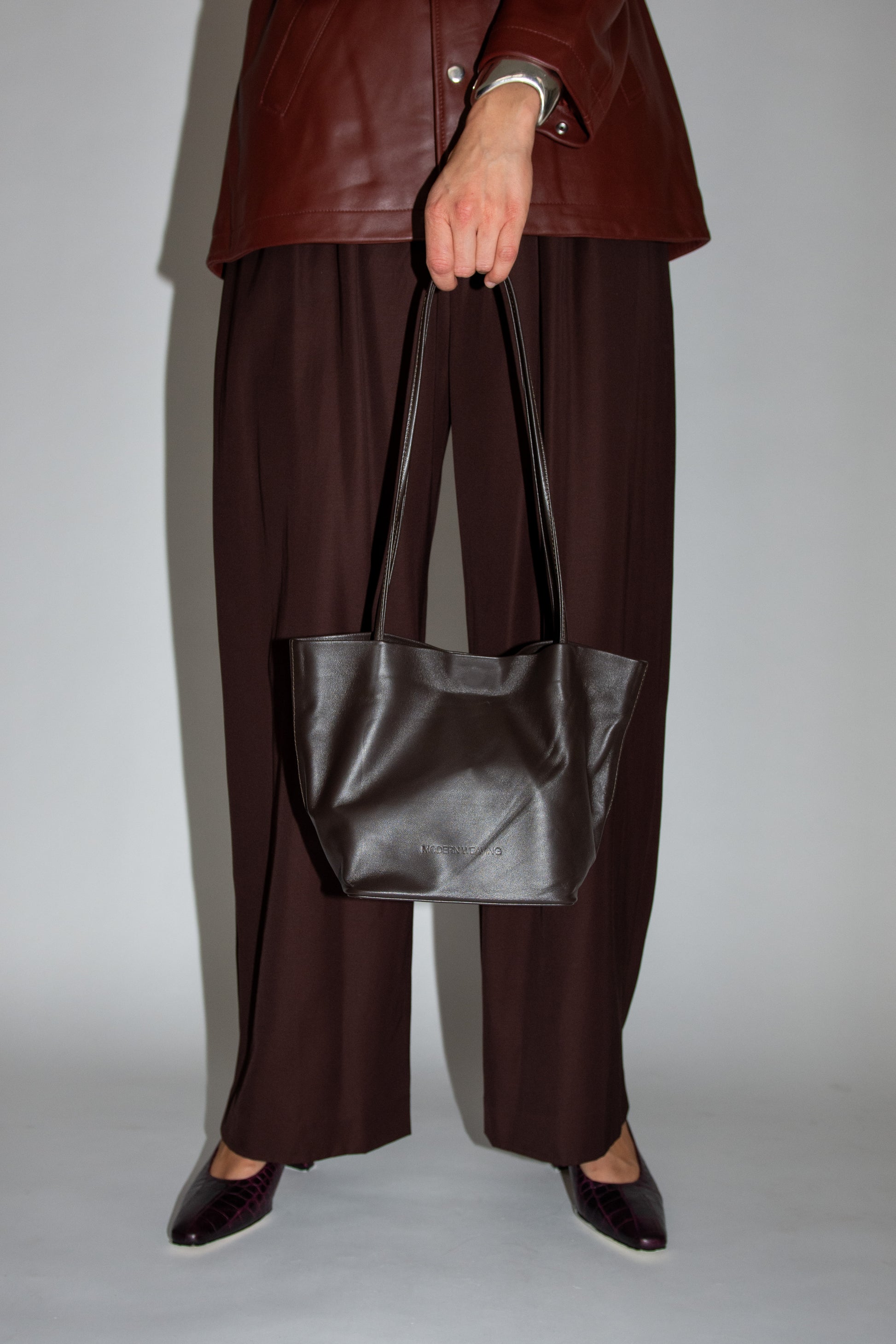 Small tote bag in dark Brown leather. Unlined. Slim straps. Soft-structure with reinforced base. Magnetic closure. Embossed logo.