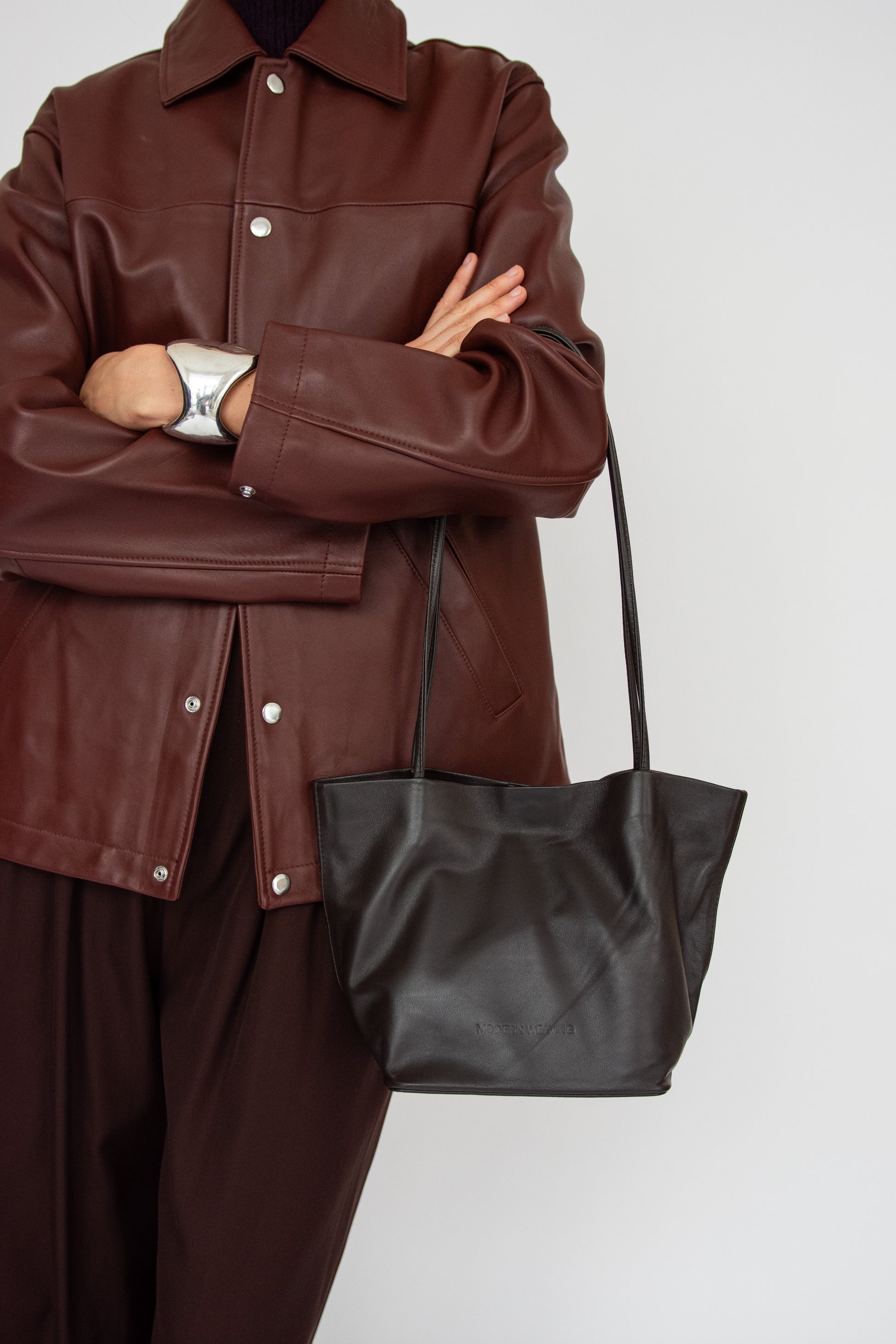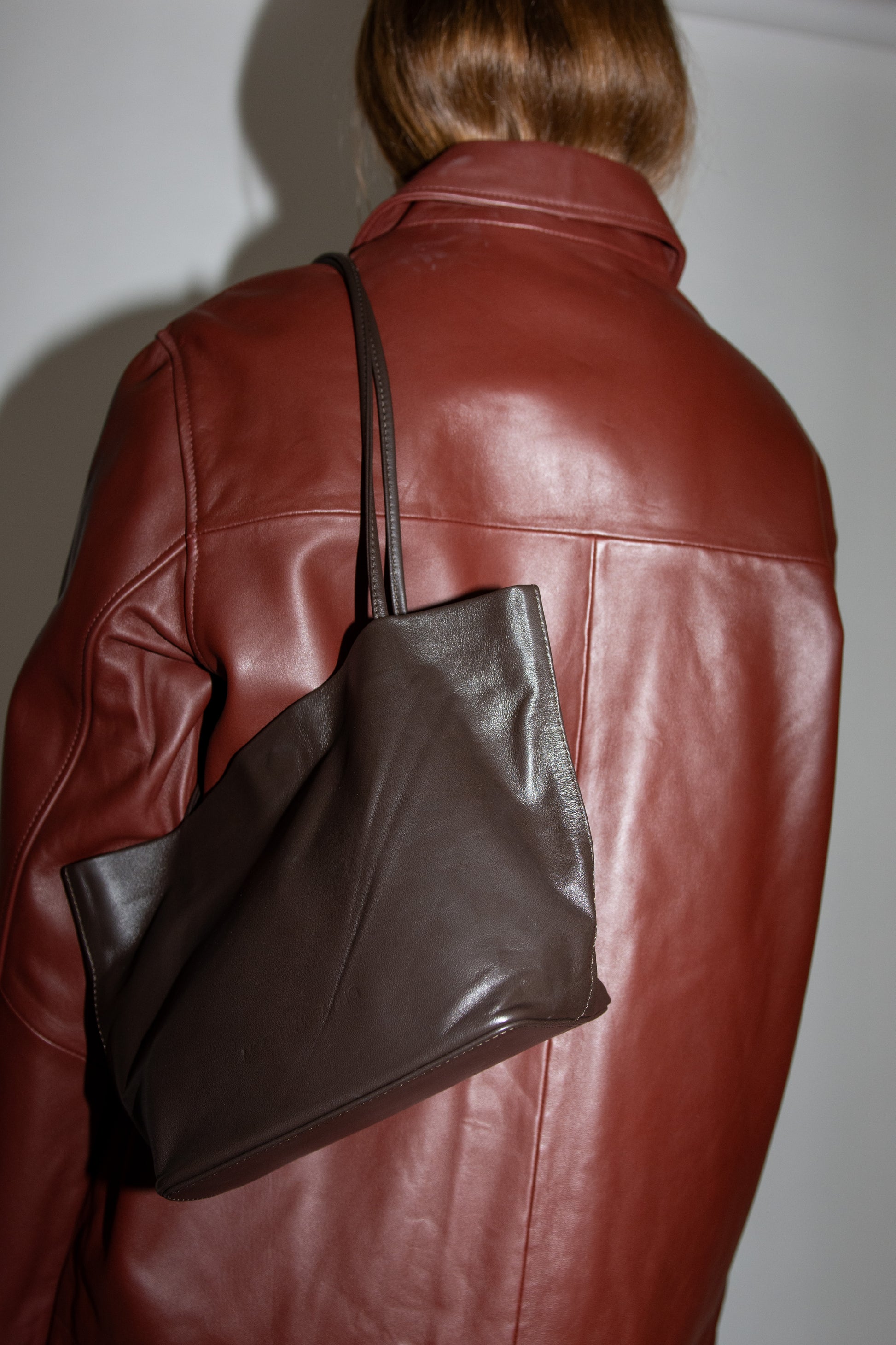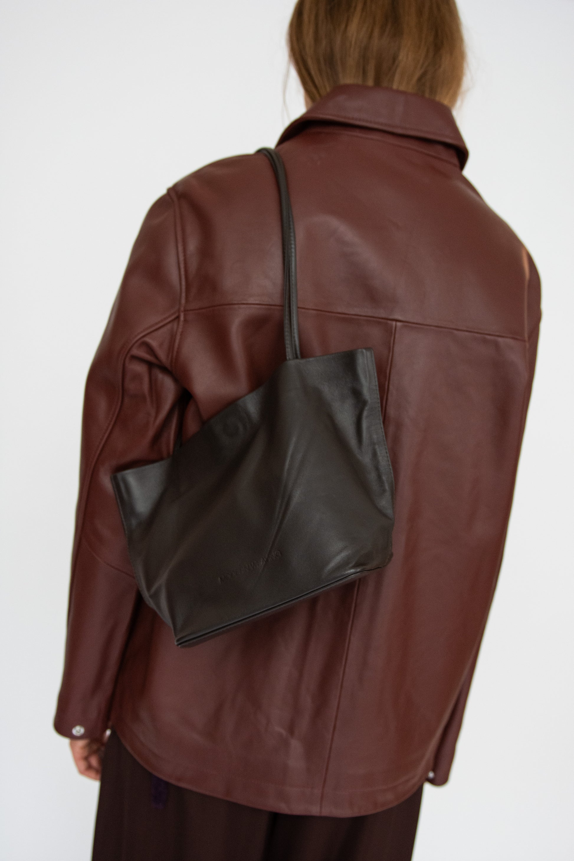 Small tote bag in dark Brown leather. Unlined. Slim straps. Soft-structure with reinforced base. Magnetic closure. Embossed logo.
