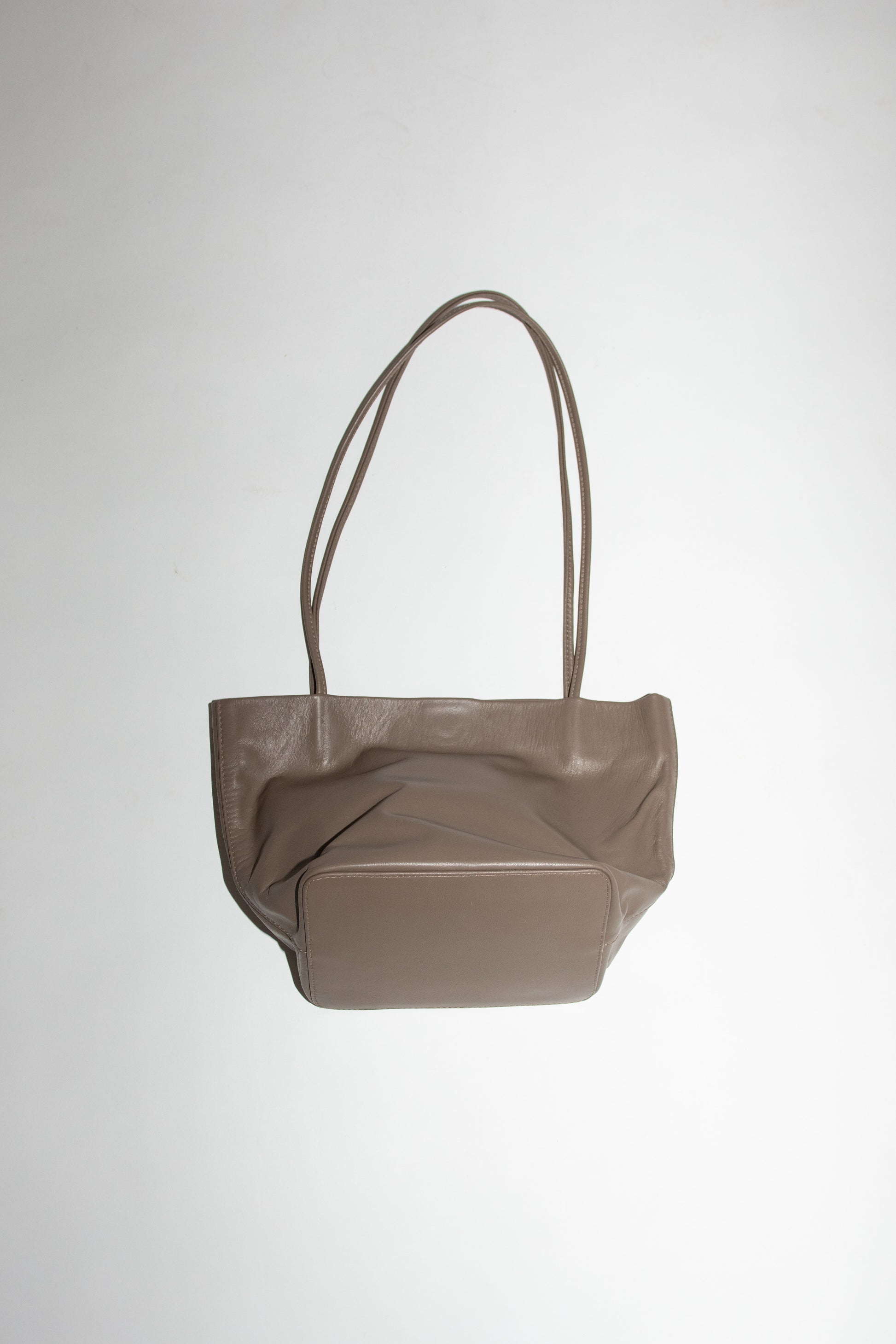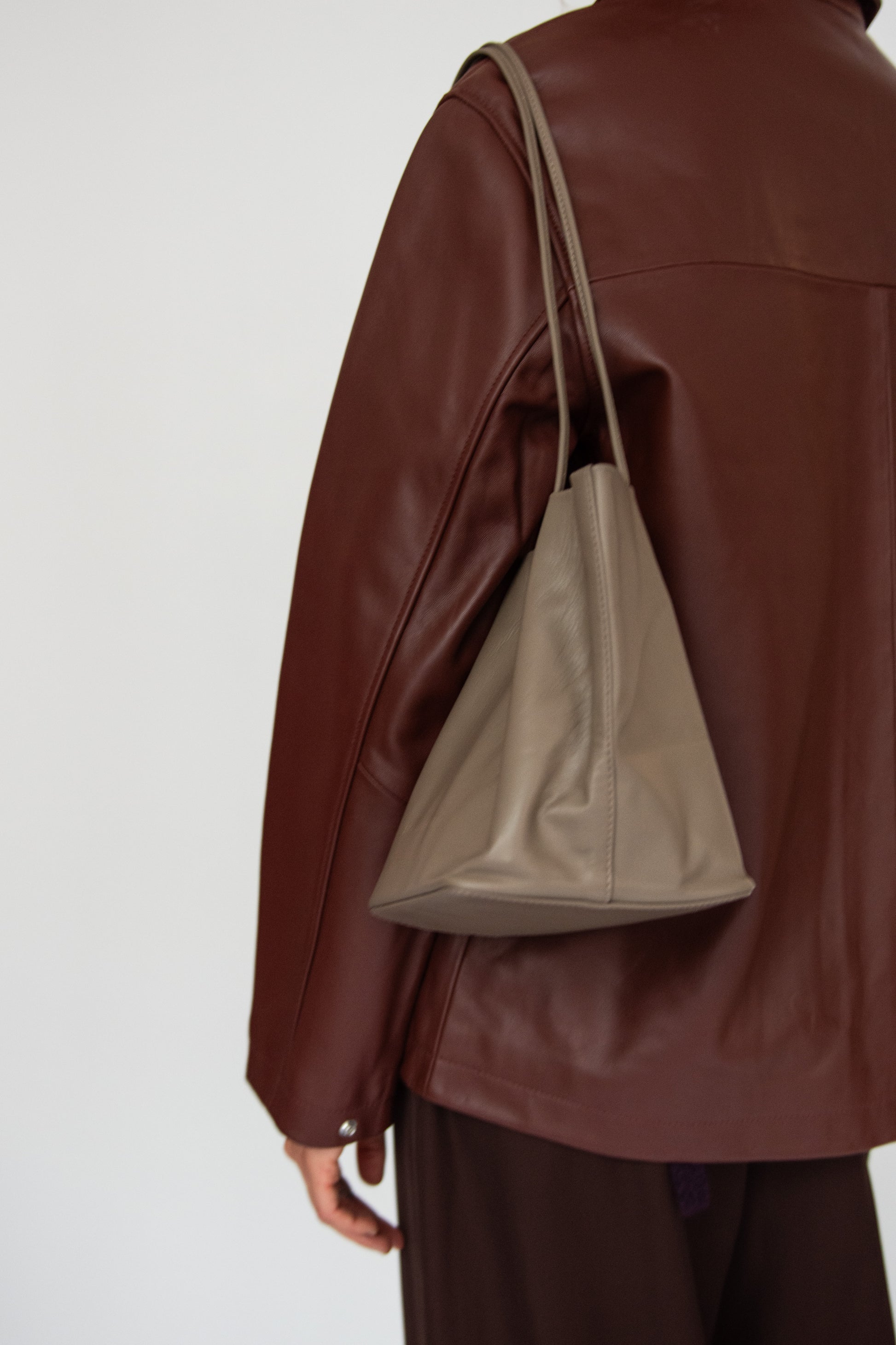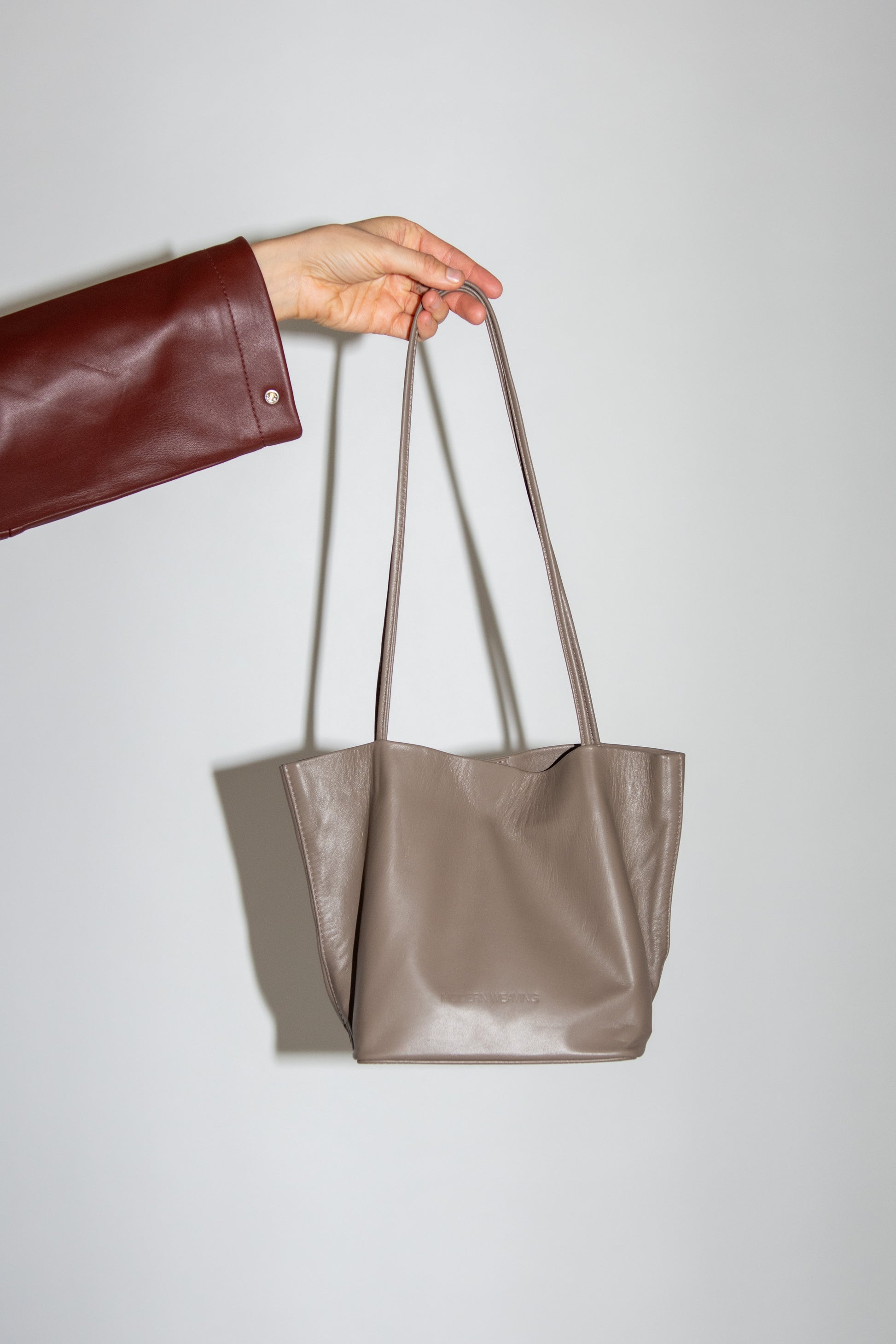 Small tote bag in earth leather. Unlined. Slim straps. Soft-structure with reinforced base. Magnetic closure. Embossed logo.