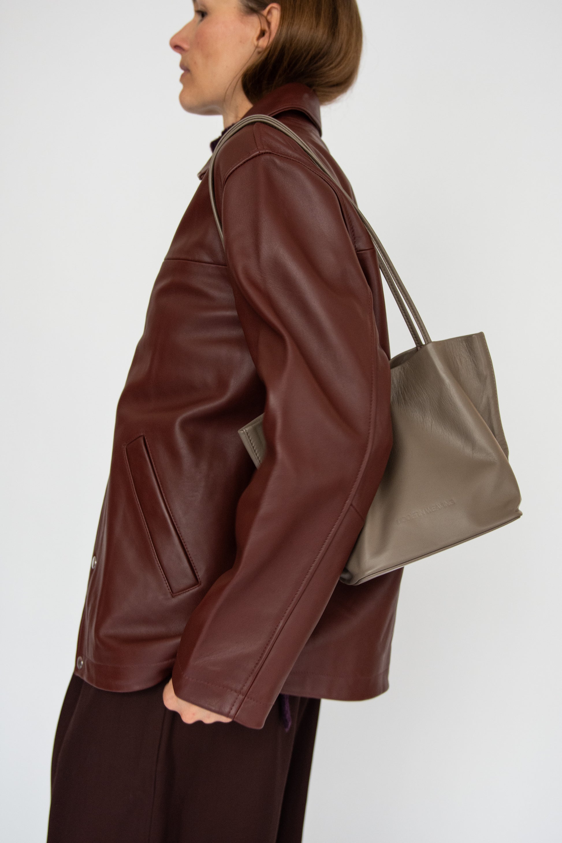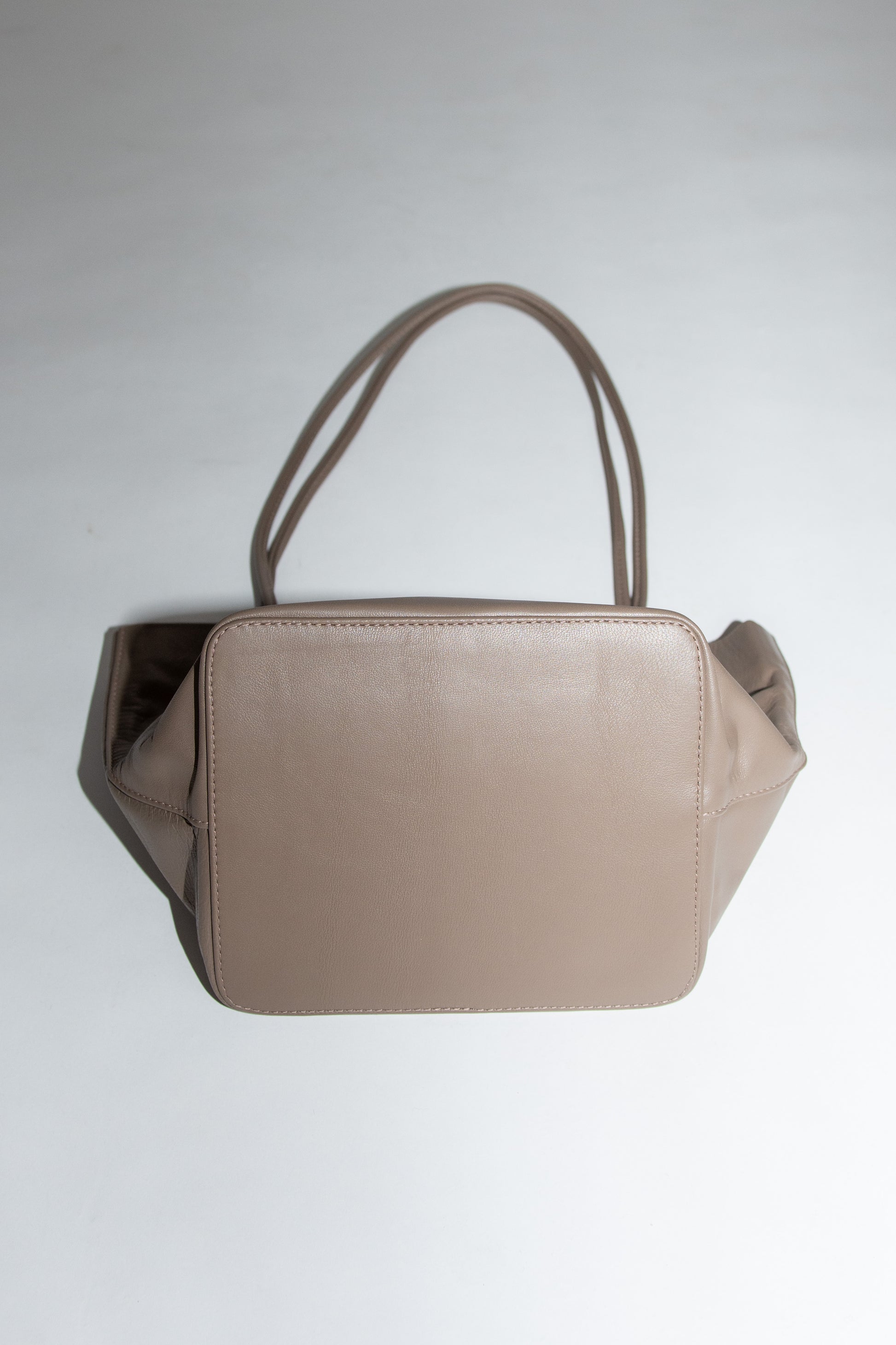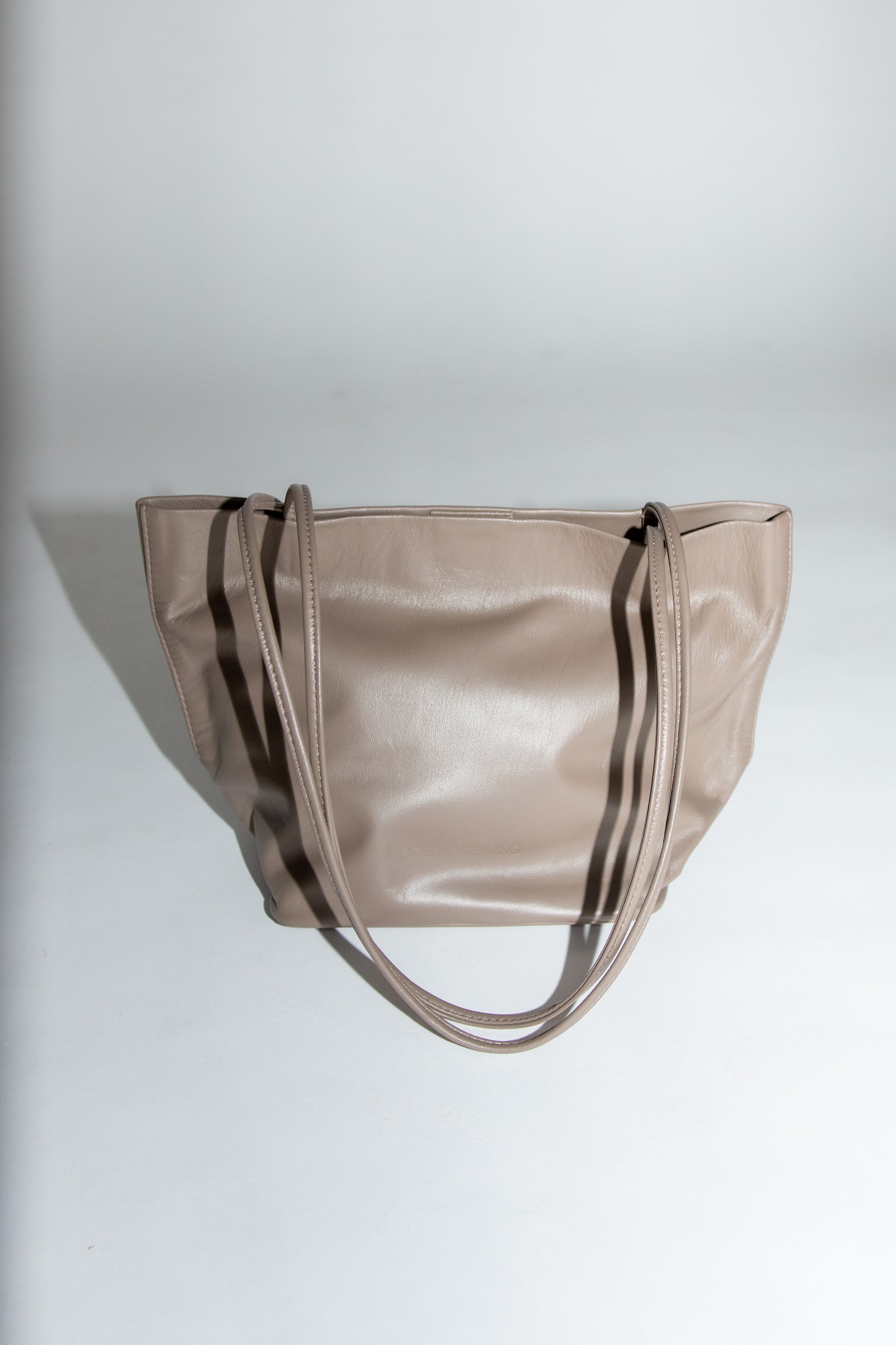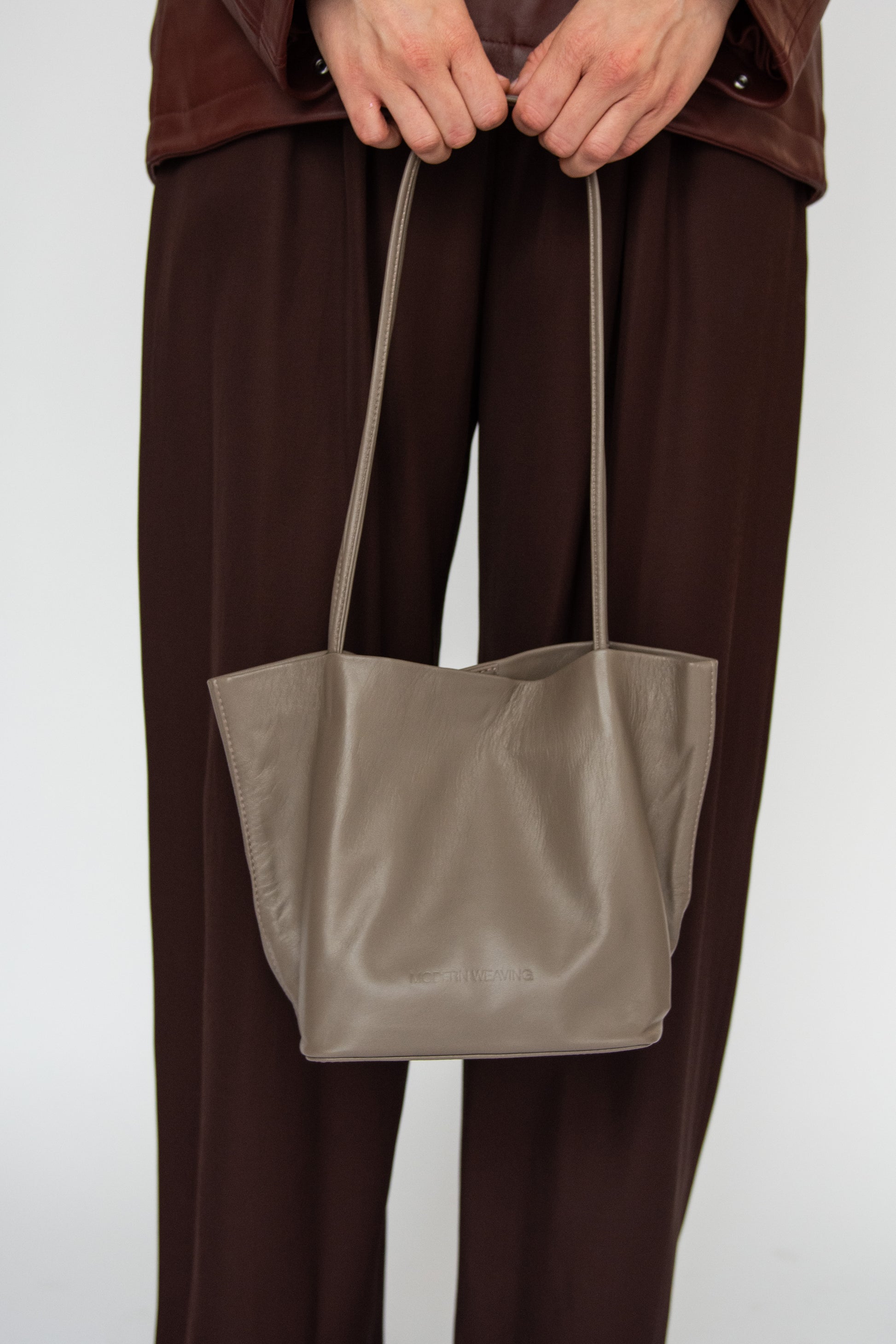 Small tote bag in earth leather. Unlined. Slim straps. Soft-structure with reinforced base. Magnetic closure. Embossed logo.