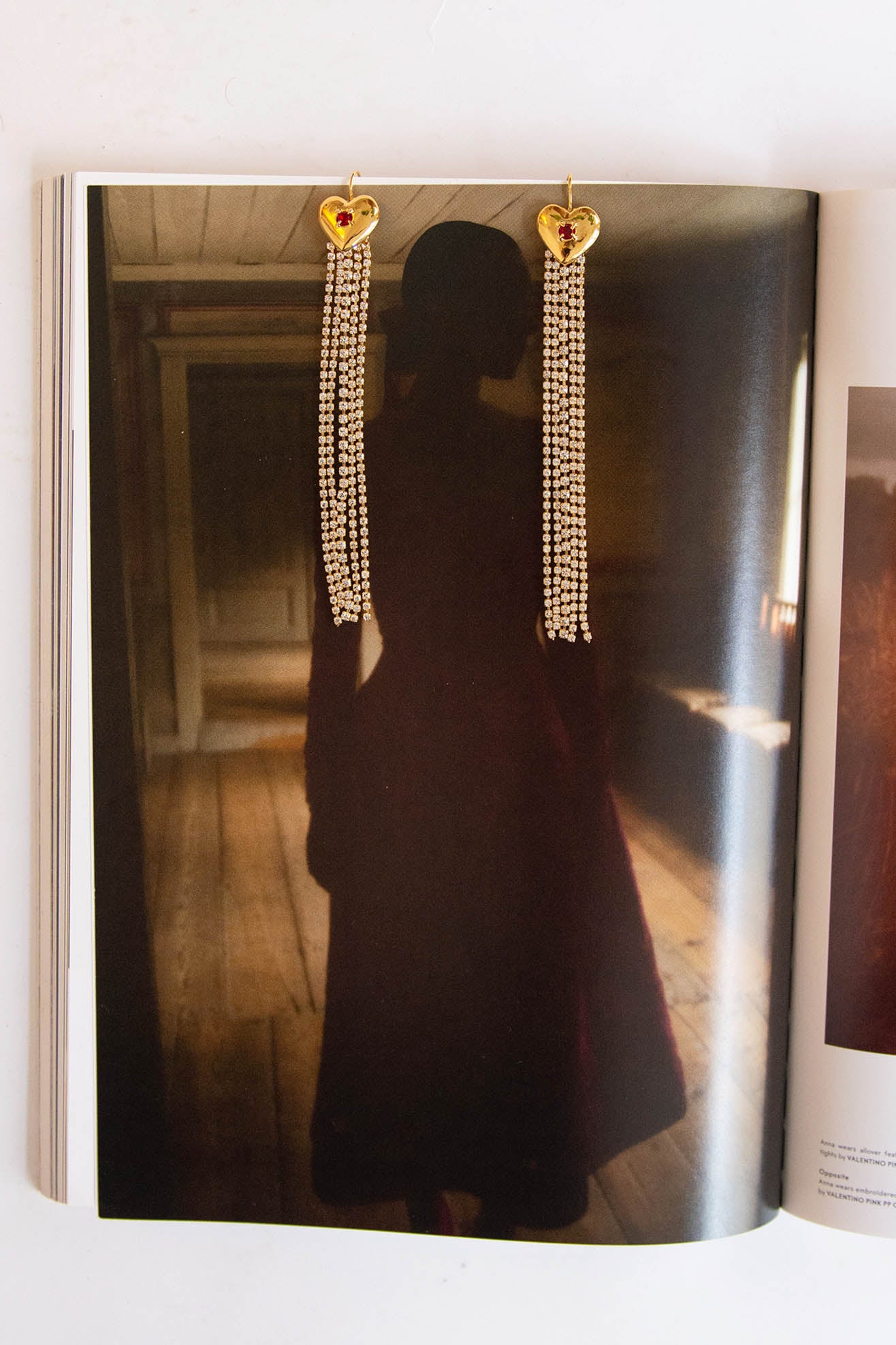 Drop earrings in 18k gold plated brass with glass stones and crystals. Crystal-cut detailing in red at heart. Sterling silver hook fastening.