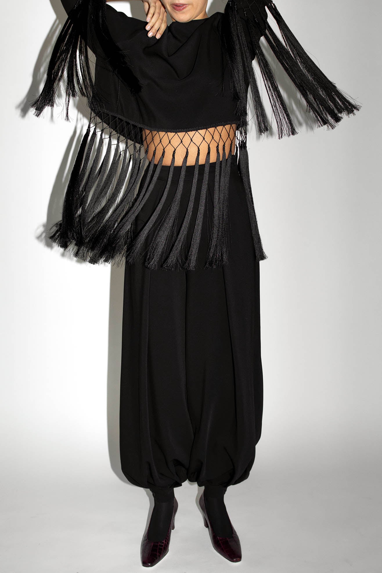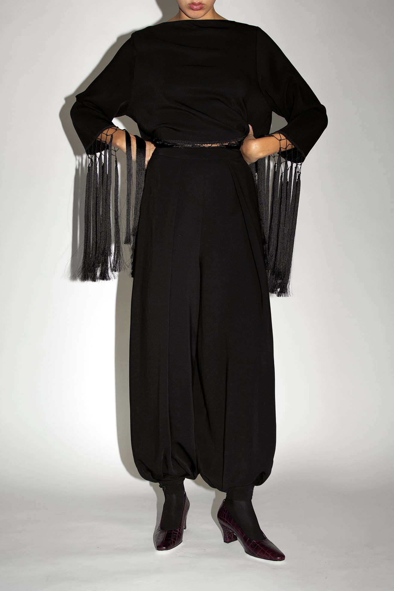 High waist harem pant in our Black FSC certified viscose flat crepe. Pleats at front and back waist. Side seam pockets. 2 fabric covered buttons at side waistband and invisible side seam zipper closure. Pleated balloon hem with band closure. Adjustable frog button closure at pant hem.