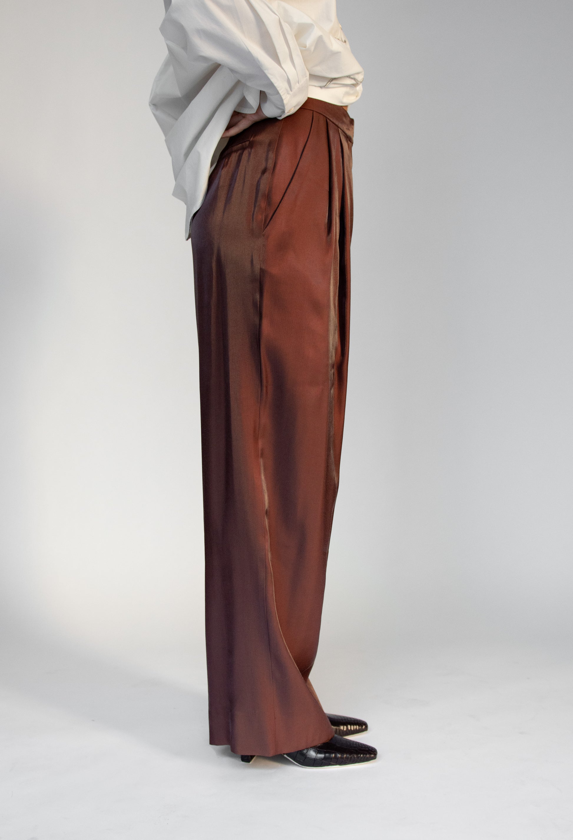 High waisted, pleat front pant with in a copper brown viscose blend sparkle satin. Long, wide leg pant with zip fly closure. Slant front pockets. Back welt pocket. Unlined.