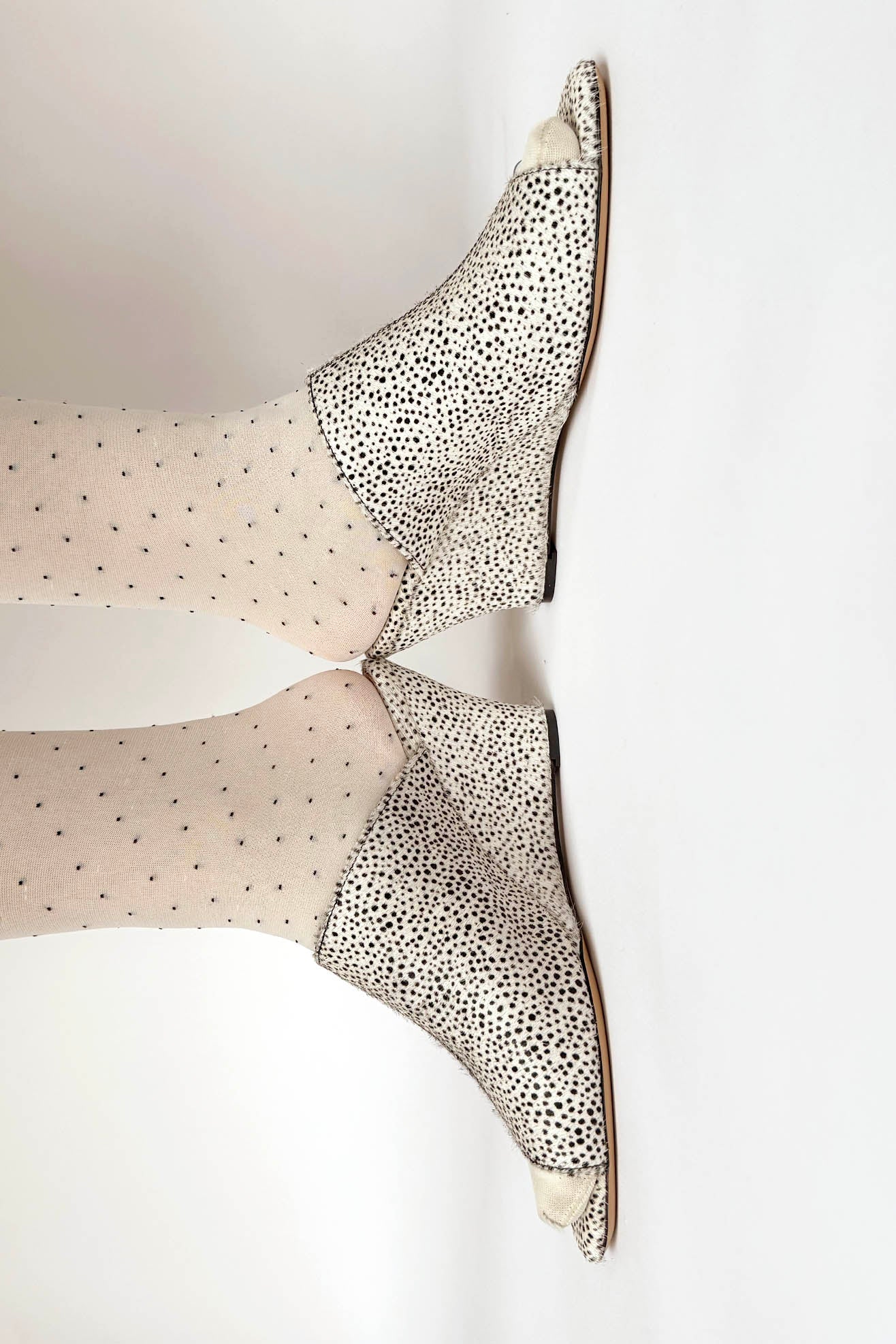 Wedge heel mules in small cheetah ponyhair calf leather. Split upper with transparent PVC and spotted ponyhair calf leather. Seaming detail at front. Pointed almond toe. Slips on to be worn. Leather lined sole and heel.