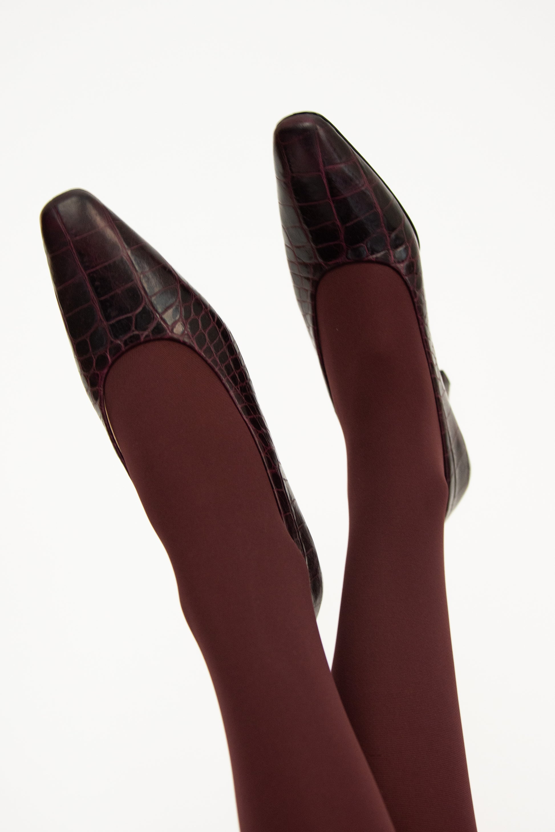 Almond-square toe, low heel pump in Bordeaux chrome-free, croc embossed leather. Leather covered square flared heel. Slips on to be worn. Fully lined. Capped heel.