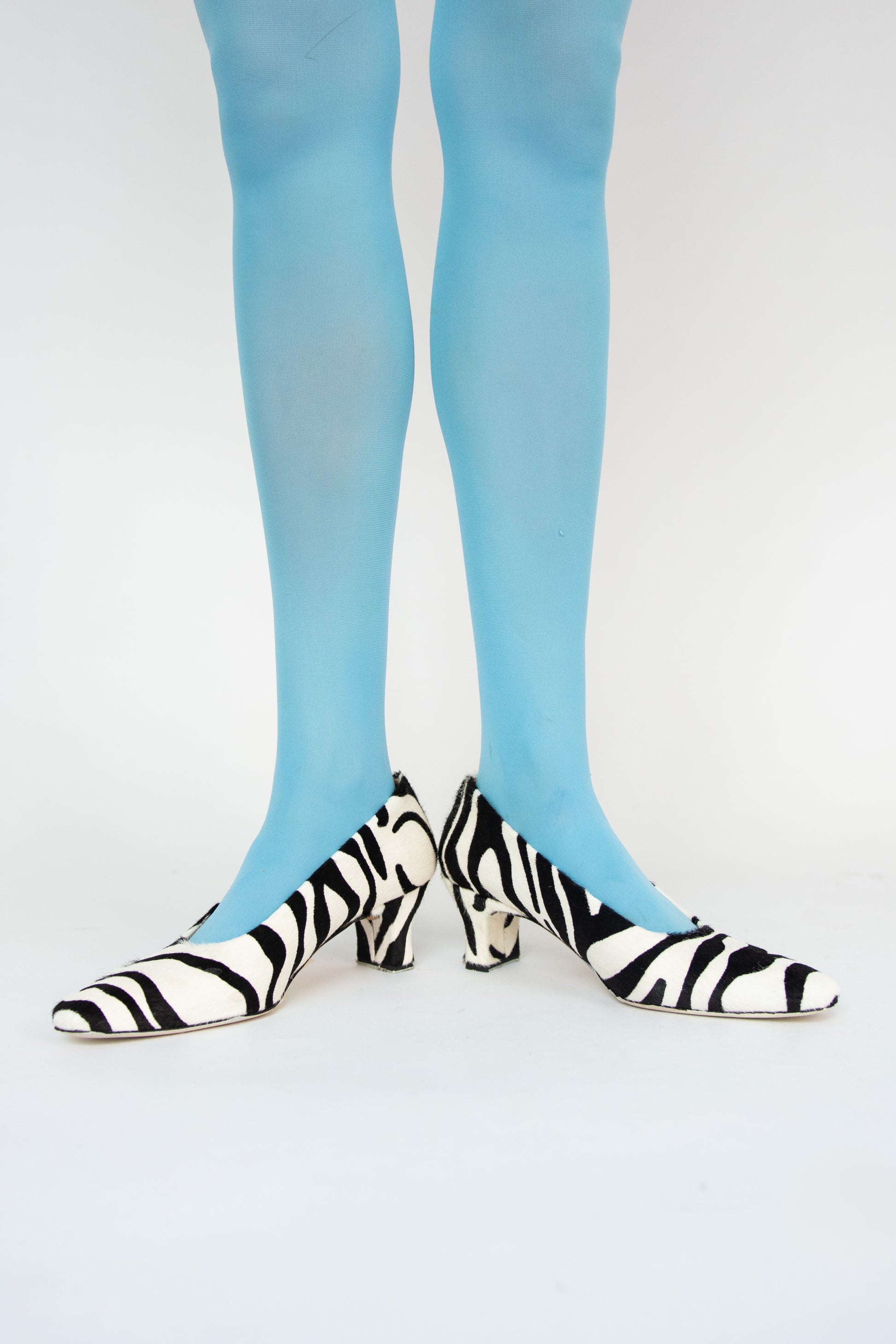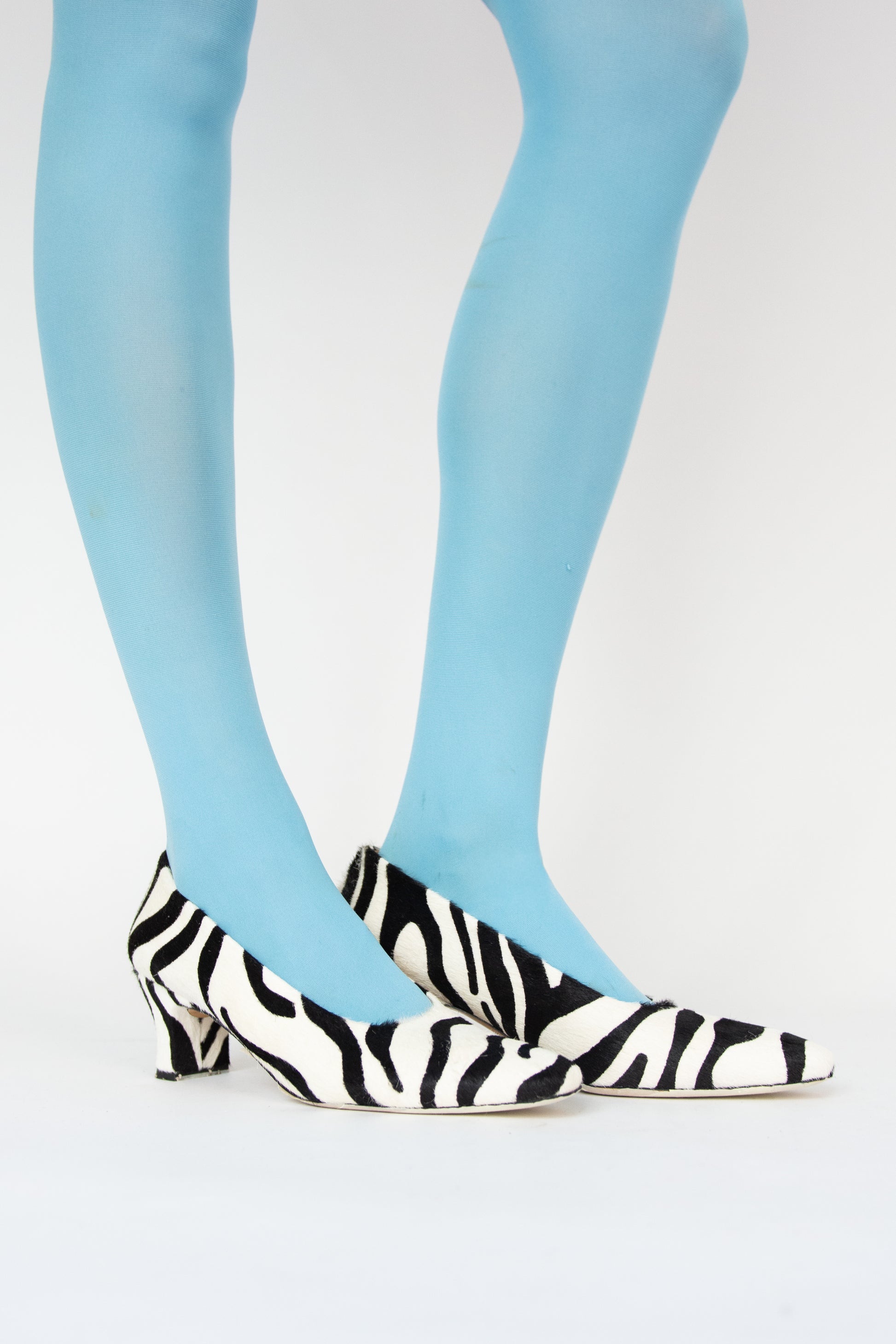 Almond-square toe, low heel pump in a large zebra printed, chrome-free, ponyhair calf leather. Ponyhair covered square flared heel. Slips on to be worn. Fully lined. Capped heel.