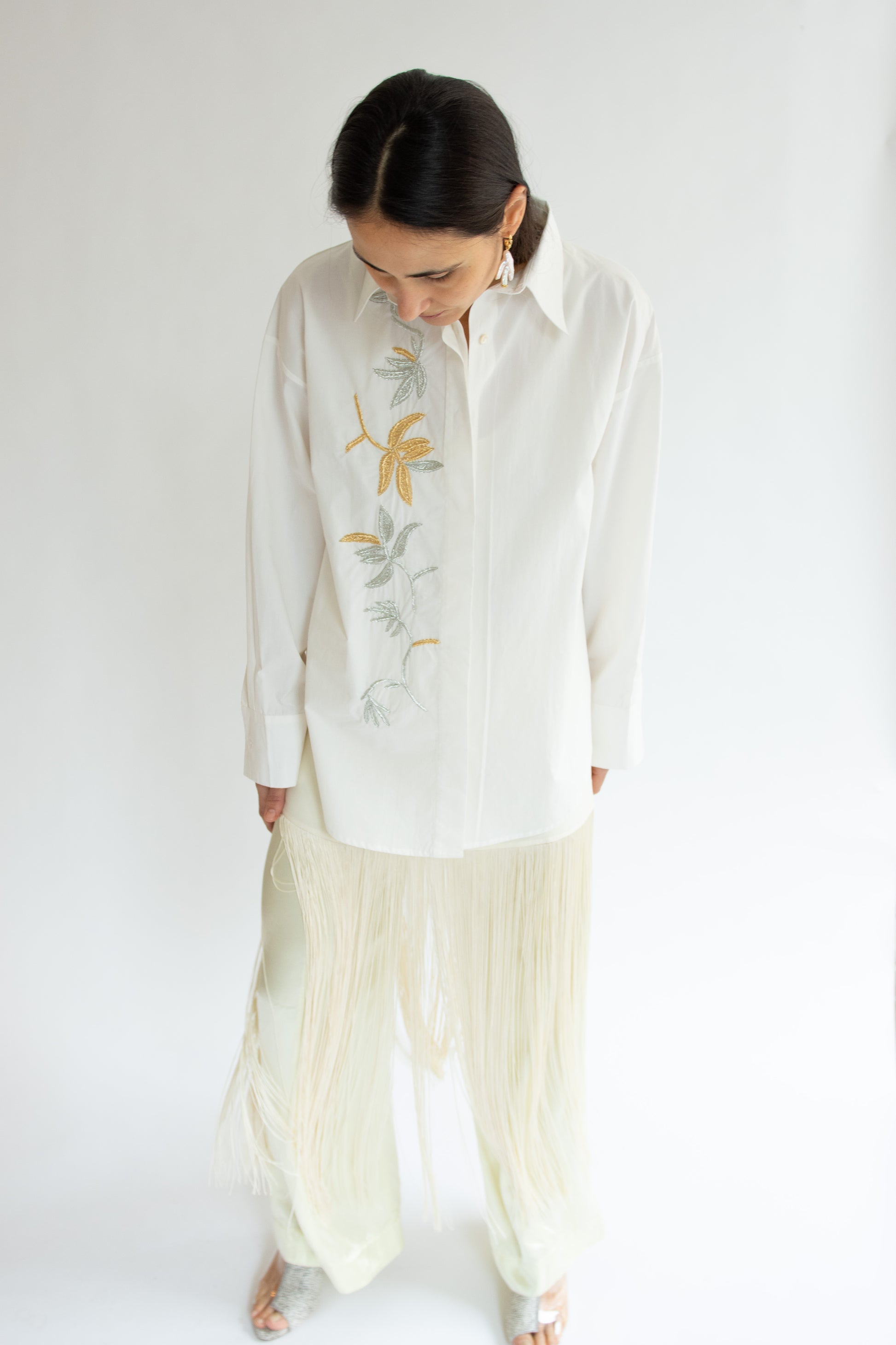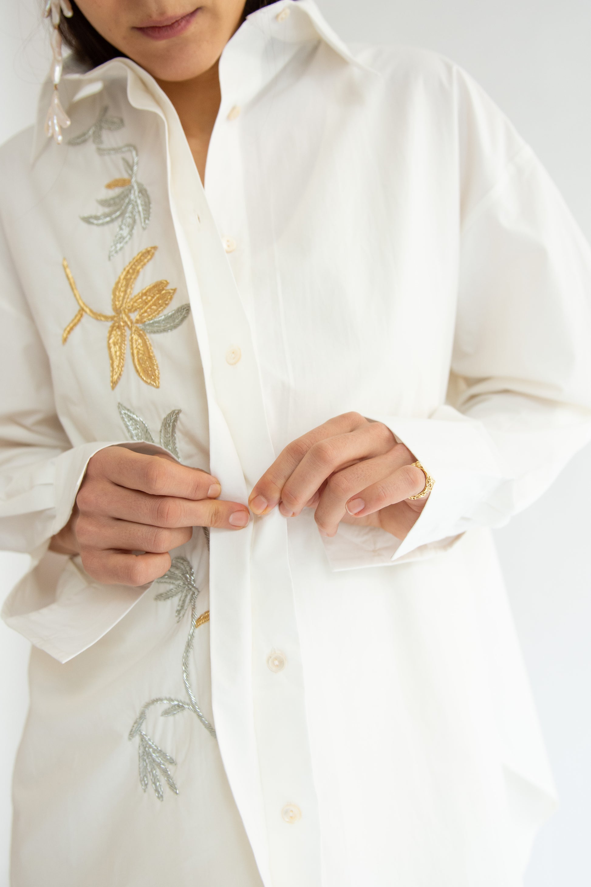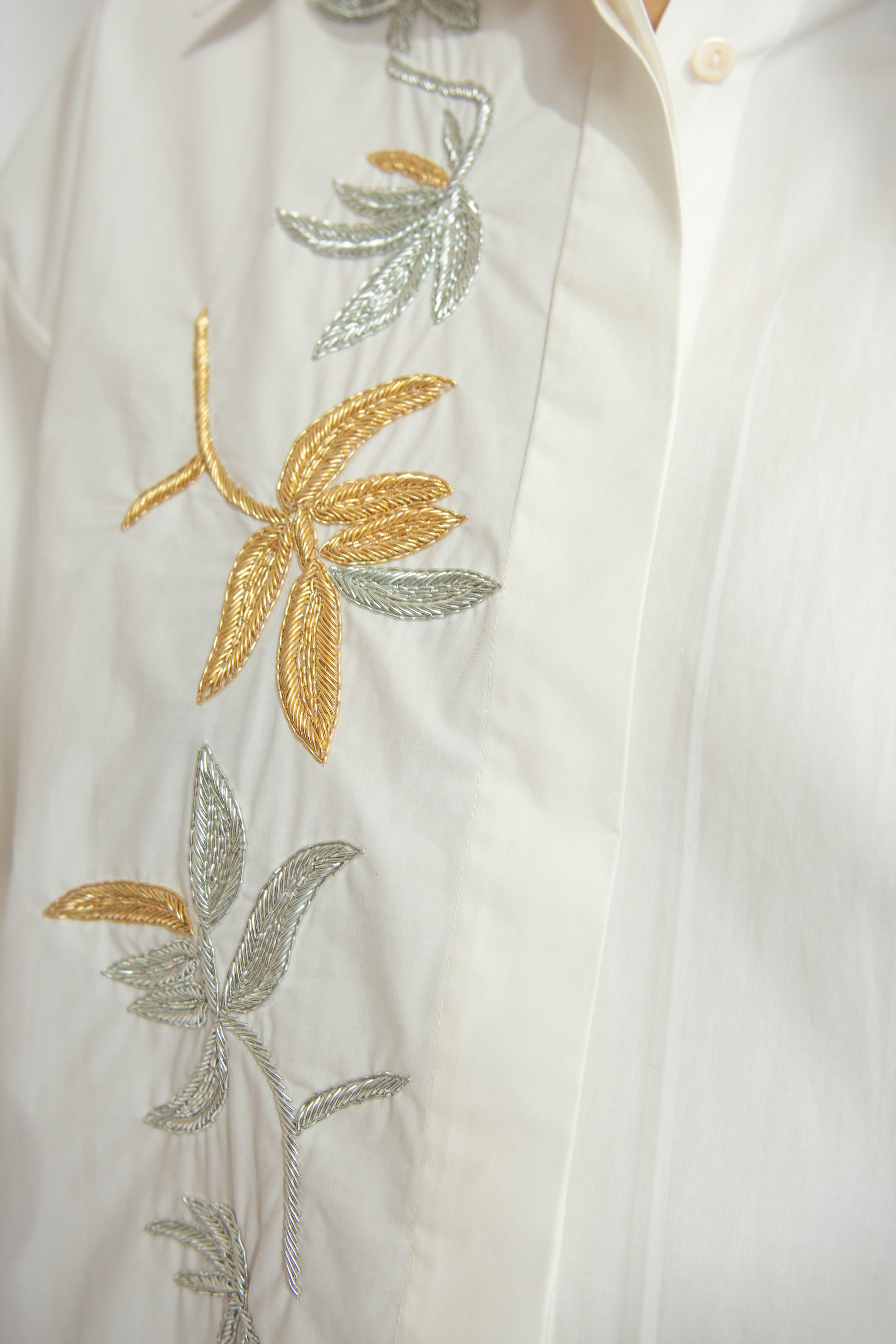 Menswear-inspired collared shirt in crisp BCI cotton poplin with tambour hooked hand embroidered floral design in silver and gold mylar threads along the front. Classic collar. Hidden front placket with button front. Curved hem. Buttoned cuffs.