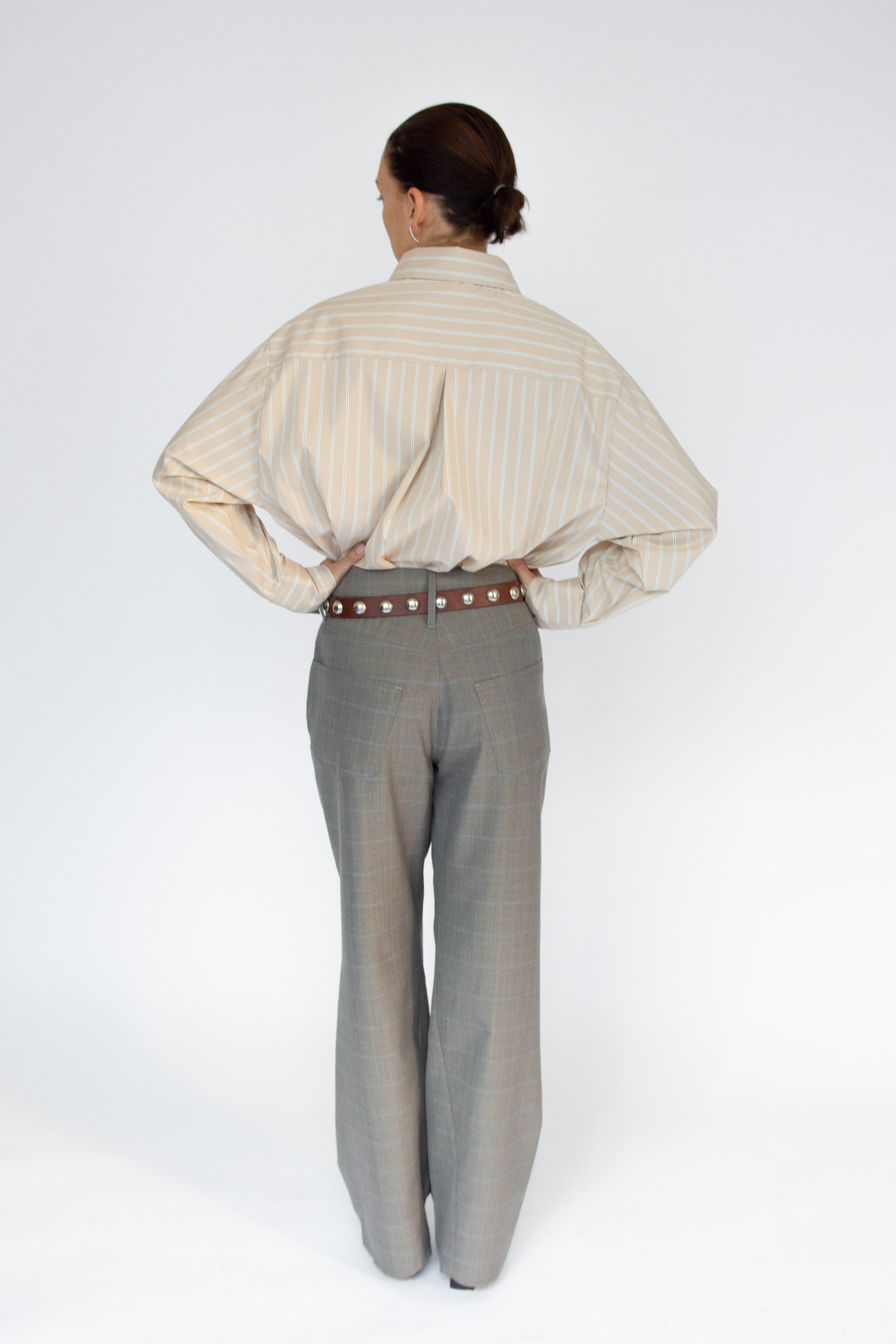Menswear-inspired collared shirt with front chest welt pockets in tan and white striped cotton poplin. Classic point collar. Mother of pearl logo buttons. Curved hem. Buttoned cuffs.