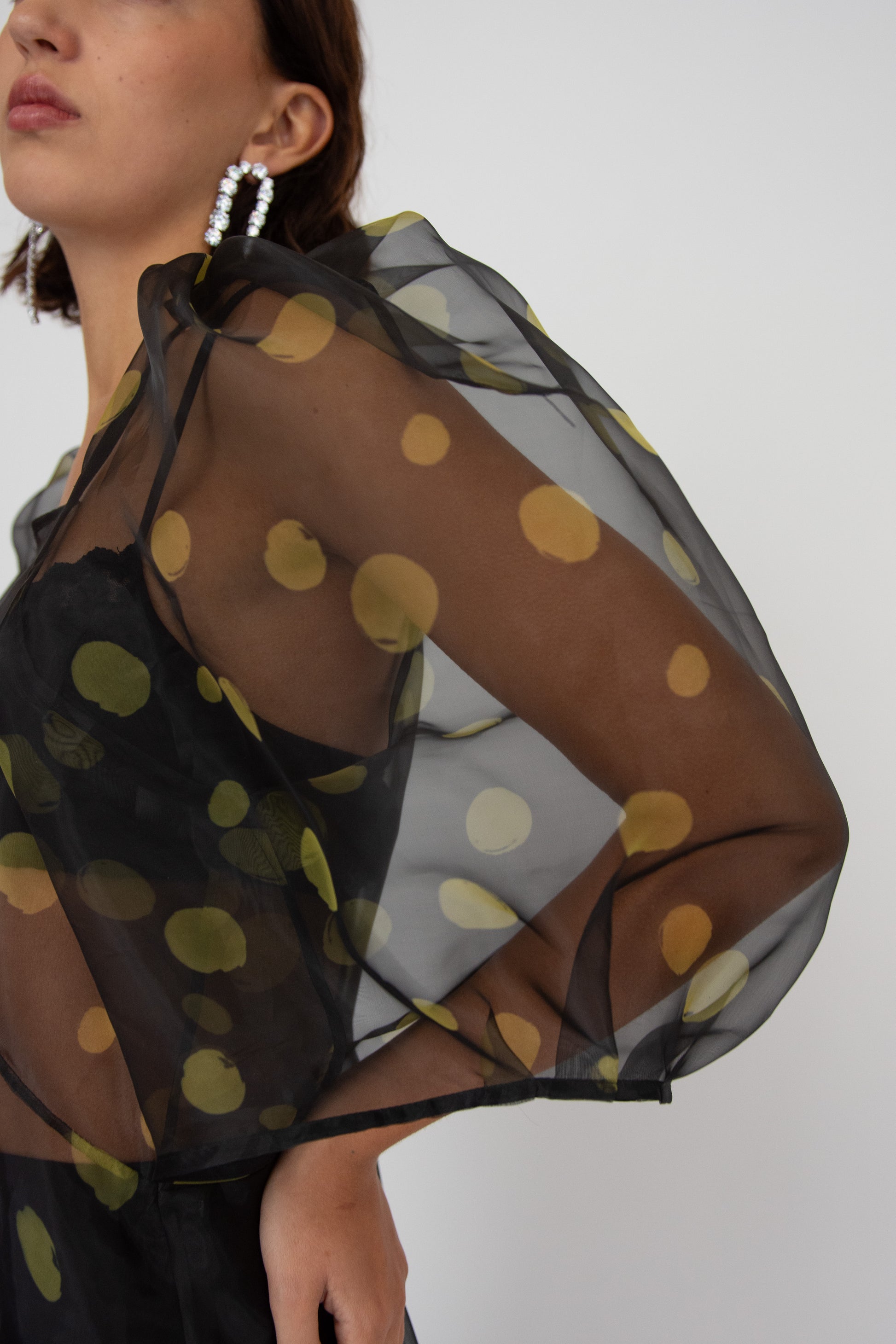 Voluminous dress with draped sculptural sleeves in black organza, with green transparent dot print. Squared neckline. Curved seam detailing at sleeves, waist and skirt. Center back invisible zipper. Unlined.
