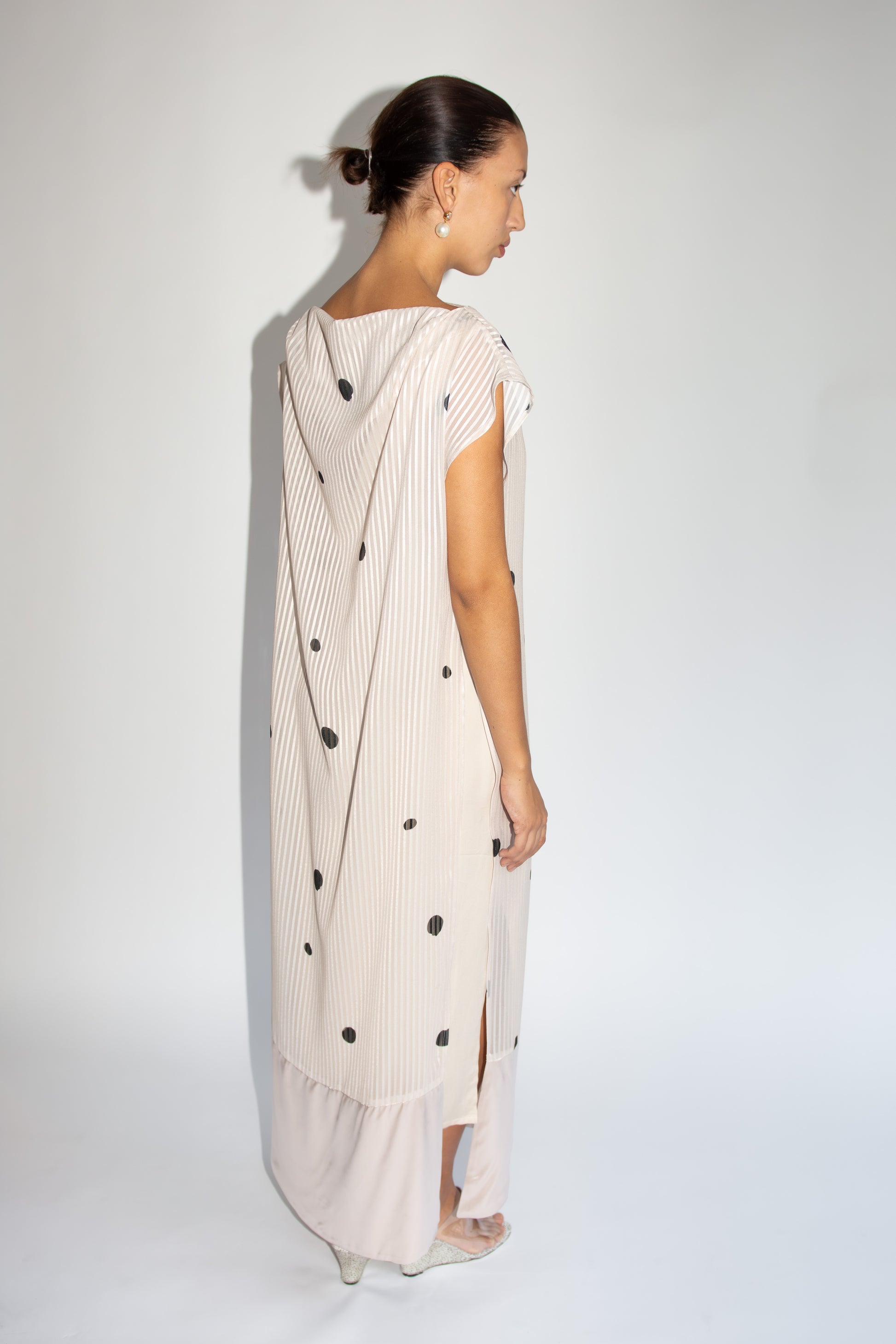 Long dress with cowl neck in our space dot printed, burnout stripe organza with contrast satin hem. Shirt dolman sleeves. High side slit at right side. Fully lined. Side seam invisible zipper closure at underdress. Available with or without matching scarf.