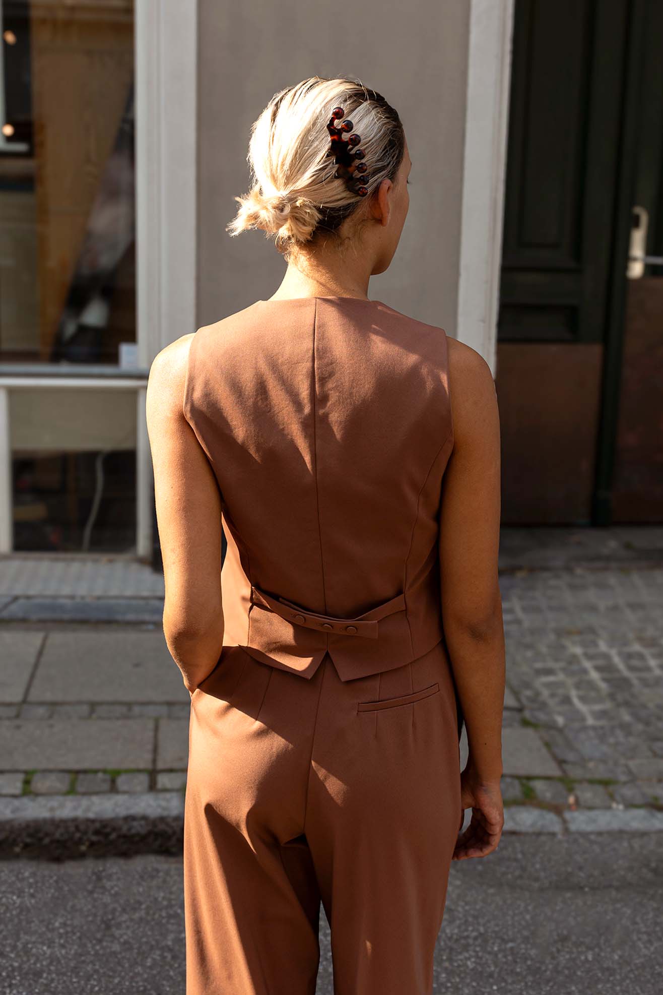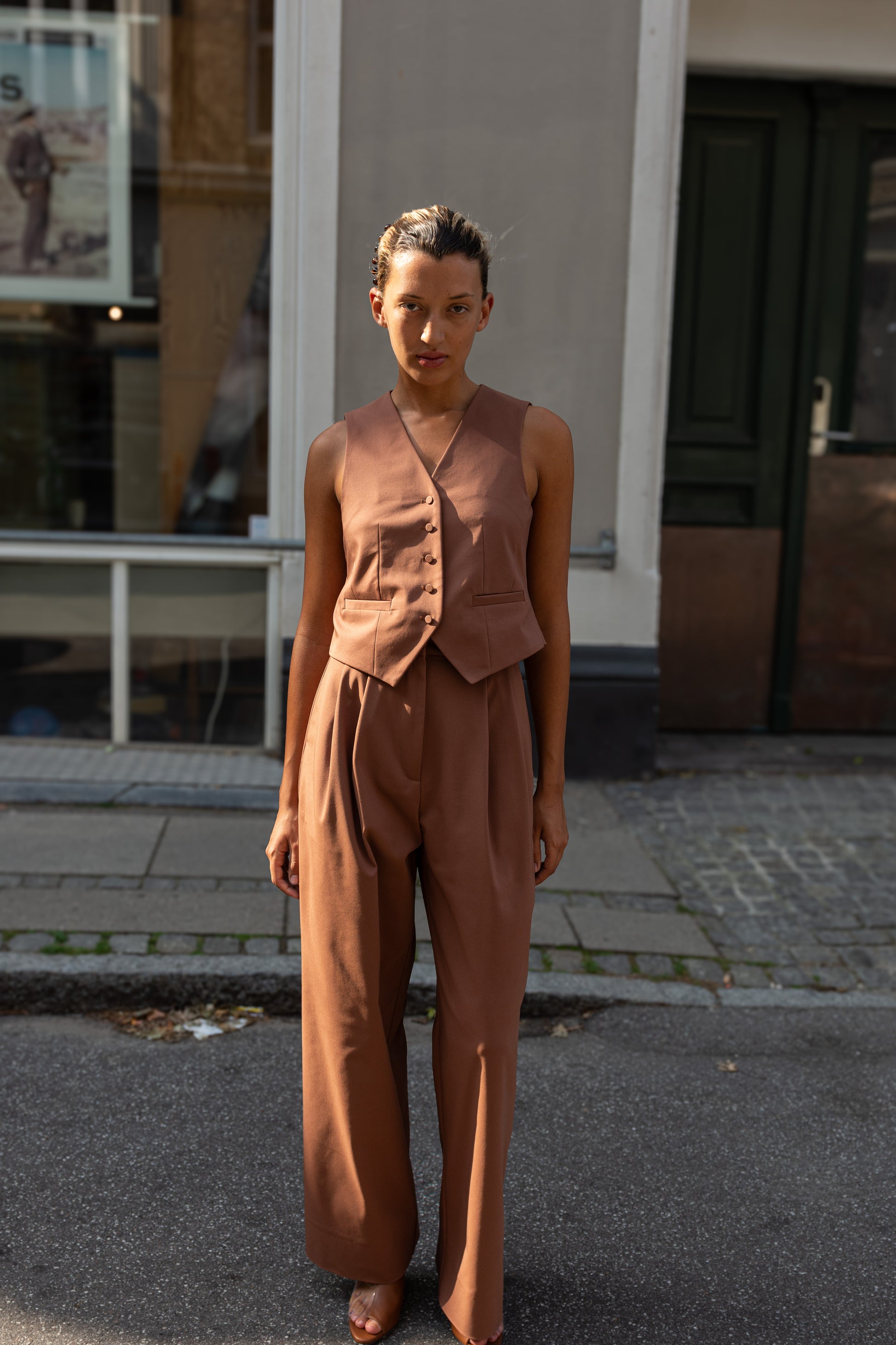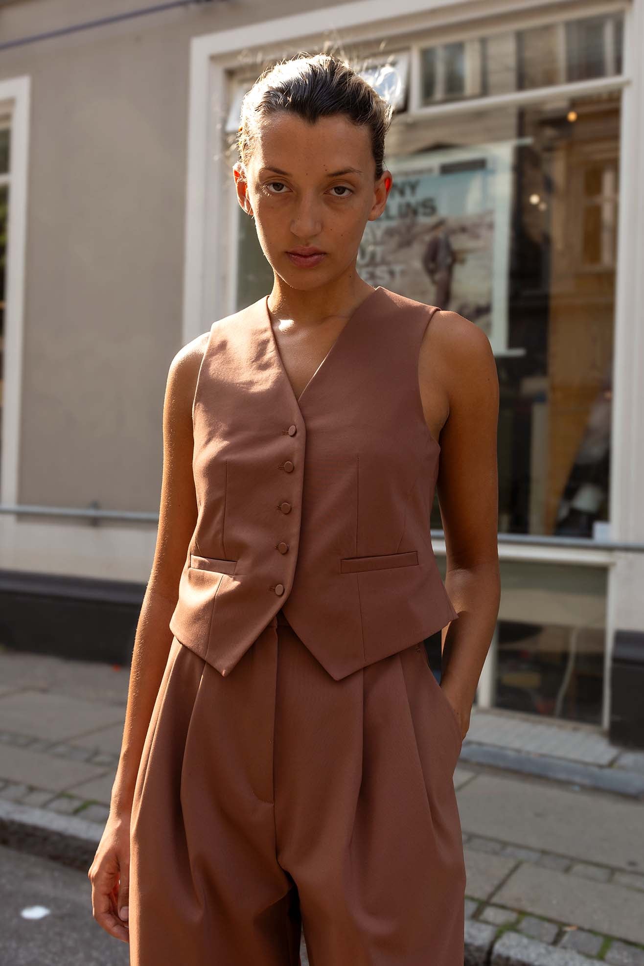 Sleeveless, vest top in Chocolate Brown heavy cotton poplin. V-neck with fabric covered buttons at front placket. Two double welt pockets at hip. Fully lined.