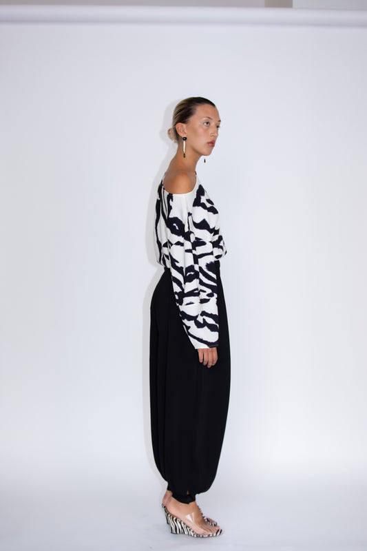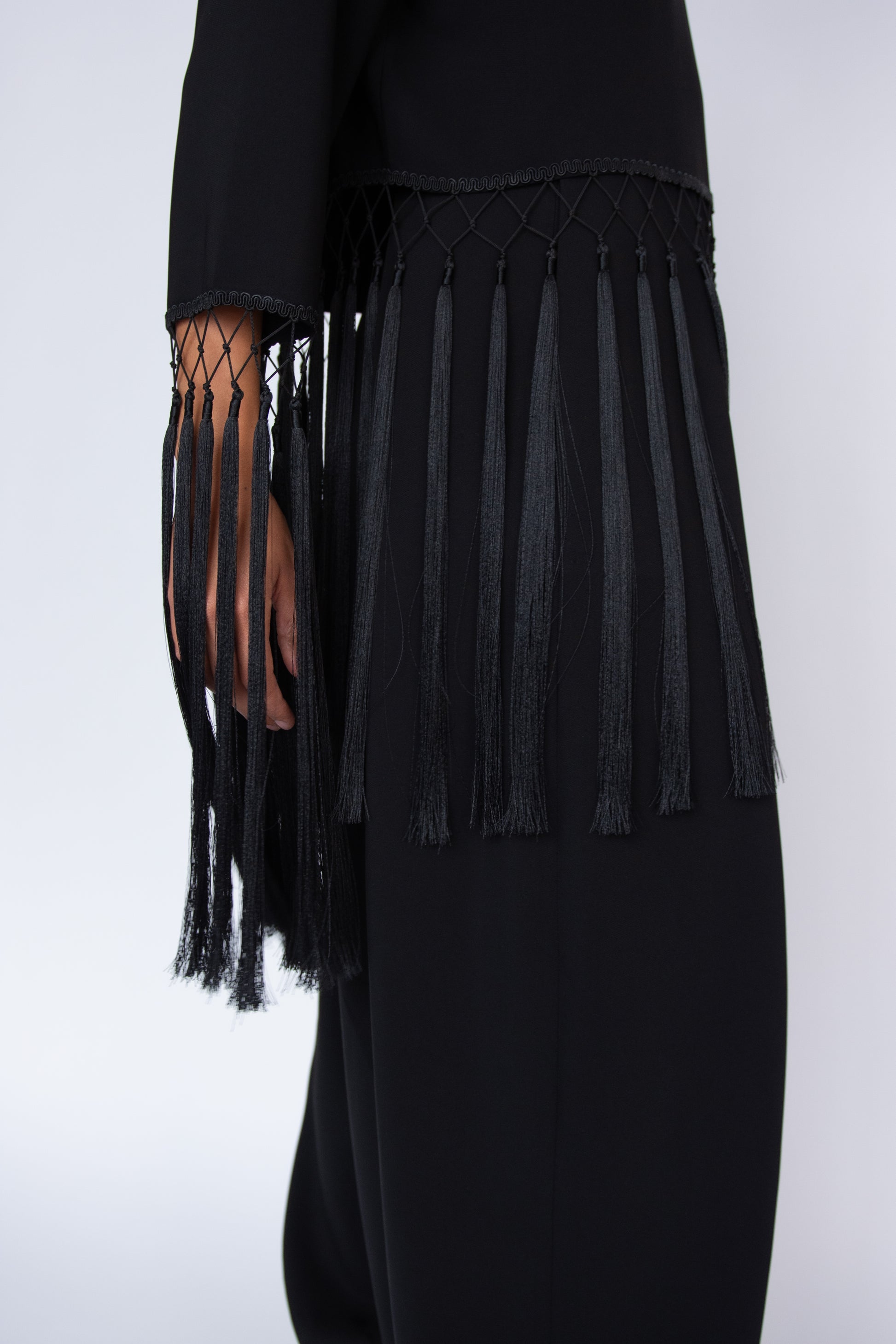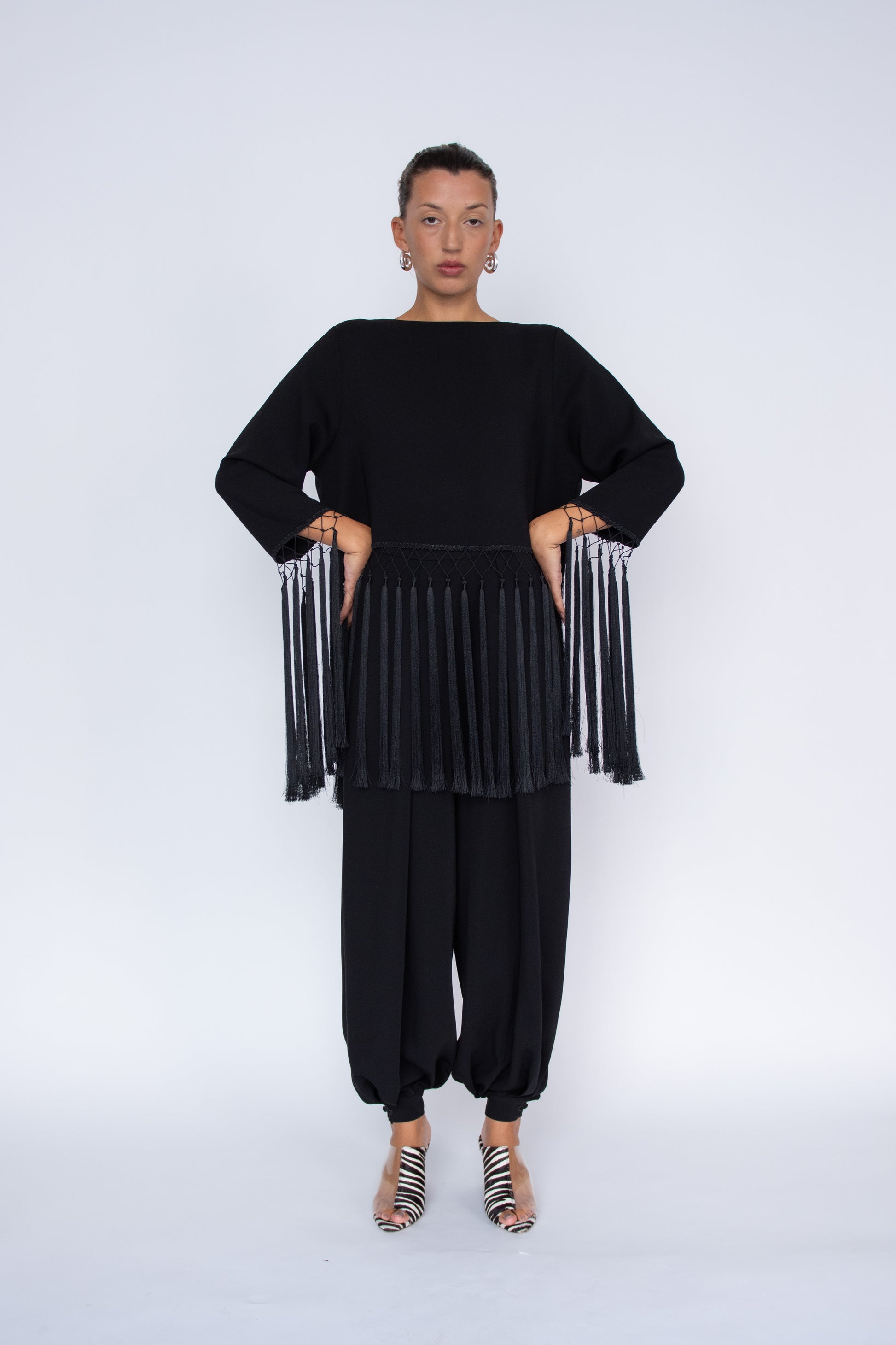 Boxy top with boat neck in our Black FSC certified viscose flat crepe with tonal hand-crafted tassel trim at sleeves hem and hem. 3/4 length sleeves with extra long tassel trim. Slips over head to be worn.