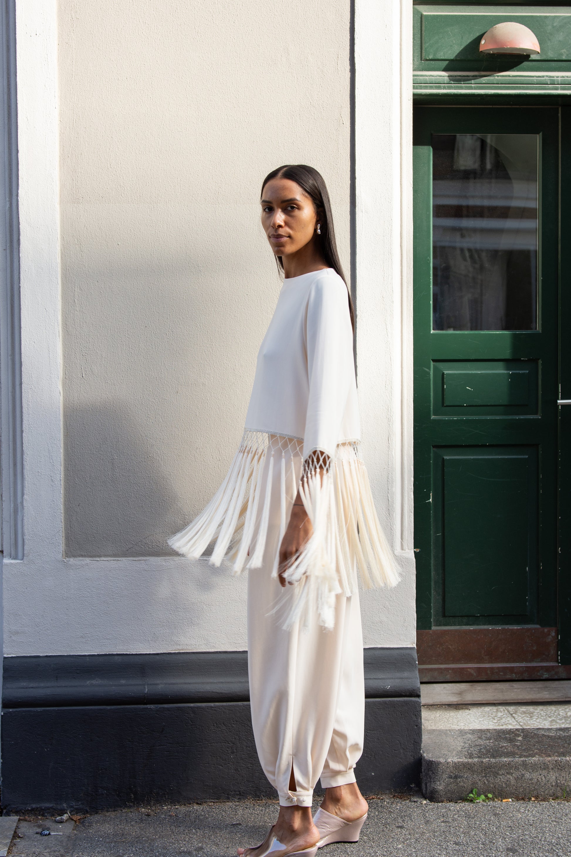 Boxy top with boat neck in our Sheer Pink FSC certified viscose flat crepe with tonal hand-crafted tassel trim at sleeves hem and hem. 3/4 length sleeves with extra long tassel trim. Slips over head to be worn.
