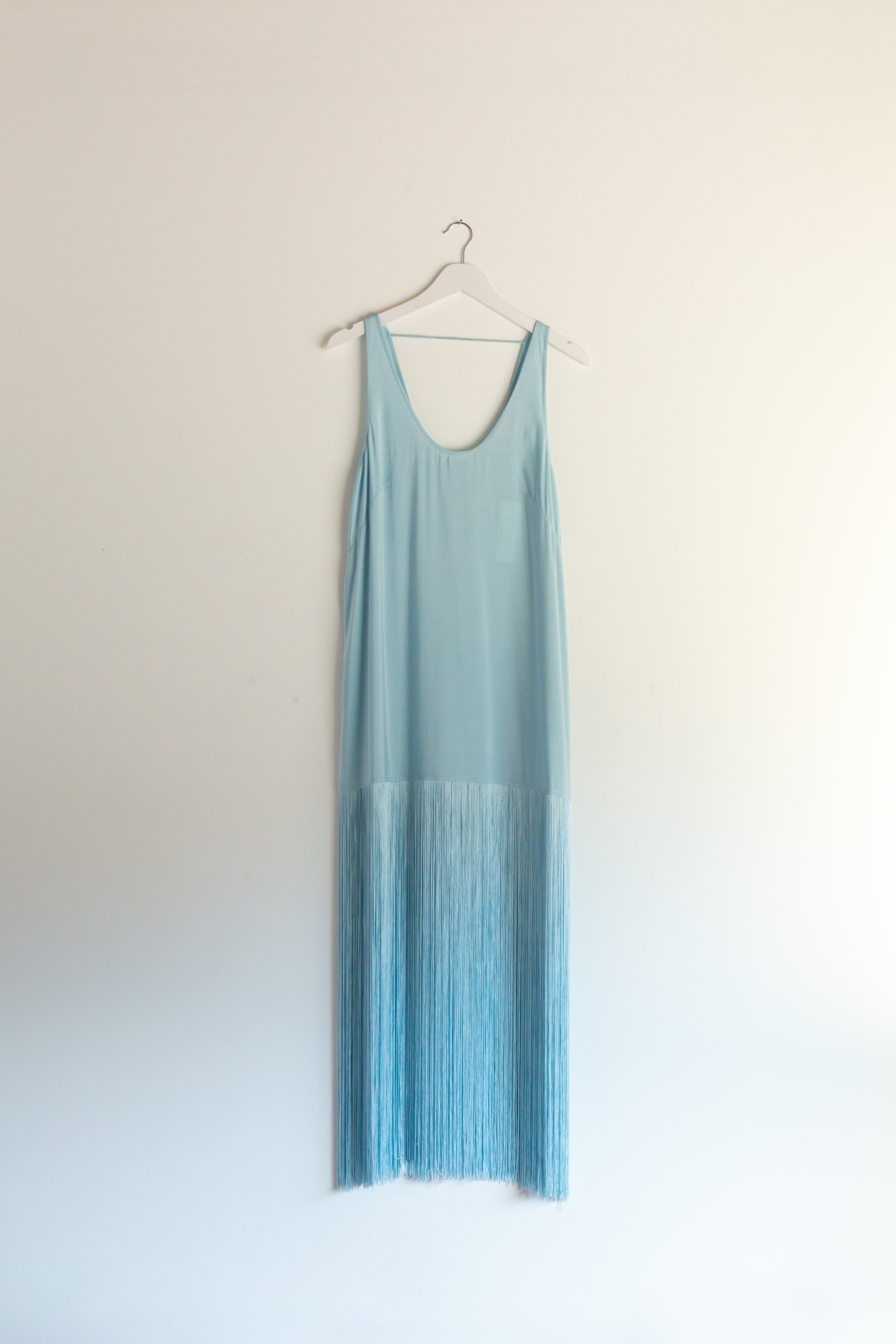 Sleeveless slip dress in Ice Blue lyocell poplin with long tassel hem. Low scoop neckline at front and back with across back stabilizer strap. Long tassels at hem. Slips on over head to be worn. Can be worn on its own or as a slip.