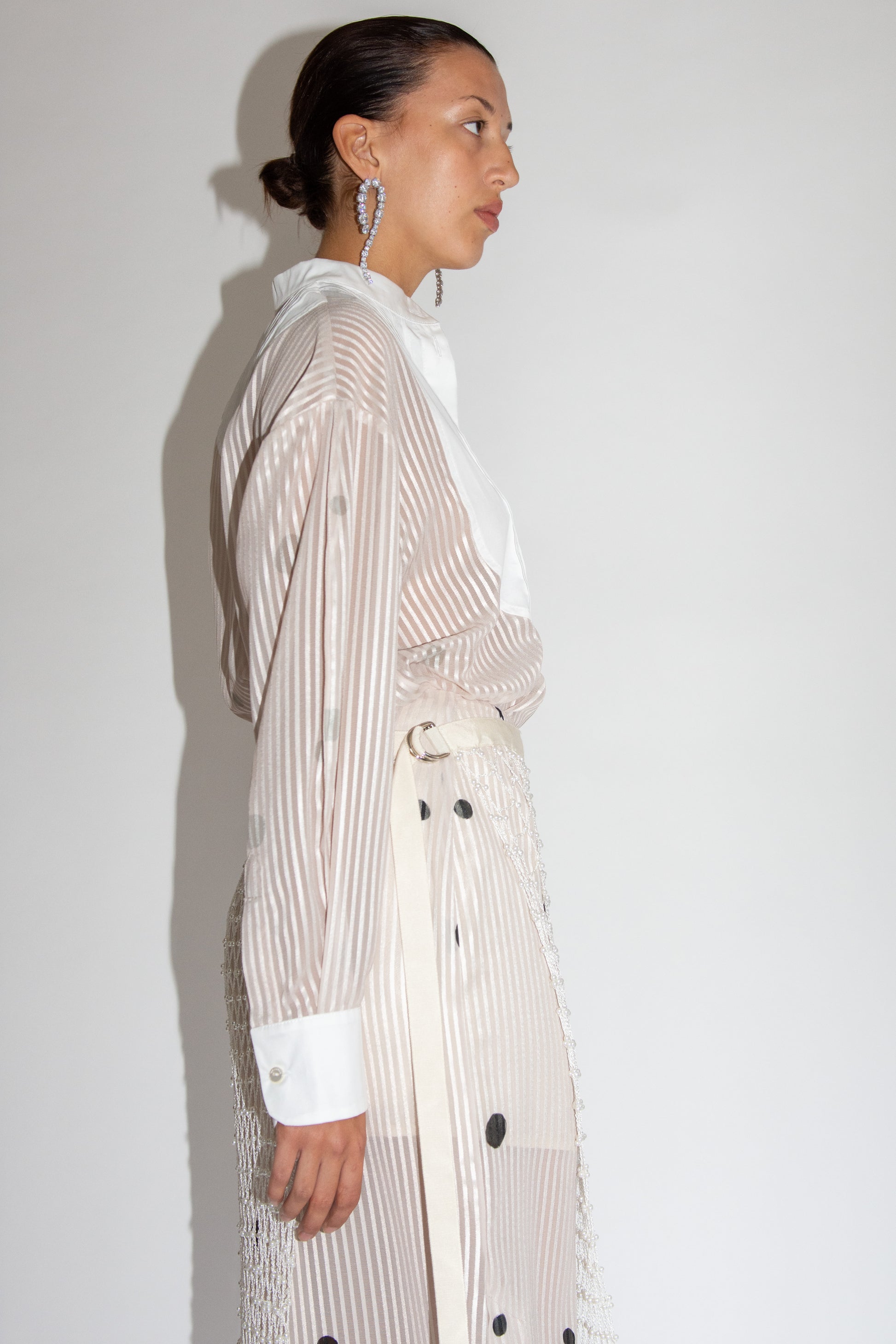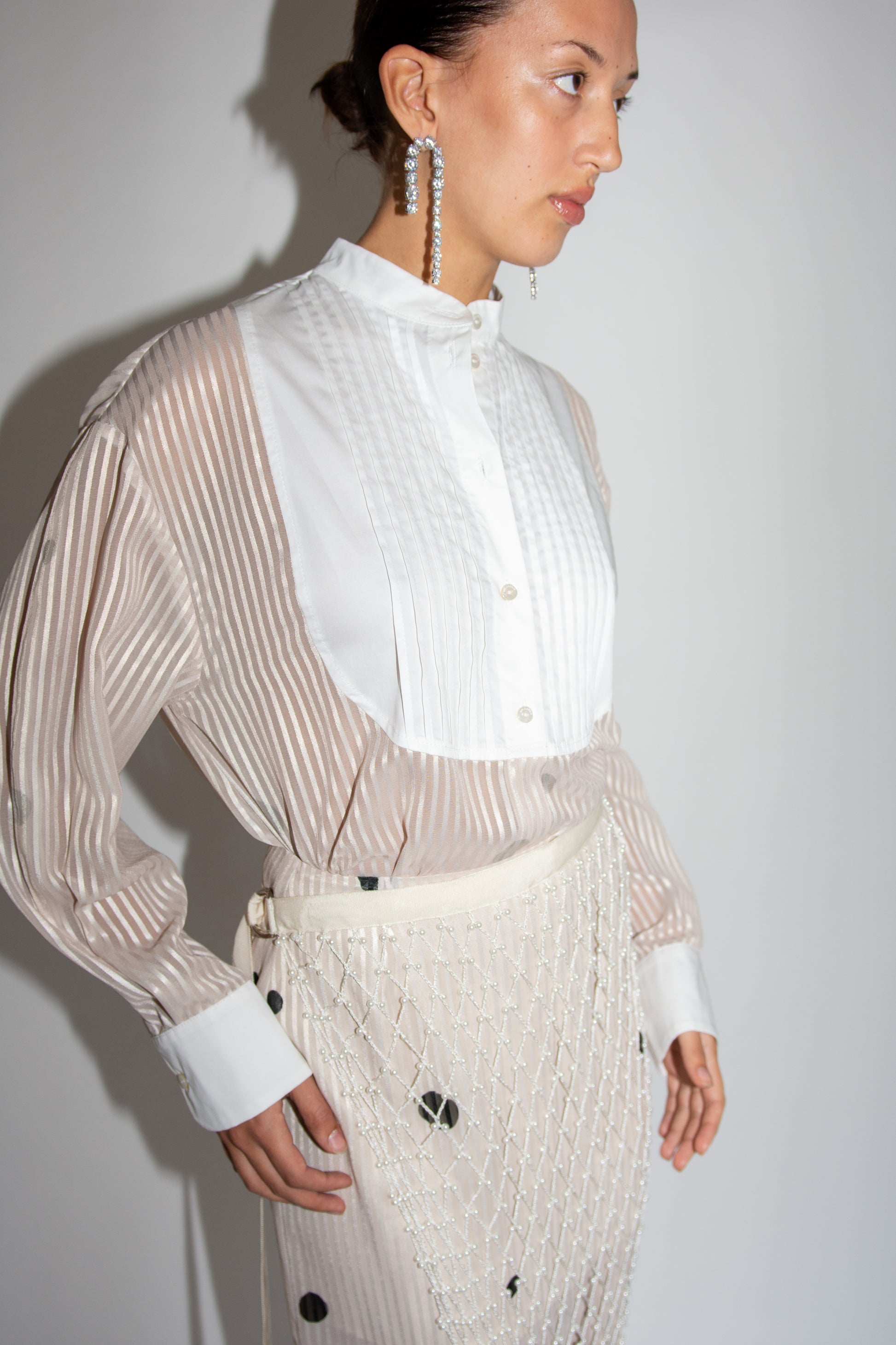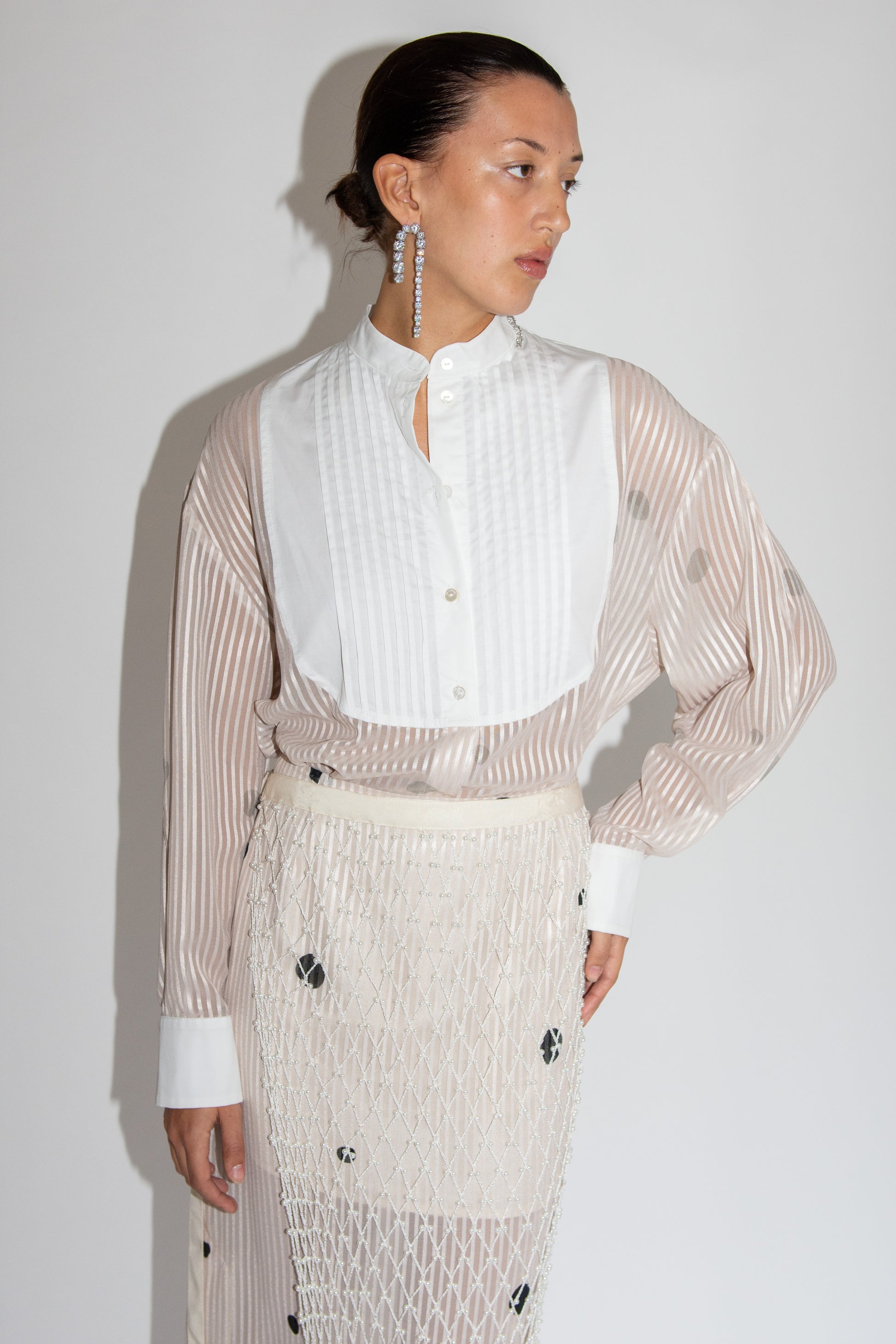 Tuxedo-inspired shirt with banded collar in our space dot printed burnout stripe organza. Contrast bib, yoke and cuffs in white cotton poplin. Pintucks at bib and yoke. Mother of pearl logo buttons. Slips on over head to be worn.
