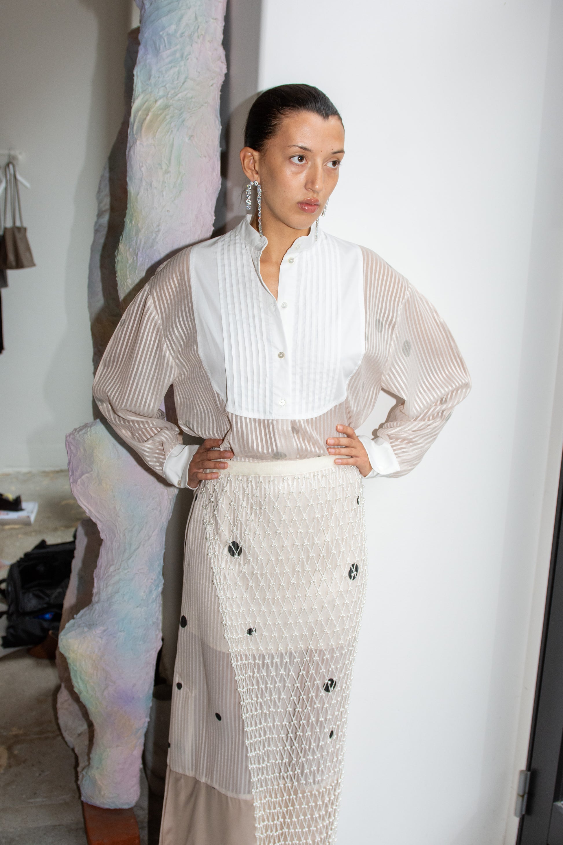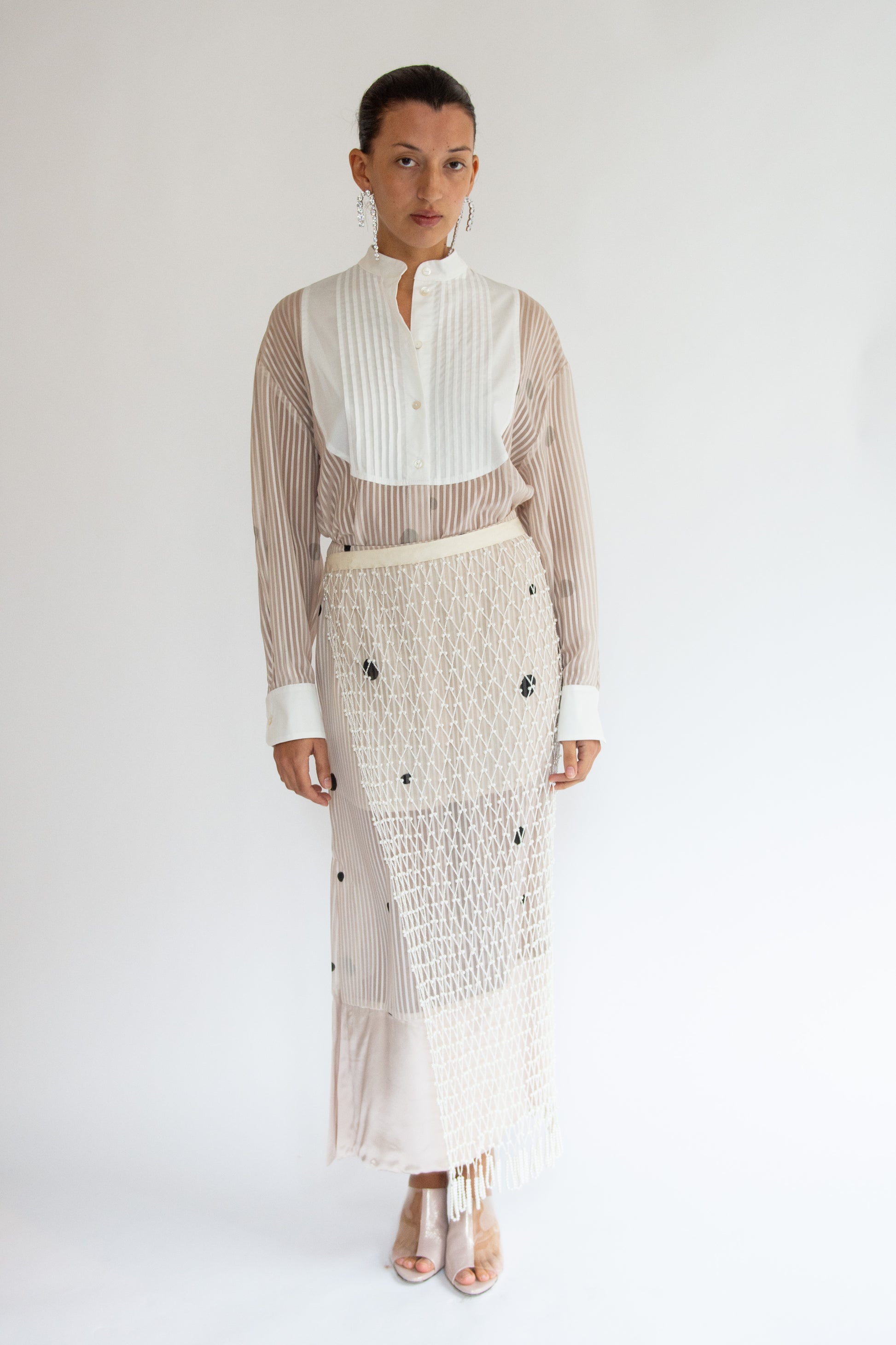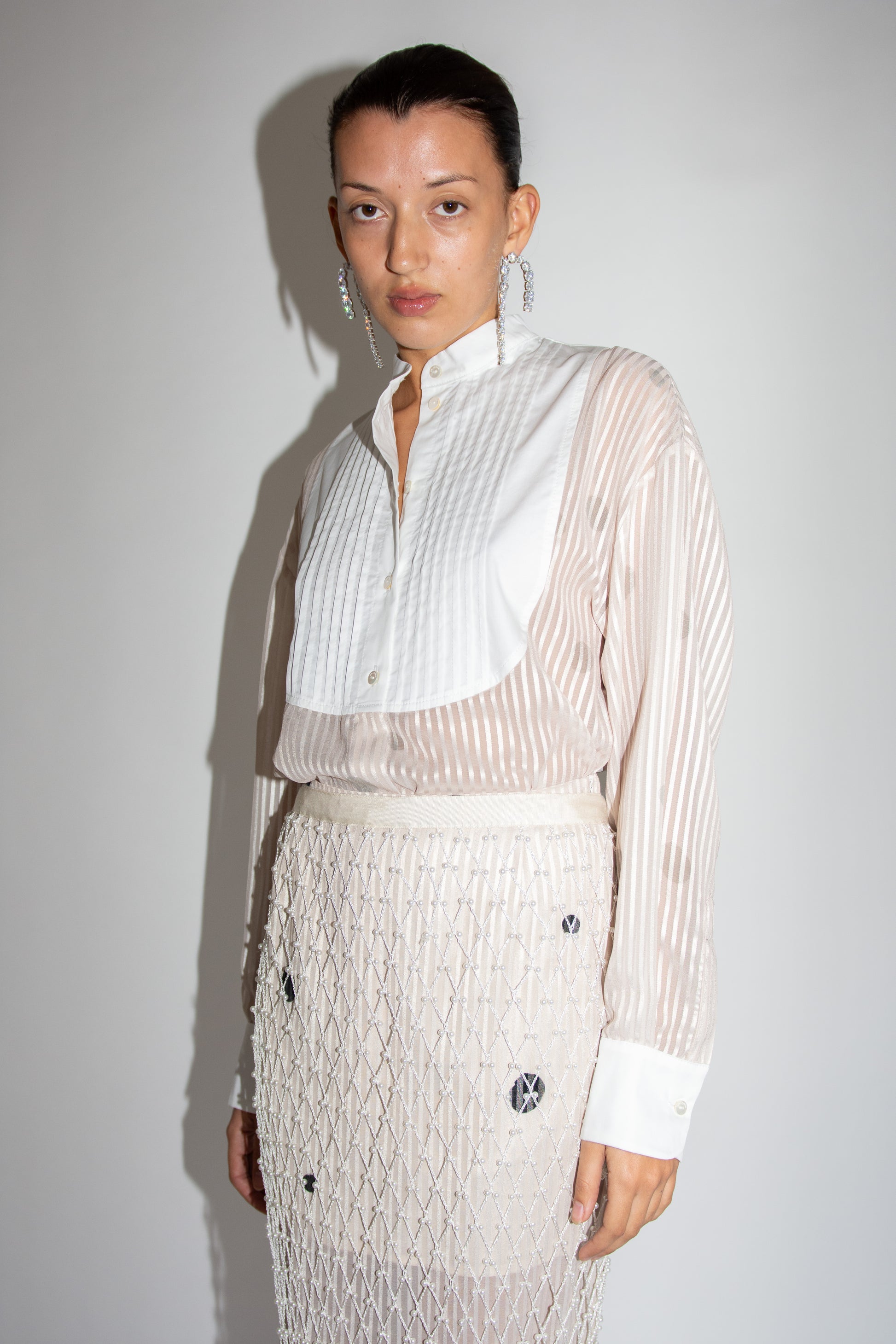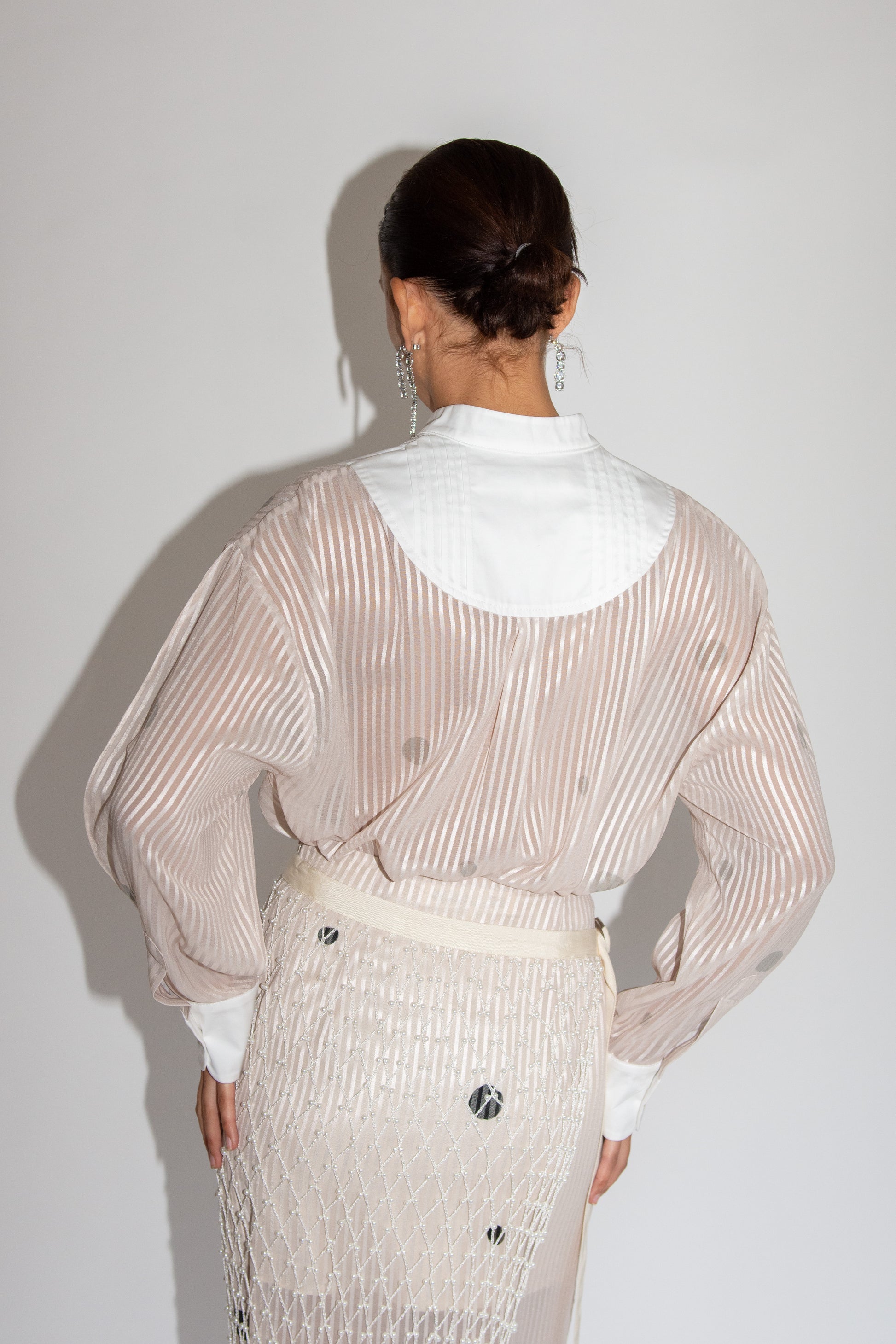 Tuxedo-inspired shirt with banded collar in our space dot printed burnout stripe organza. Contrast bib, yoke and cuffs in white cotton poplin. Pintucks at bib and yoke. Mother of pearl logo buttons. Slips on over head to be worn.