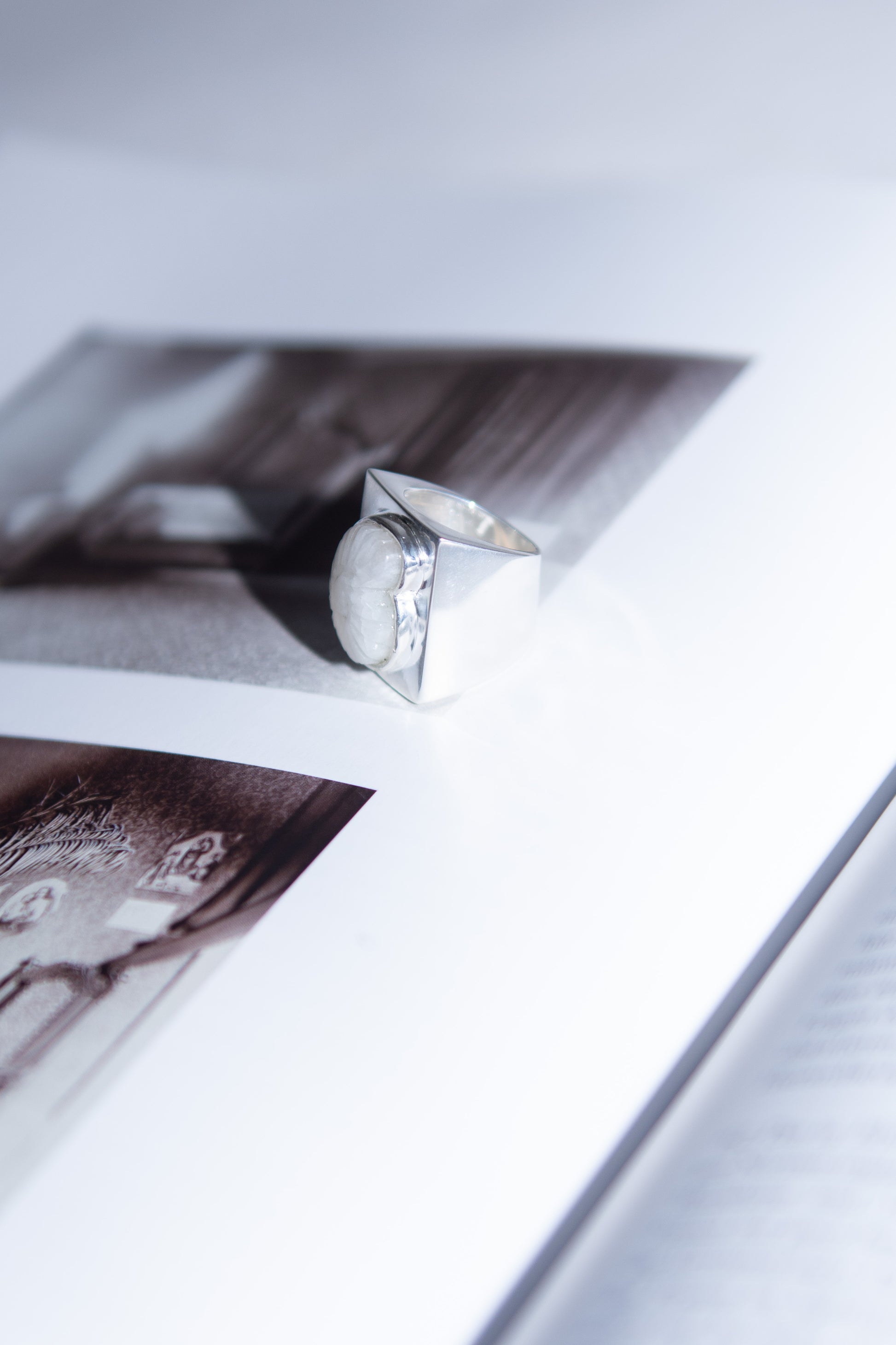 Squared statement ring in Sterling Silver, with Rainbow Moonstone in nautilus motif. Highly-polished finish.