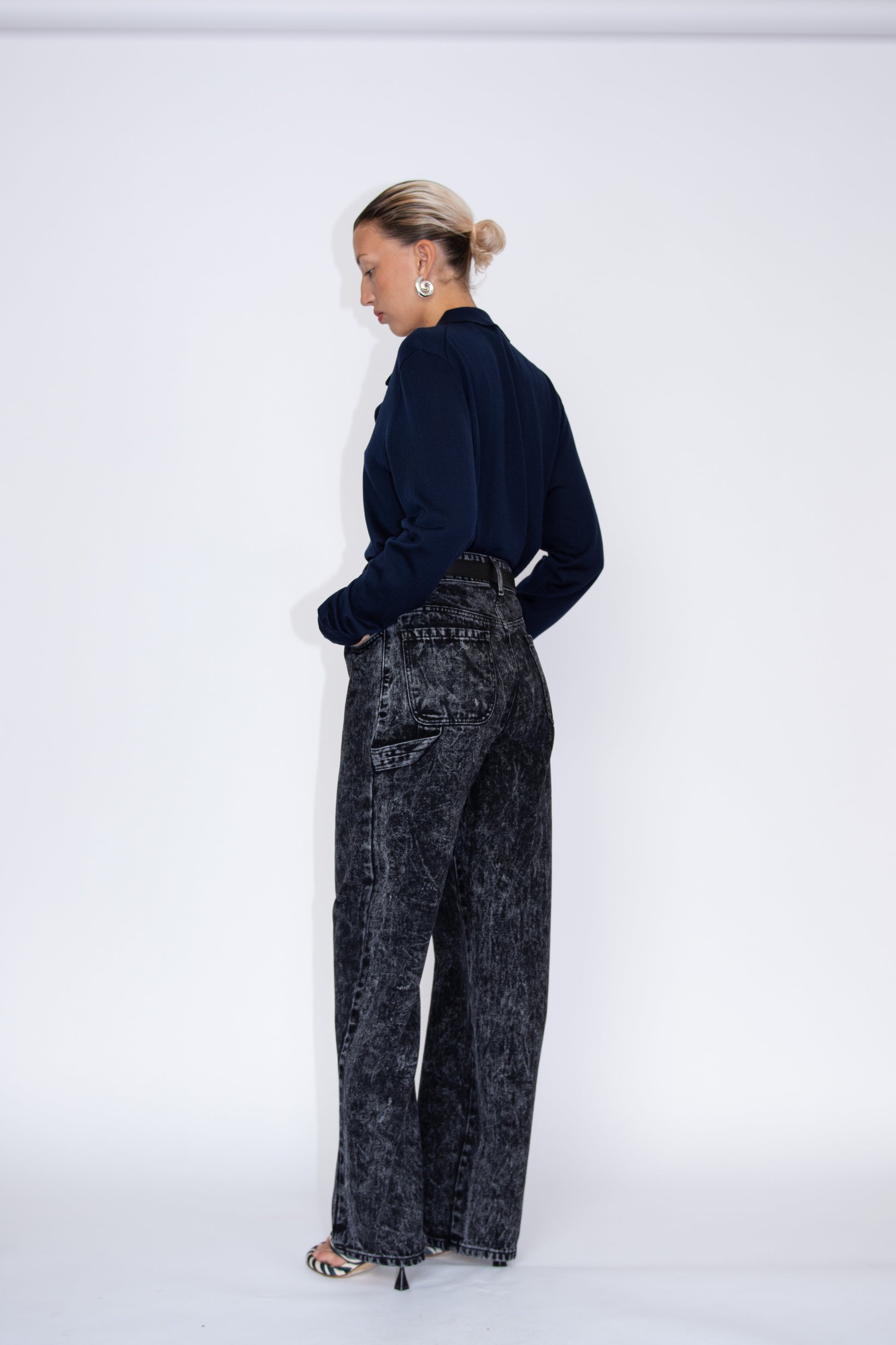 Mid-rise 5 pocket jeans, made from Black acid washed deadstock denim. Features side pockets and back pockets. Hammer loop on left leg. Belt loops. Silver metal hardware.