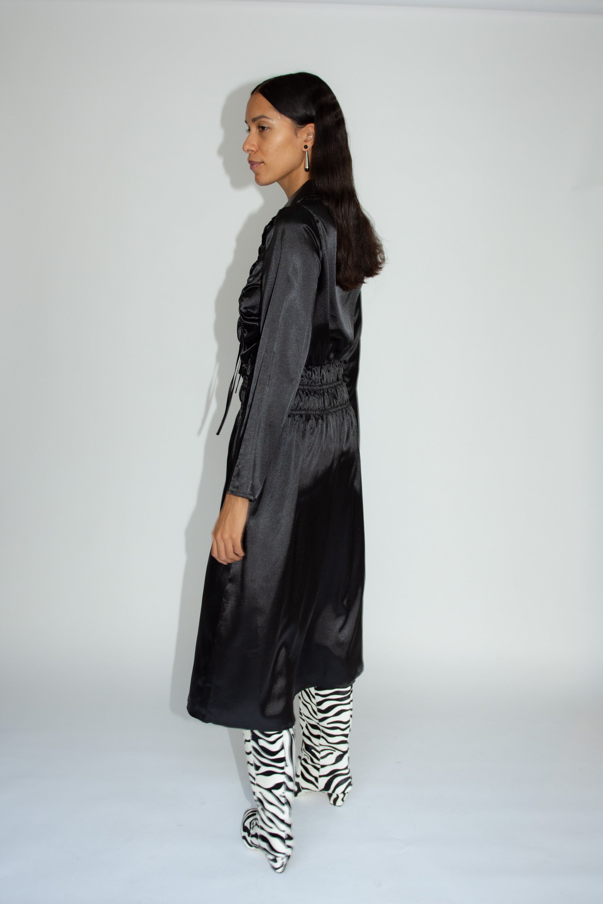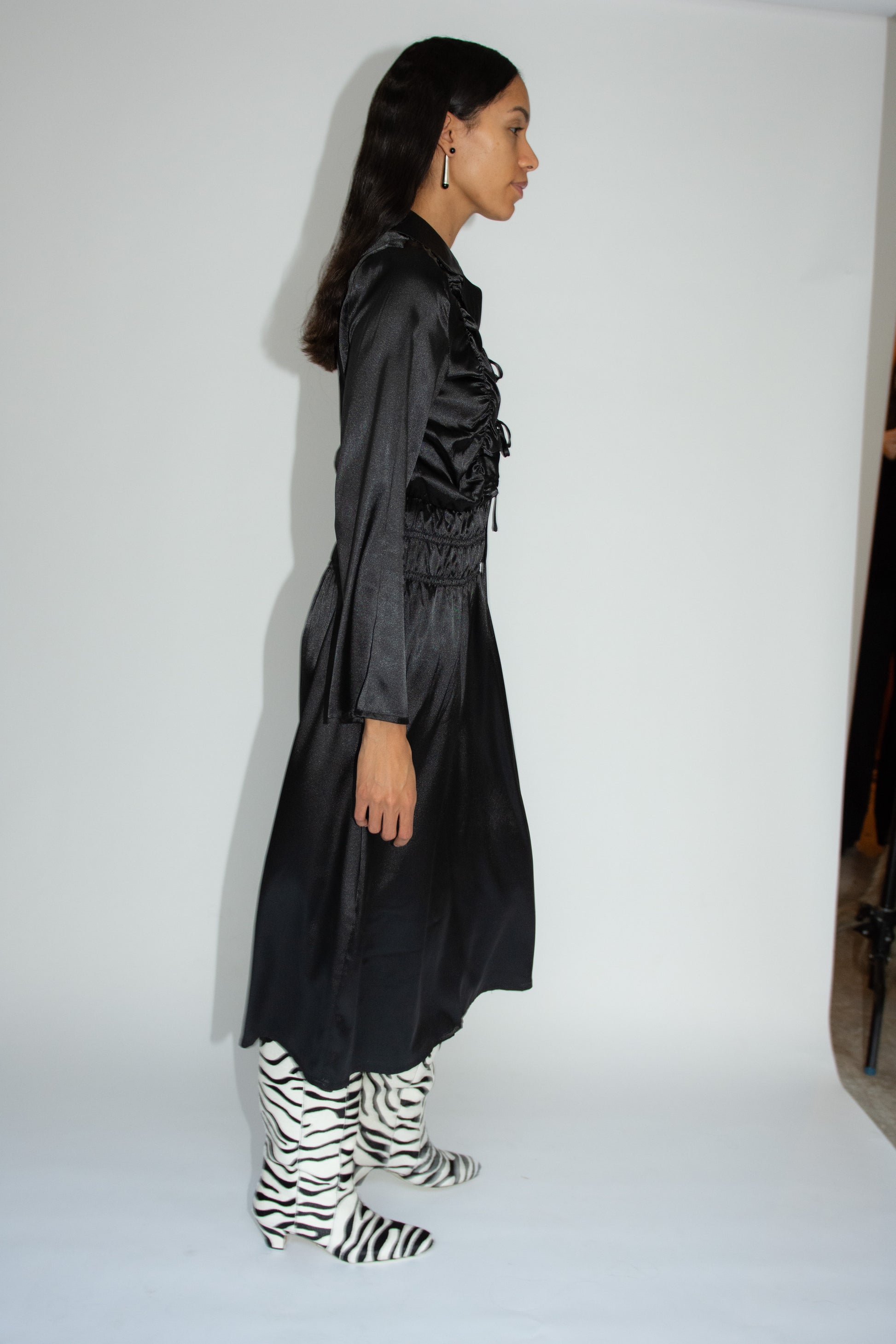 Black dress in satin, with a deep V-neck. Laces and gathered panels at the front. Long, flowing wide skirt. Smocked waist. Long and elegant fit.