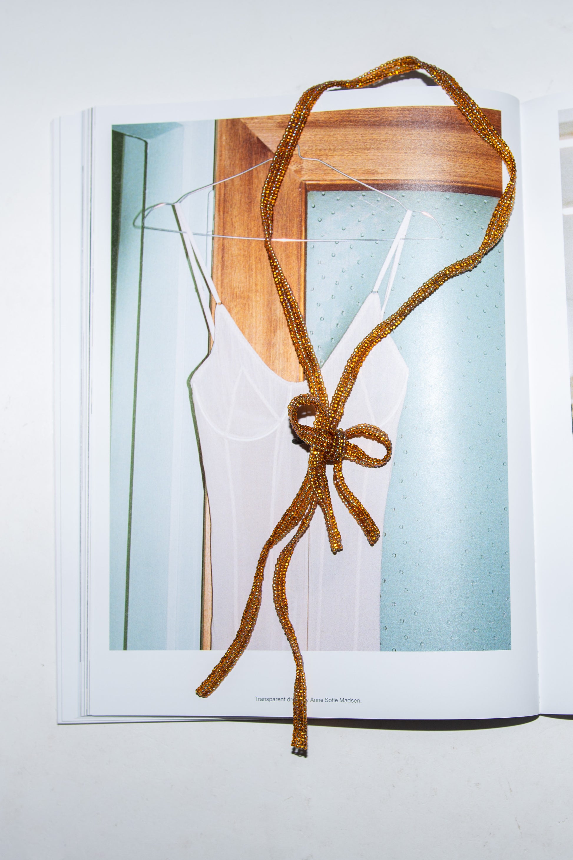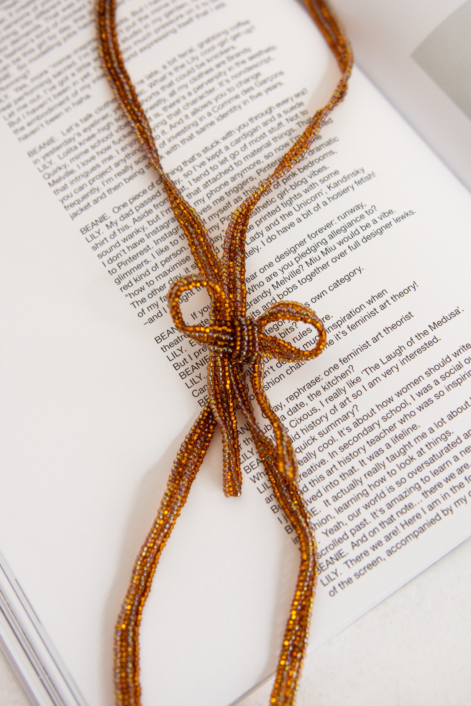 Beaded bolo necklace with bow on strain. Made in Brown beads. 100% handmade. Adjustable length.