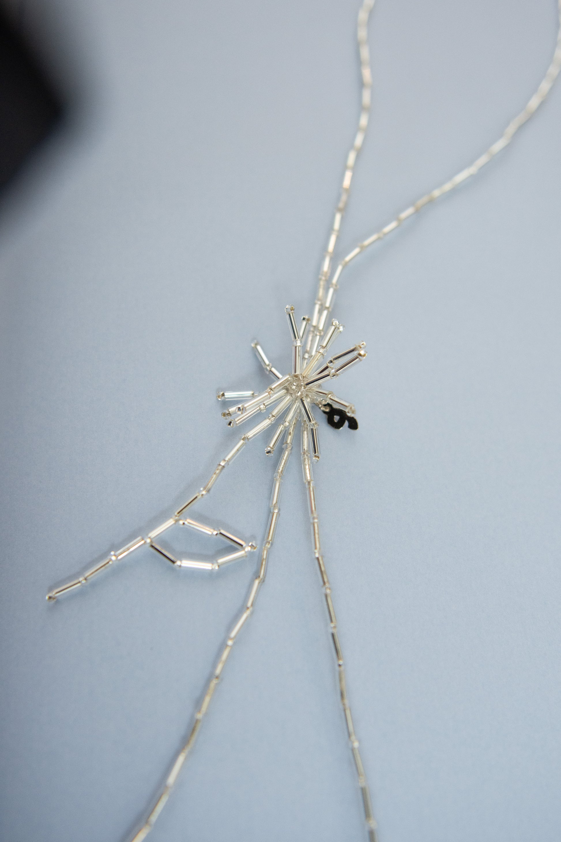 Beaded Silver bolo-necklace with a Dandelion flower on a fine silver strain. 100% handmade. Adjustable length. Easy to mix and match with other necklaces.