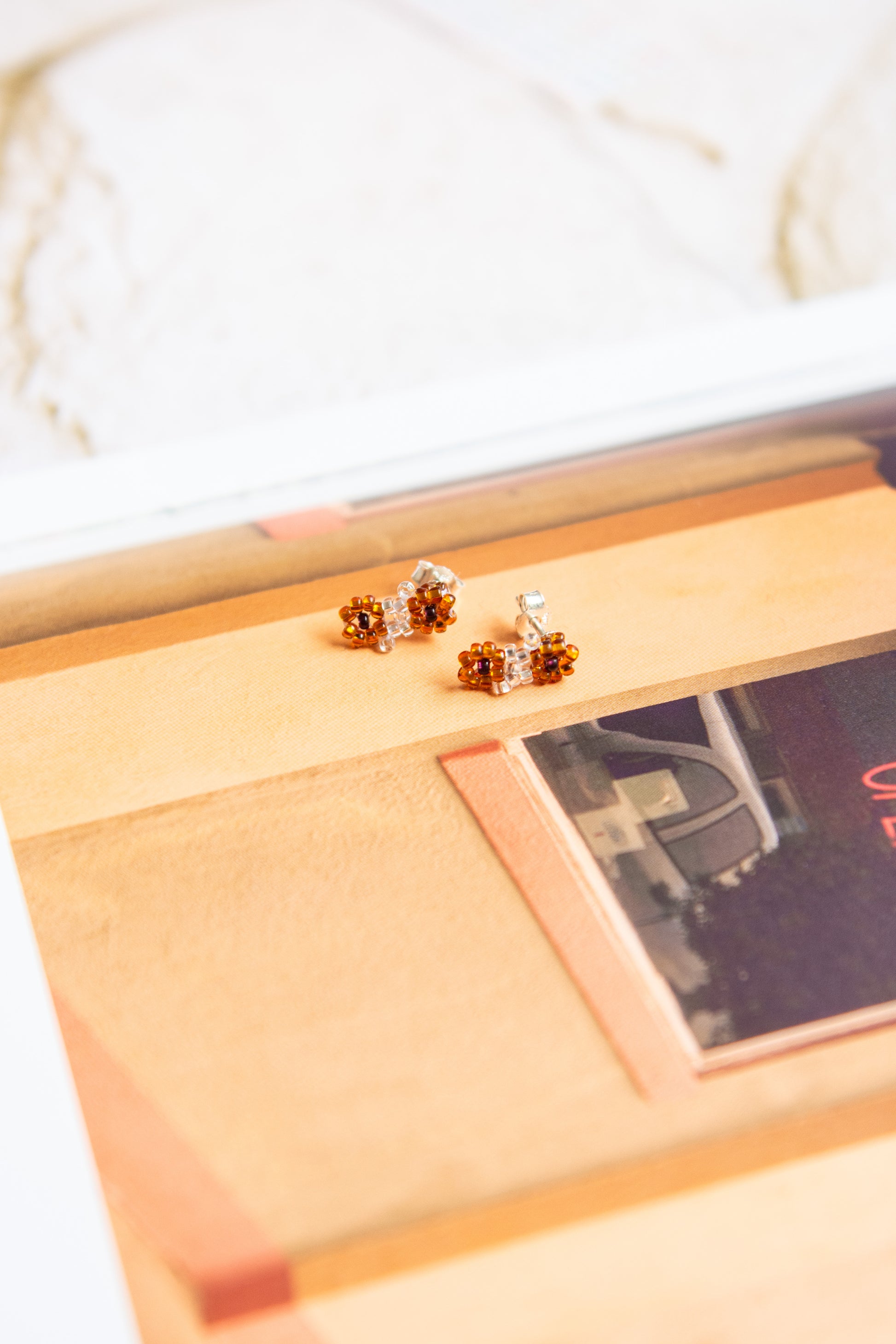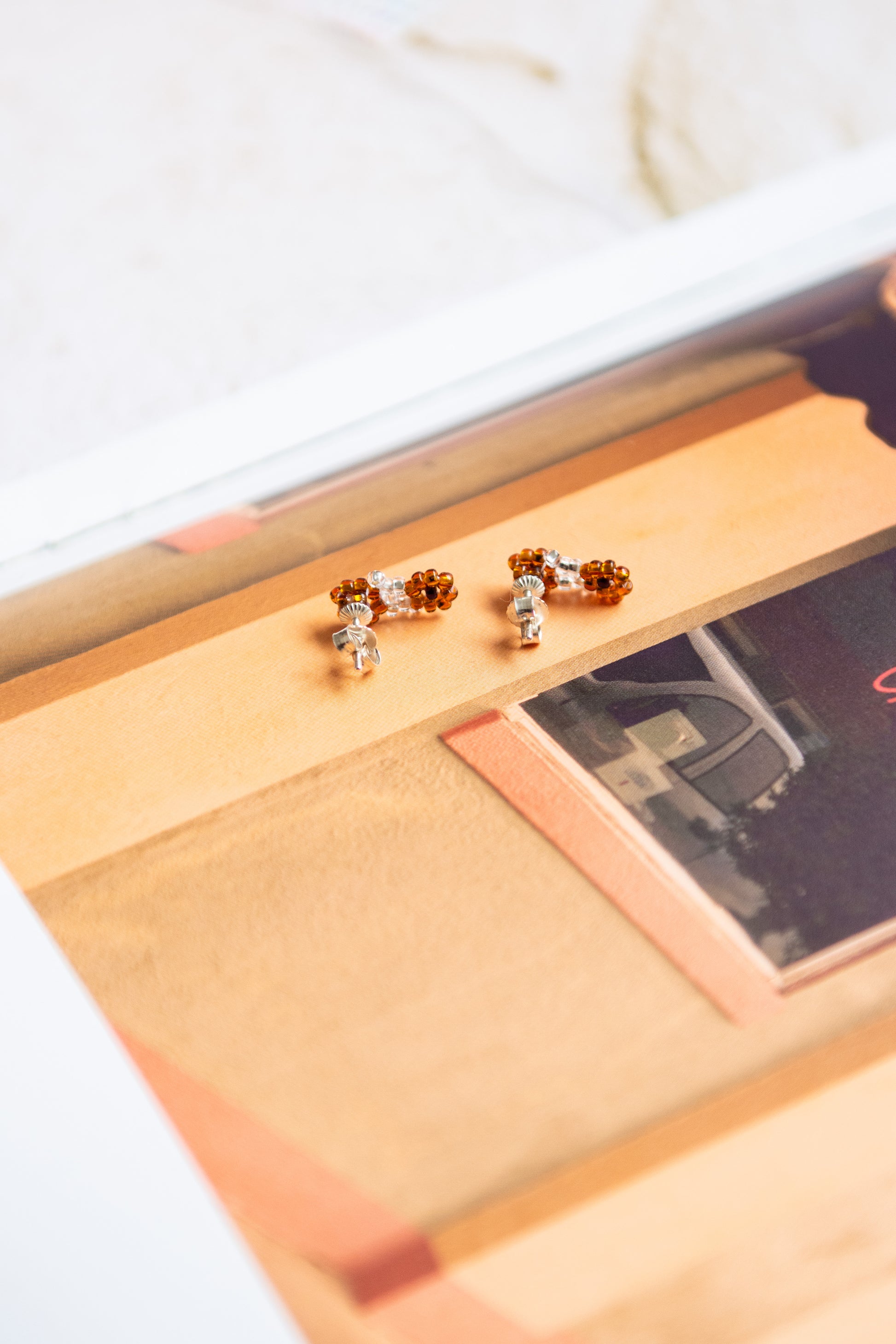 Small beaded double flower earring. Brown, Silver and Black beads. Butterfly closure. Also easy to mix and match with other earrings.