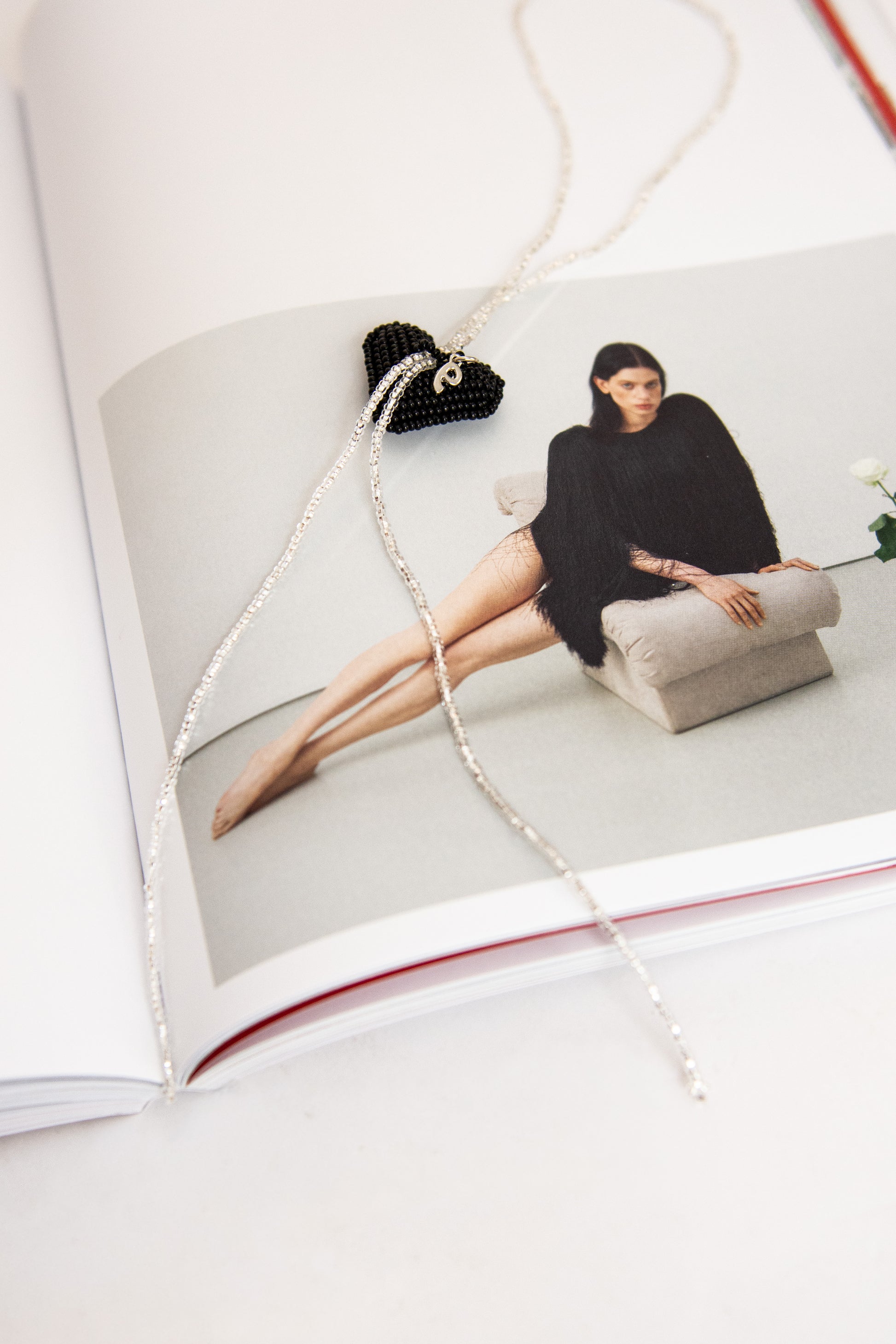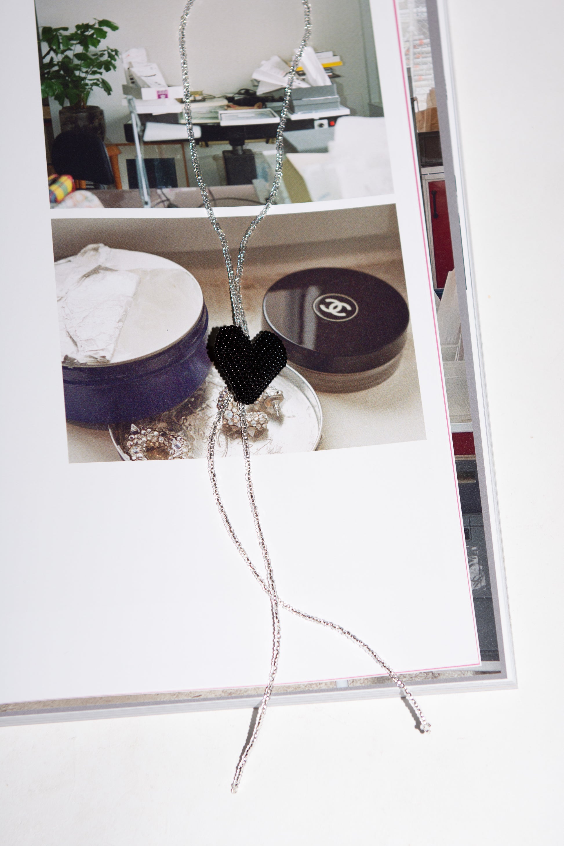 Beaded bolo necklace with a Black heart on a fine Silver strain. Made in Silver and Black beads. 100% handmade. Adjustable fit.
