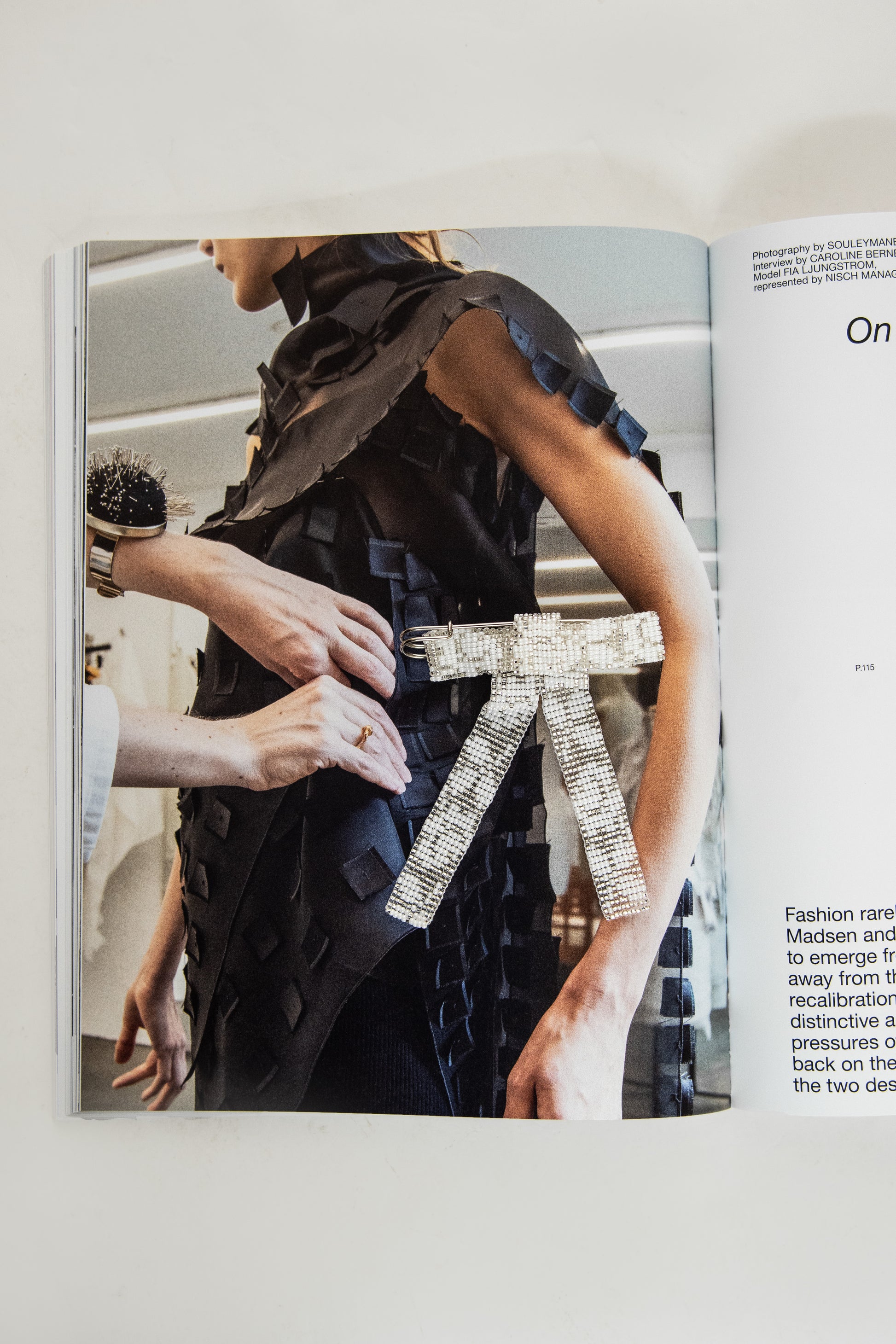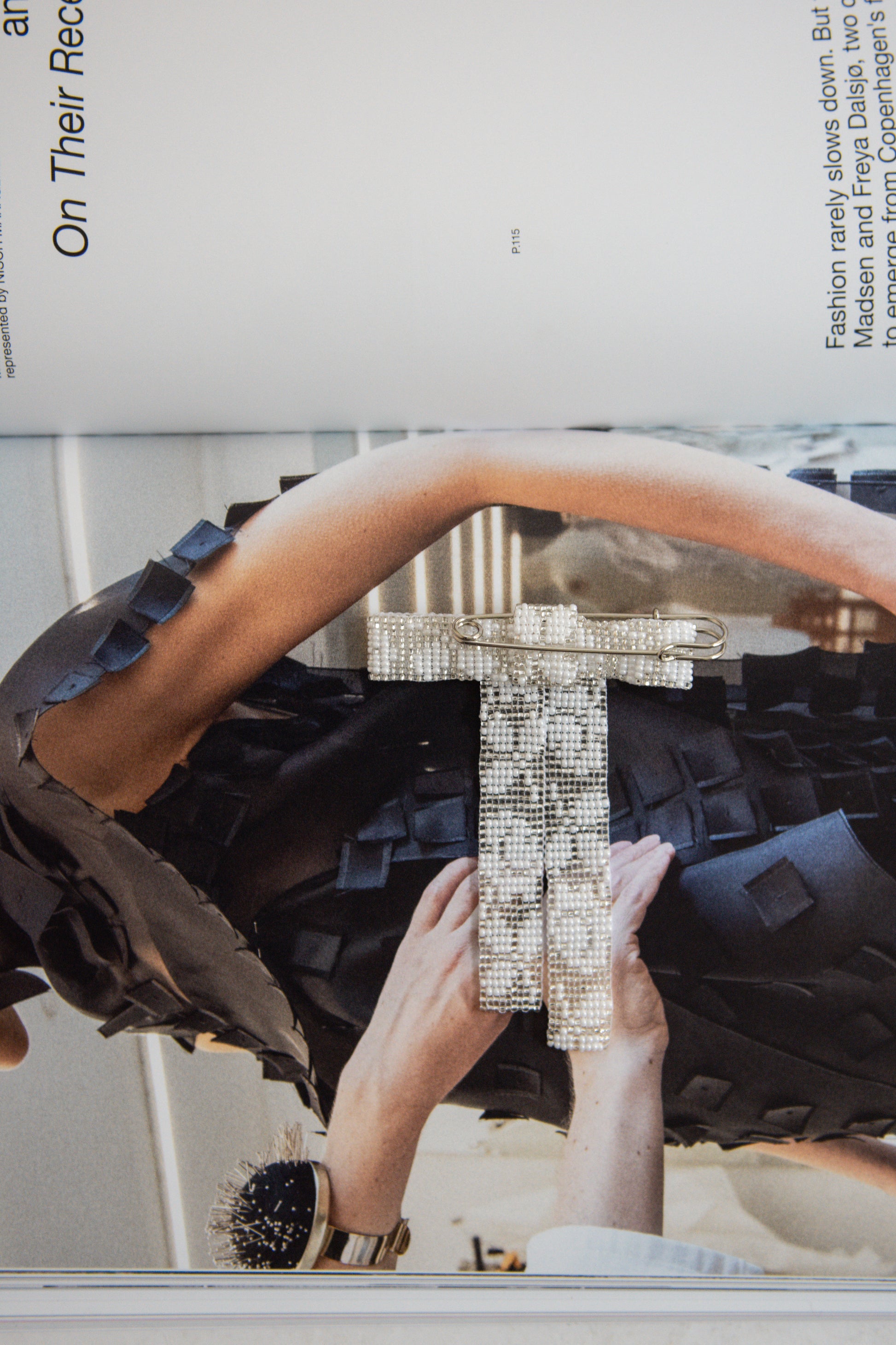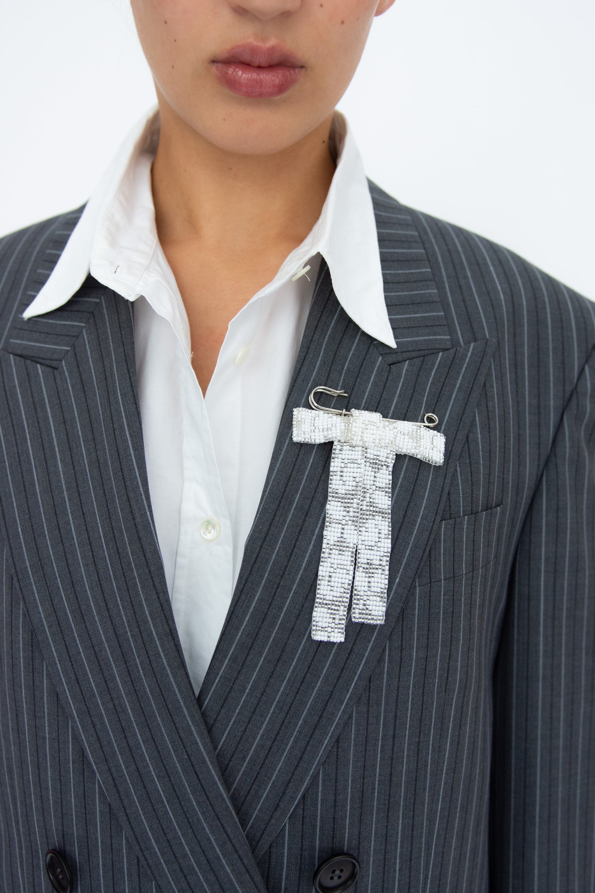 Beaded bow brooch with lace pattern glass beads. Made in Silver and White beads. Pin back.