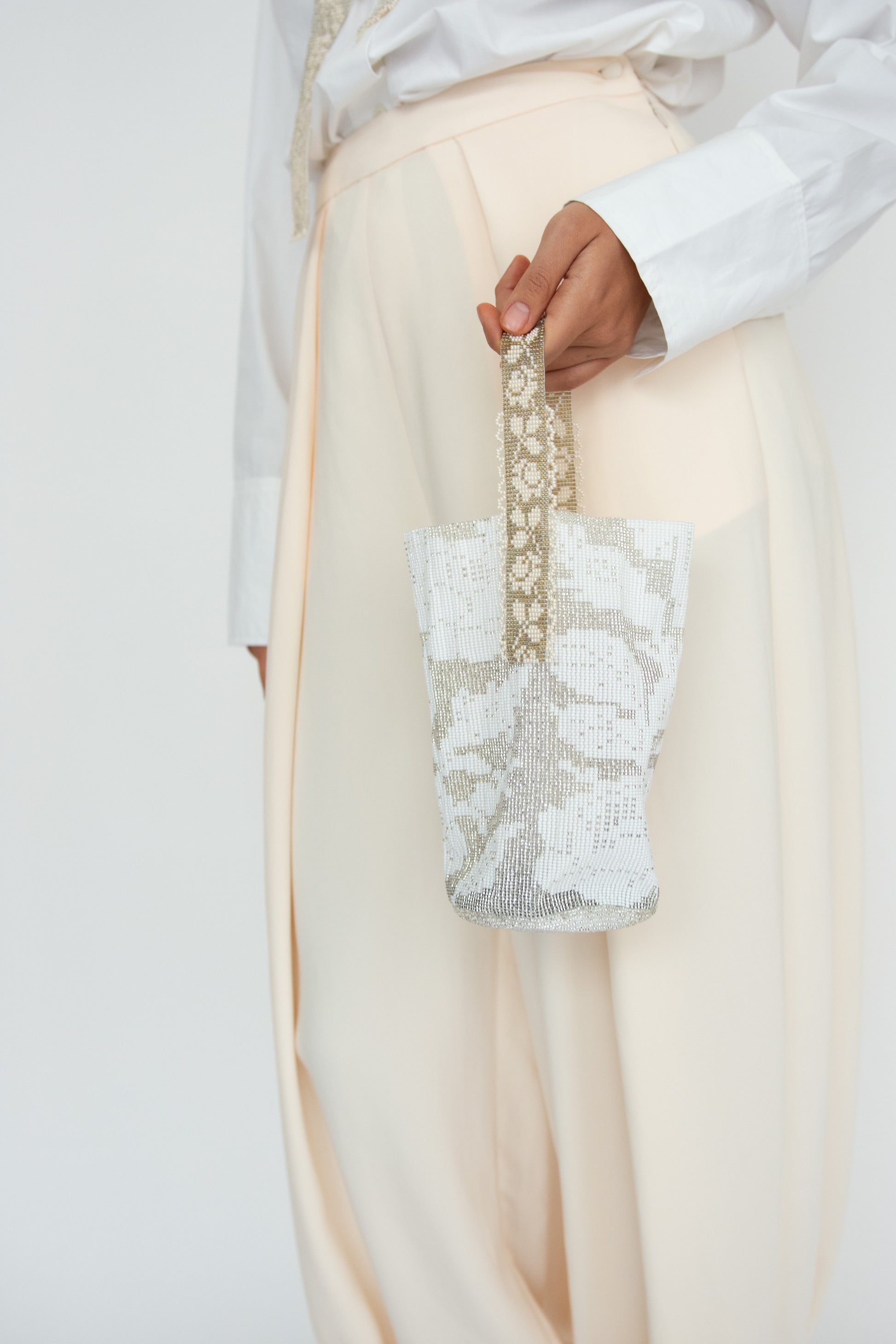 Hand woven pouch bag with lace pattern glass beads. Silver, White and Beige beads. Wide beaded handles that loop through the bag. Handwoven top and embroidered bottom making it hard and durable. Handmade with 39'000 glass beads, in 4 days, by 3 women in Guatemala.