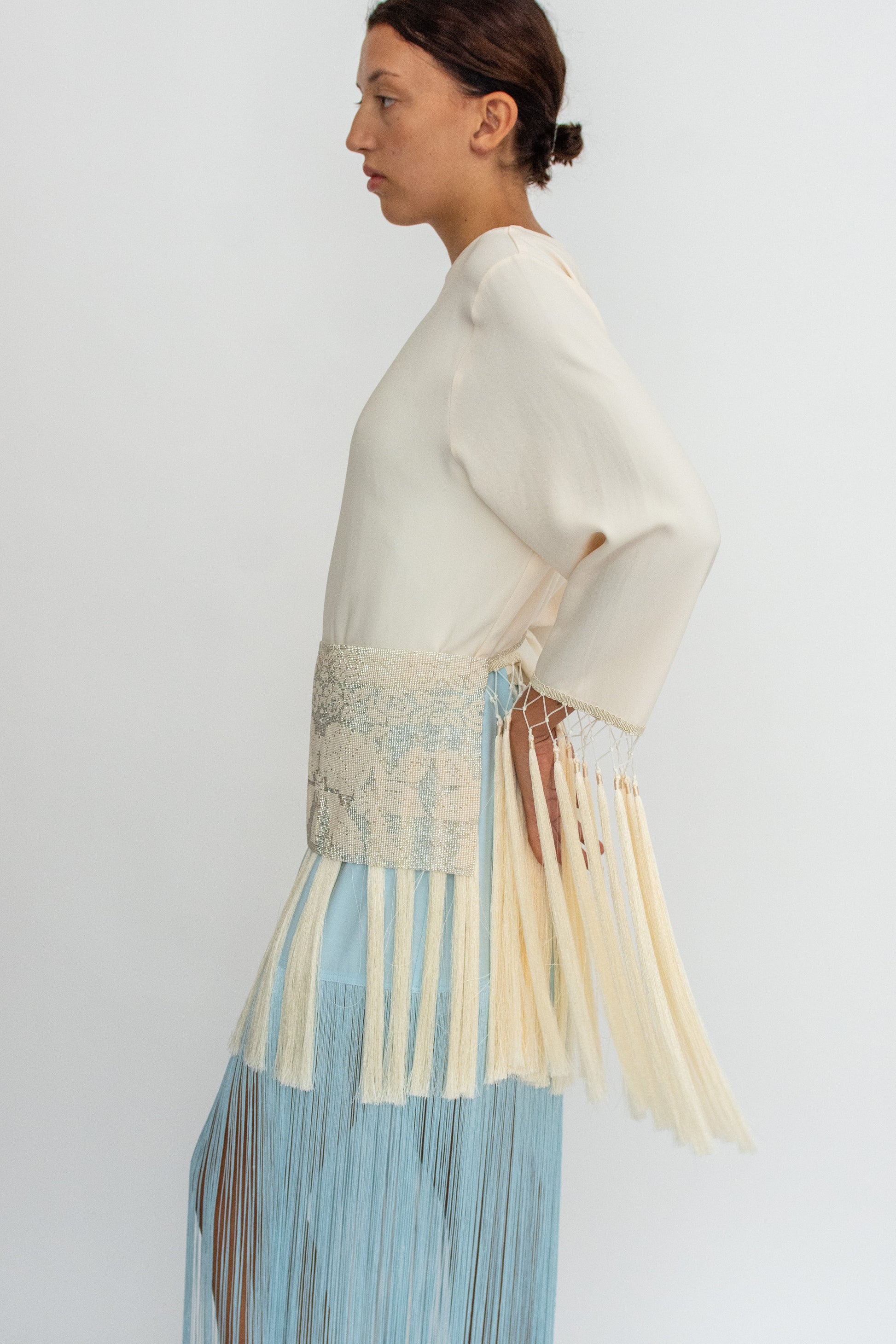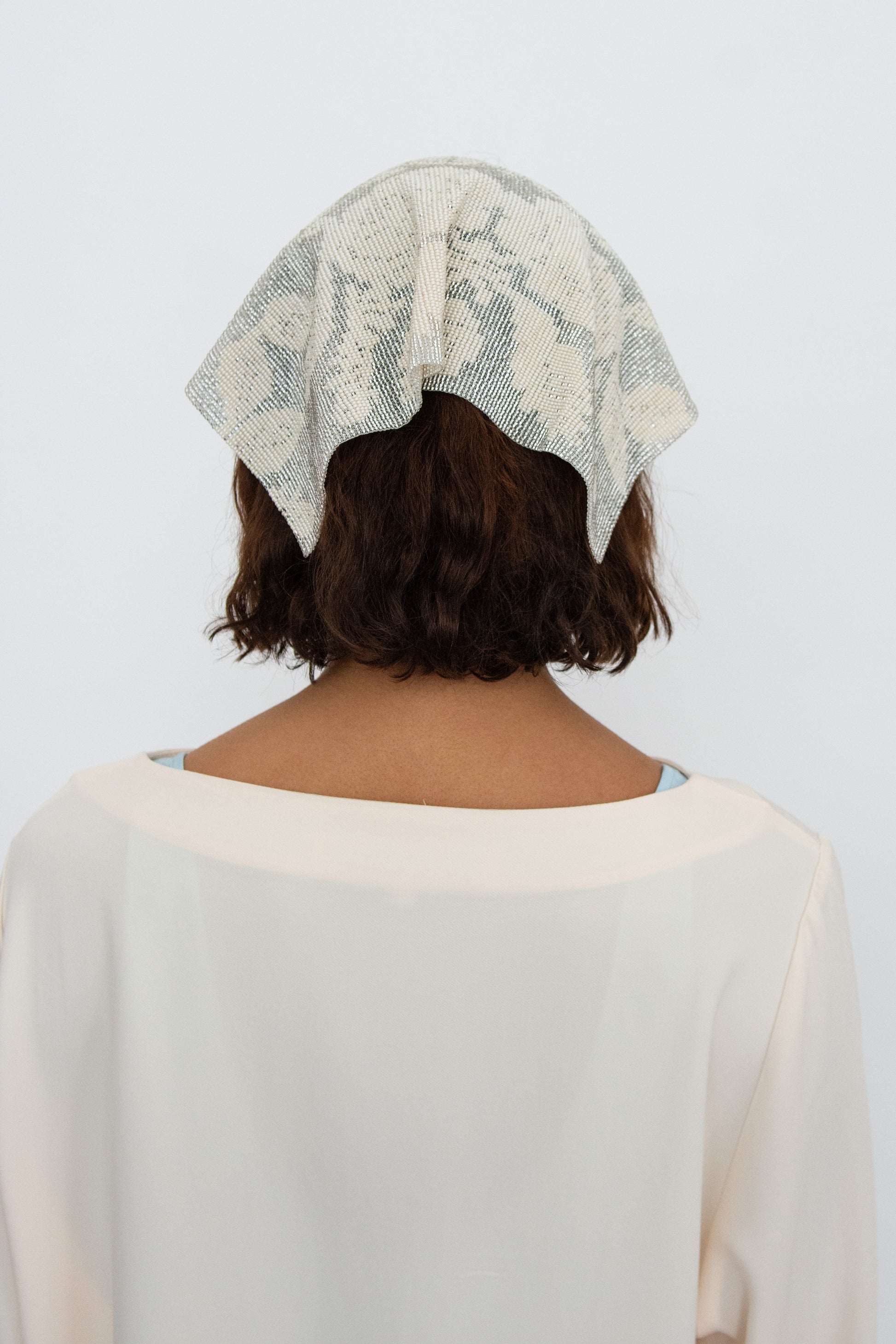 Hand woven bandana belt in lace pattern. Made of Silver and Beige beads. Multifunctional piece, can both be used as headscarf, shawl or as a belt. Beaded string closure. Handmade with 27'450 in Guatemala.