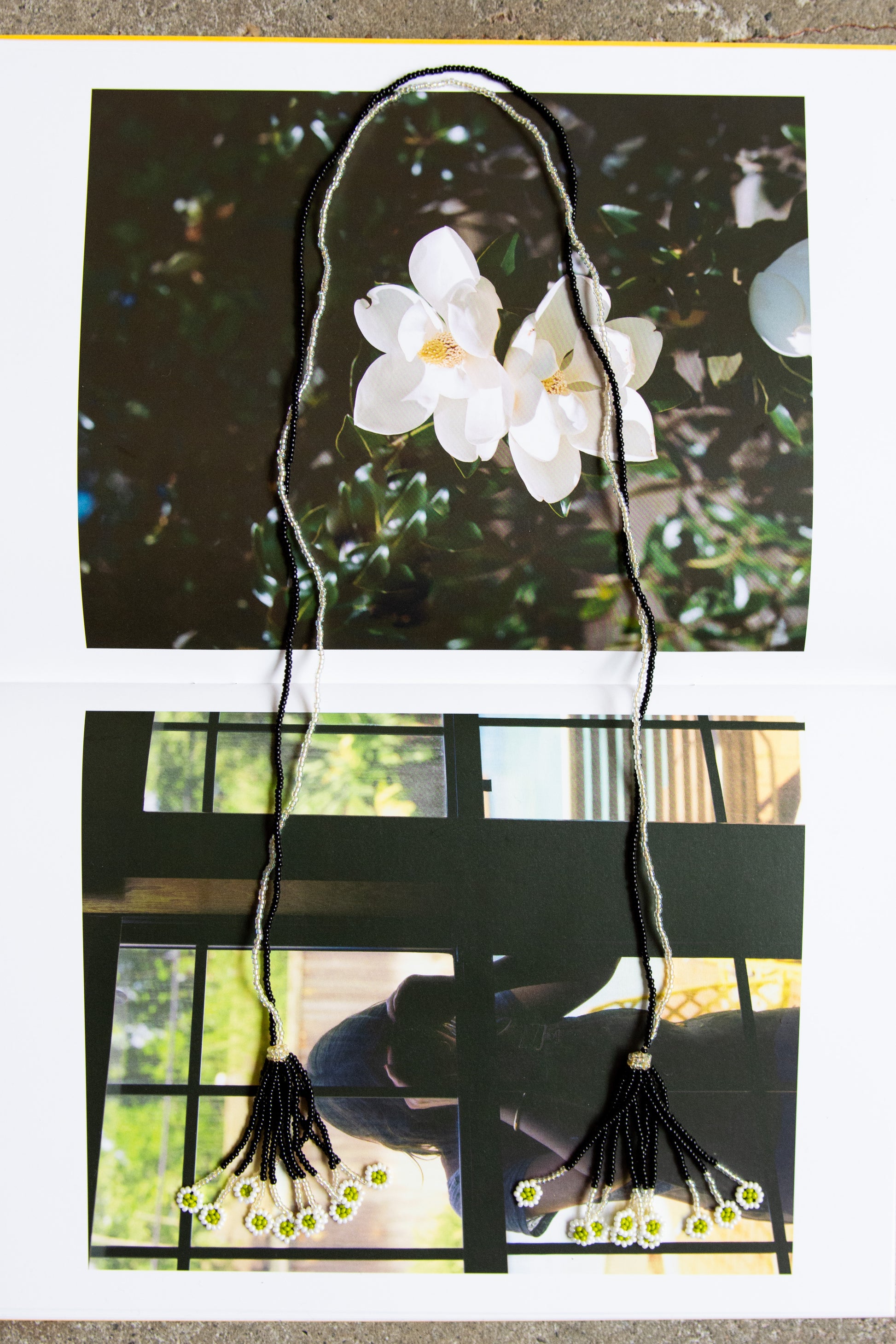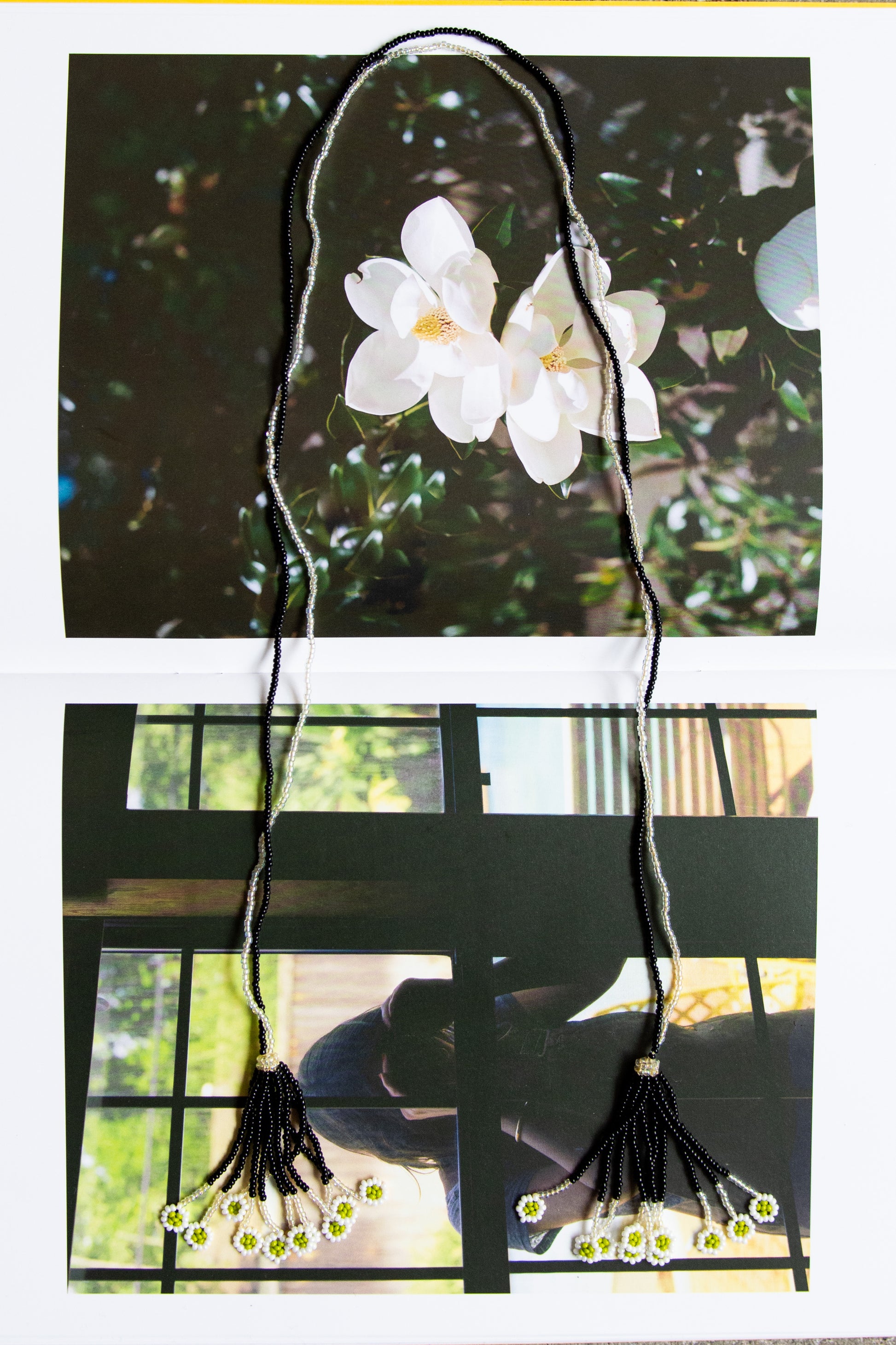 Beaded tassel flower accessory. Can both be worn as necklace, tie and as a hair piece. Made in clear Black, Green and White colored beads. 100% handmade.