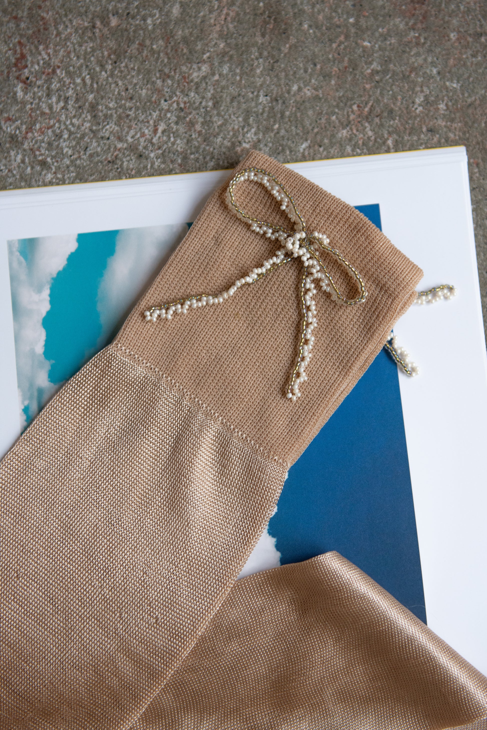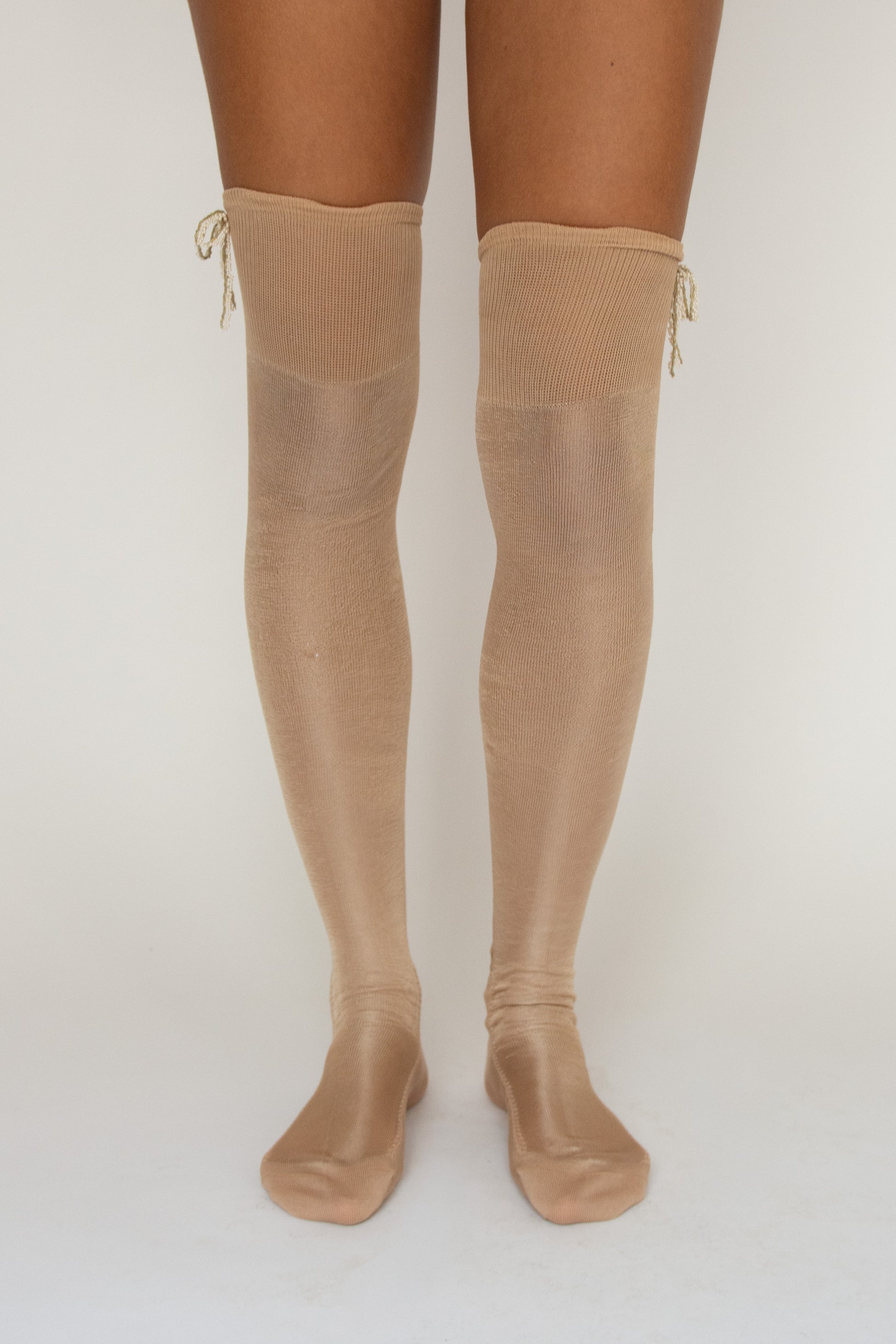 Fine ribbed, silk over-the-knee socks with beaded bow attached at hem. Super soft and delicate.