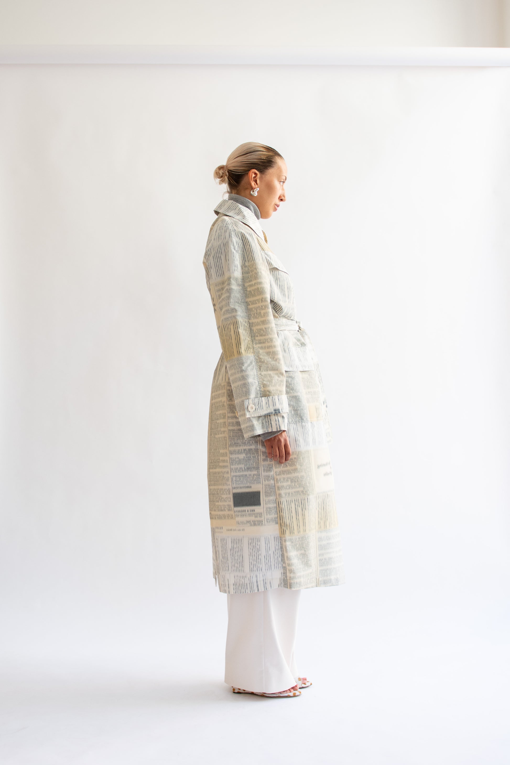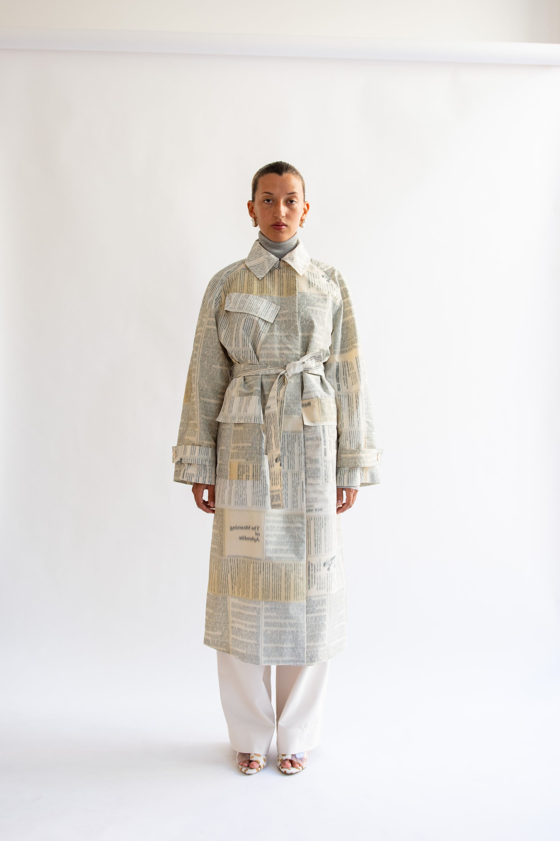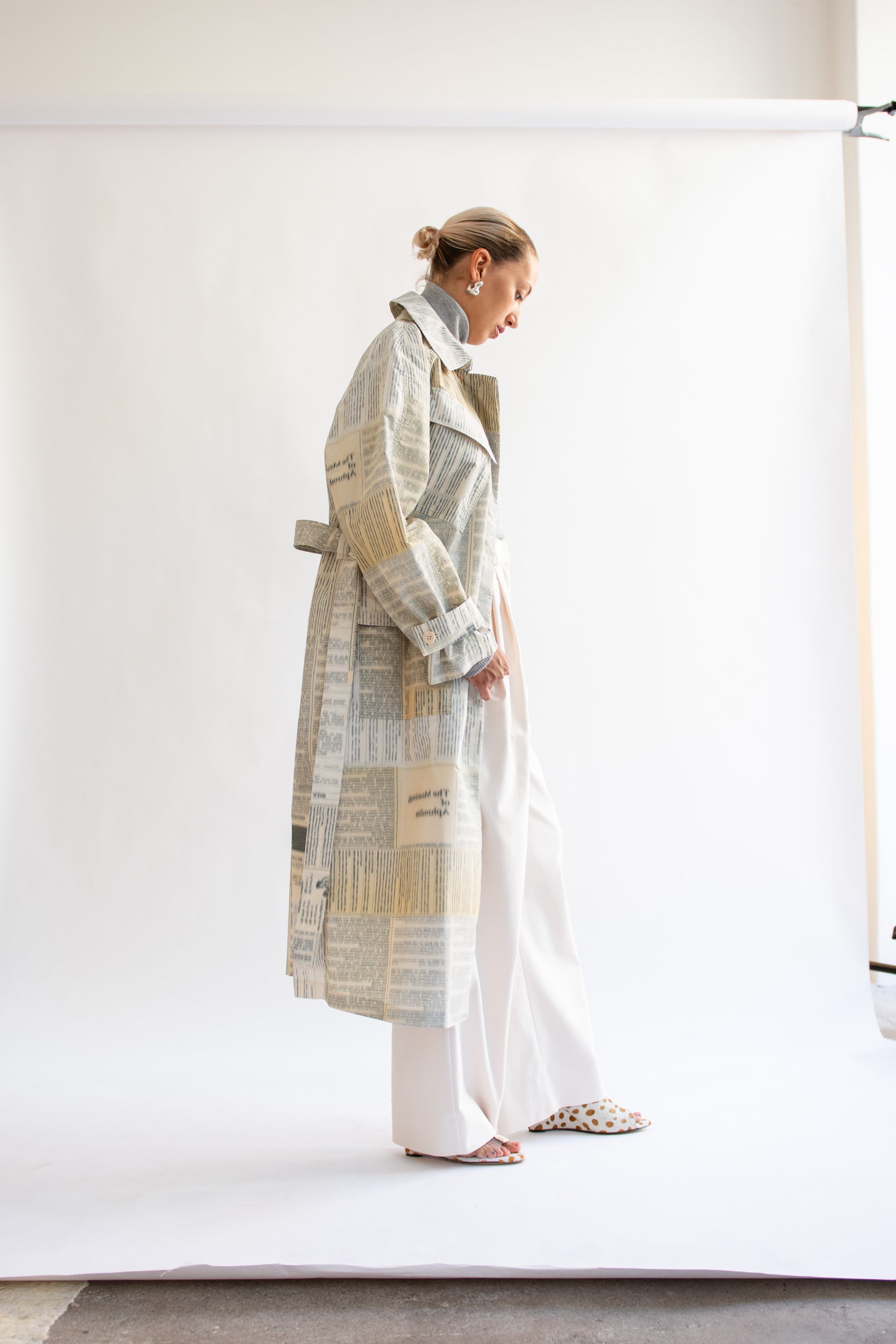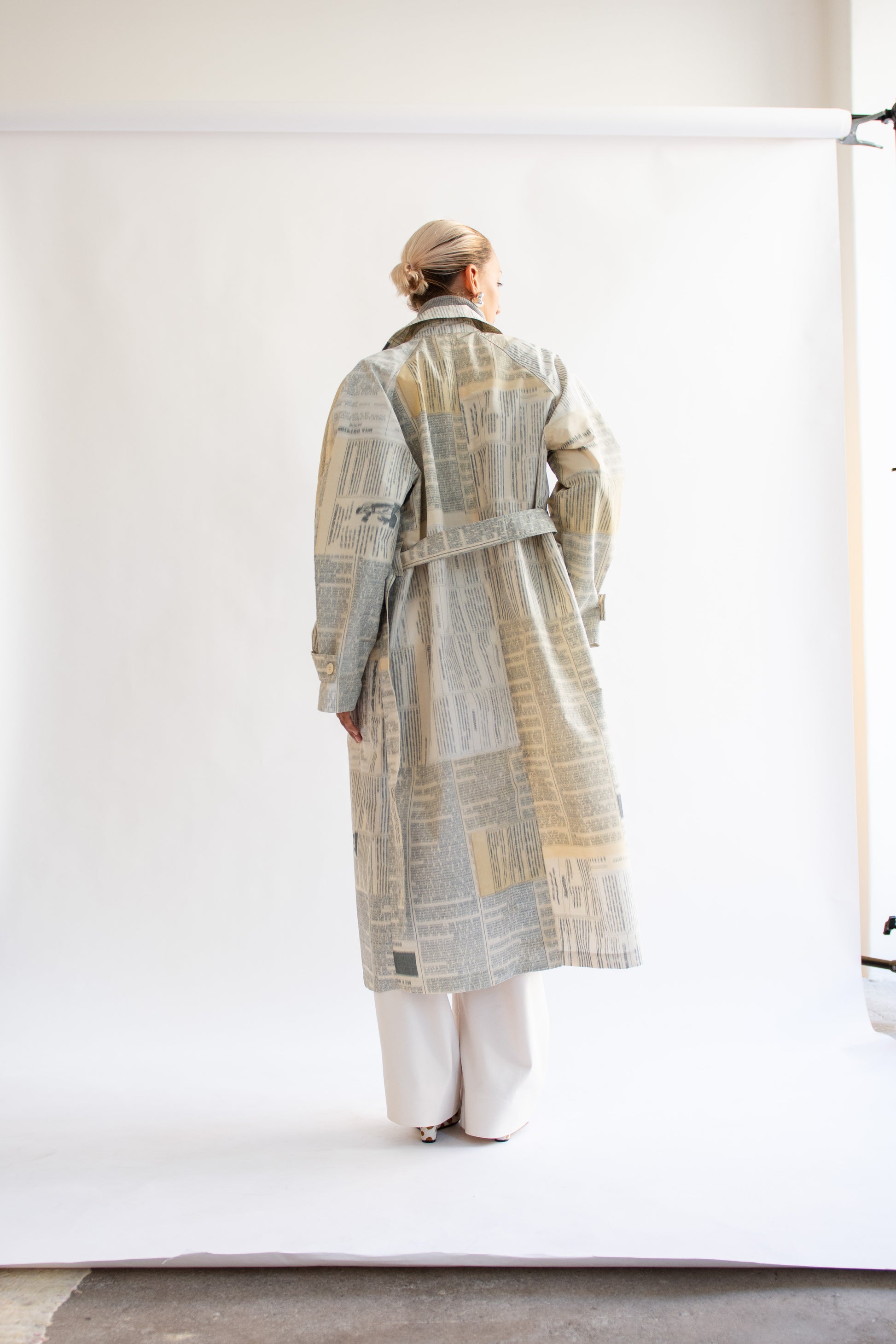 Classic trench cut from water-resistant printed taffeta. Three front patch pockets. Included self-tie belt for a customizable fit.