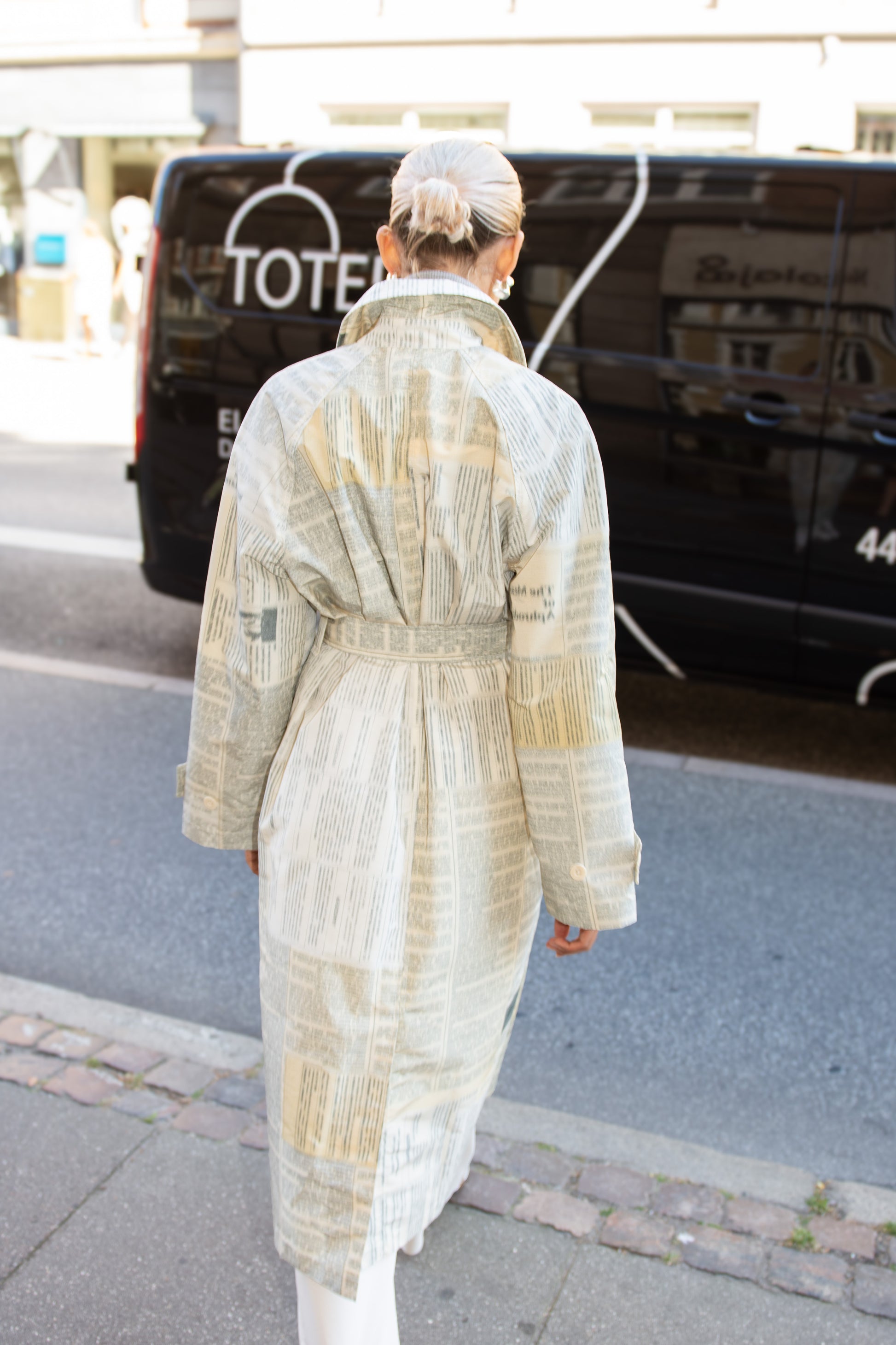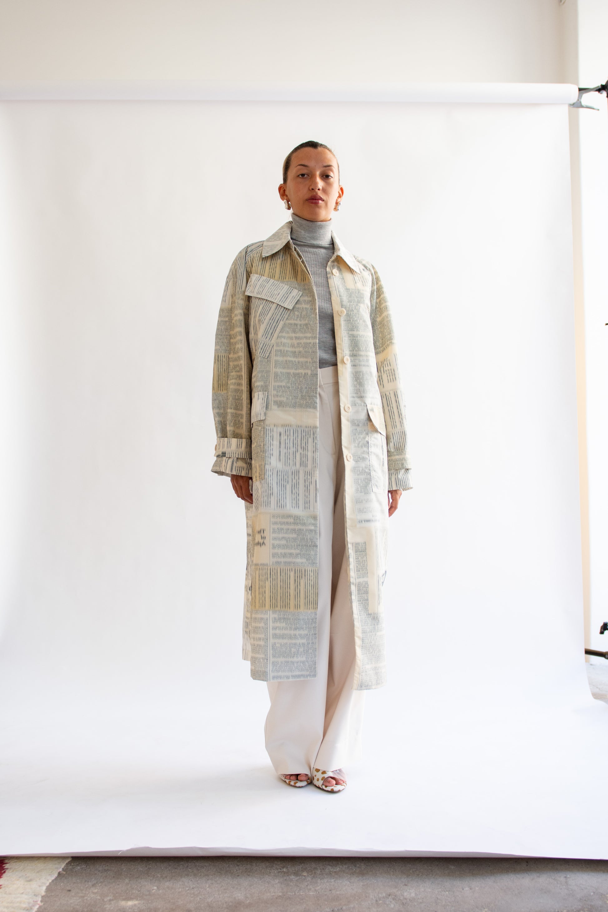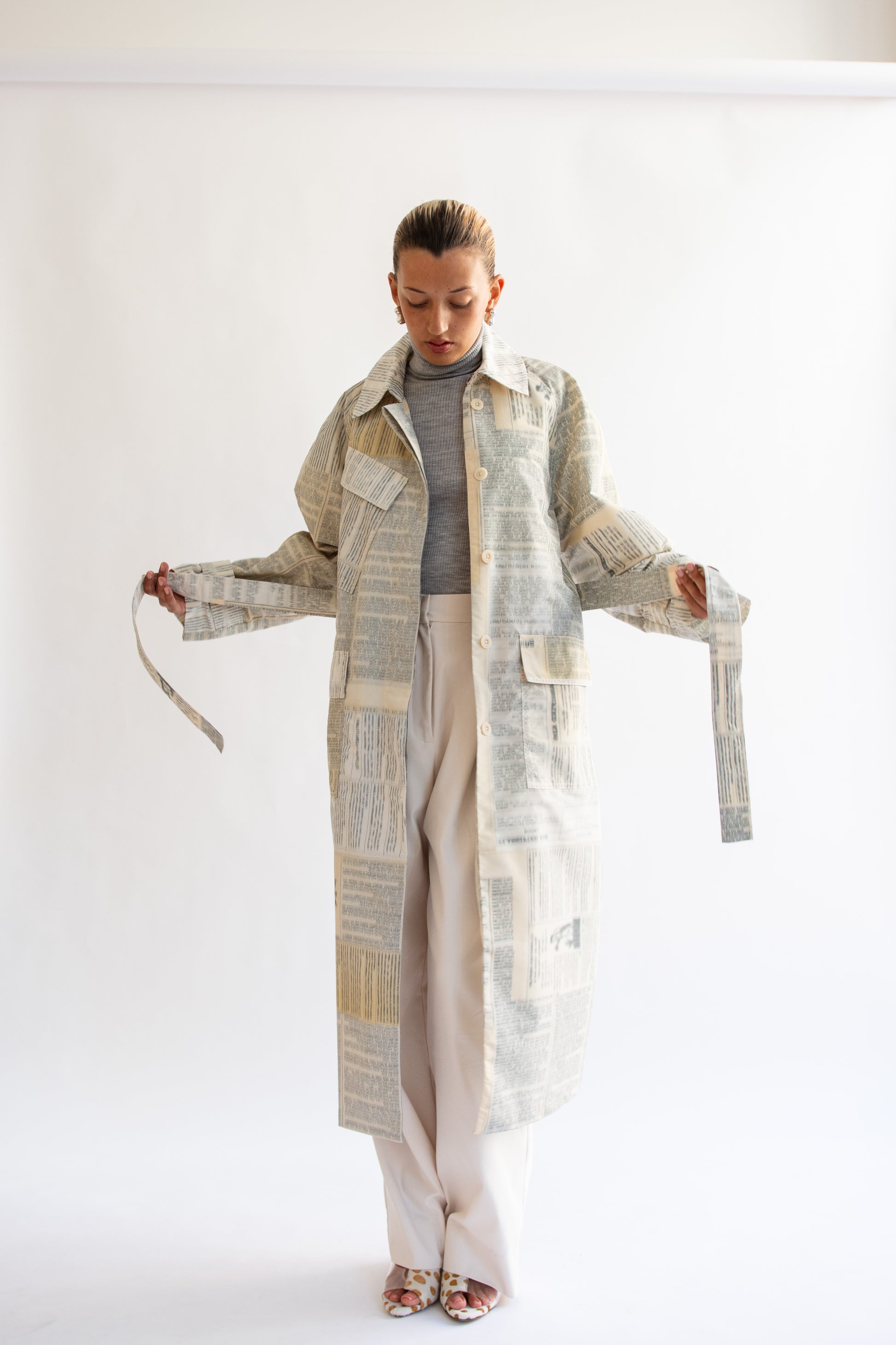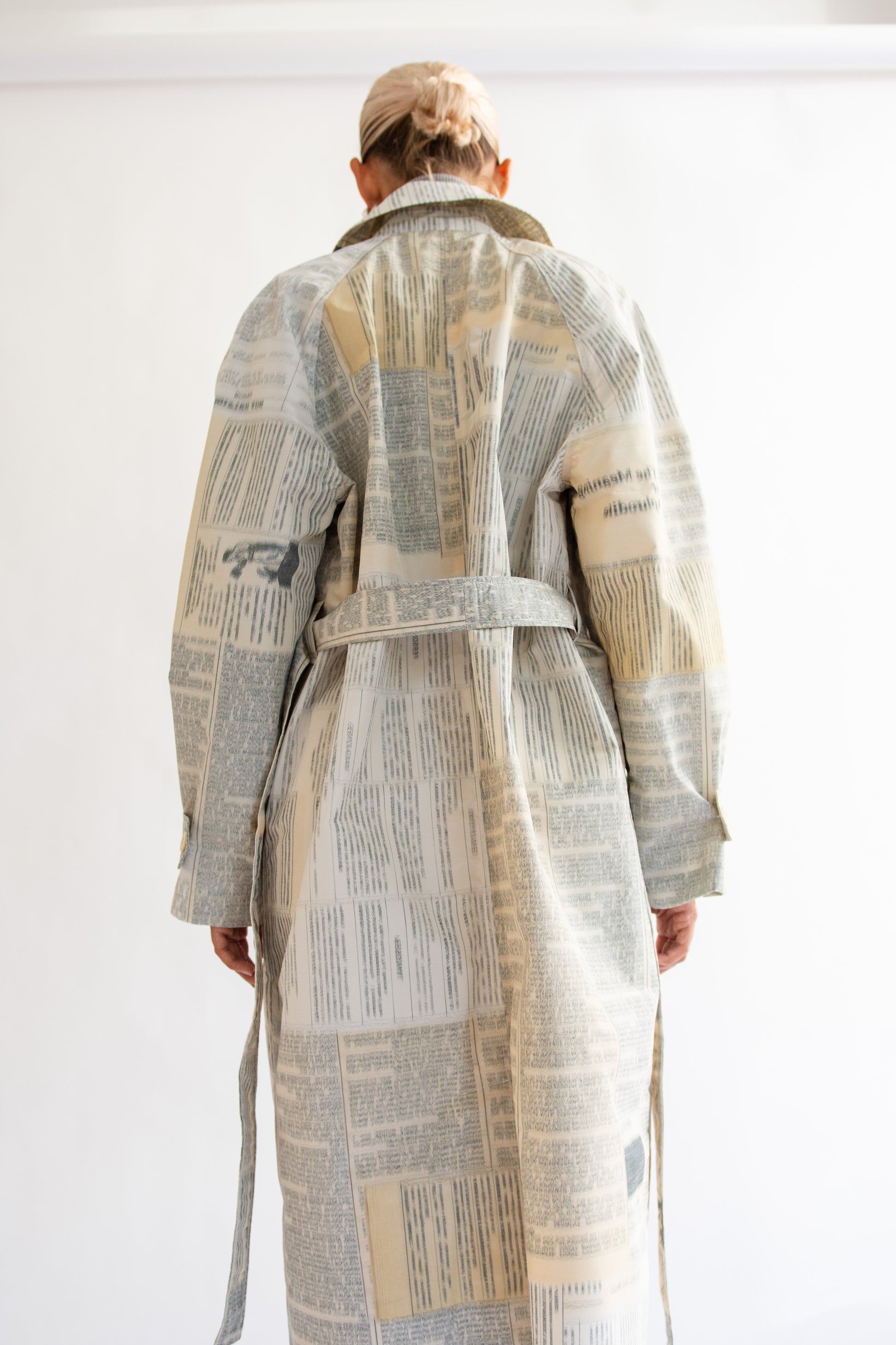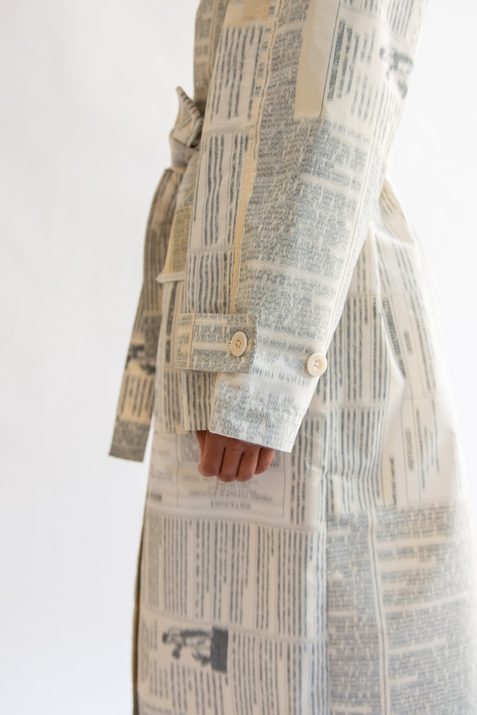 Classic trench cut from water-resistant printed taffeta. Three front patch pockets. Included self-tie belt for a customizable fit.