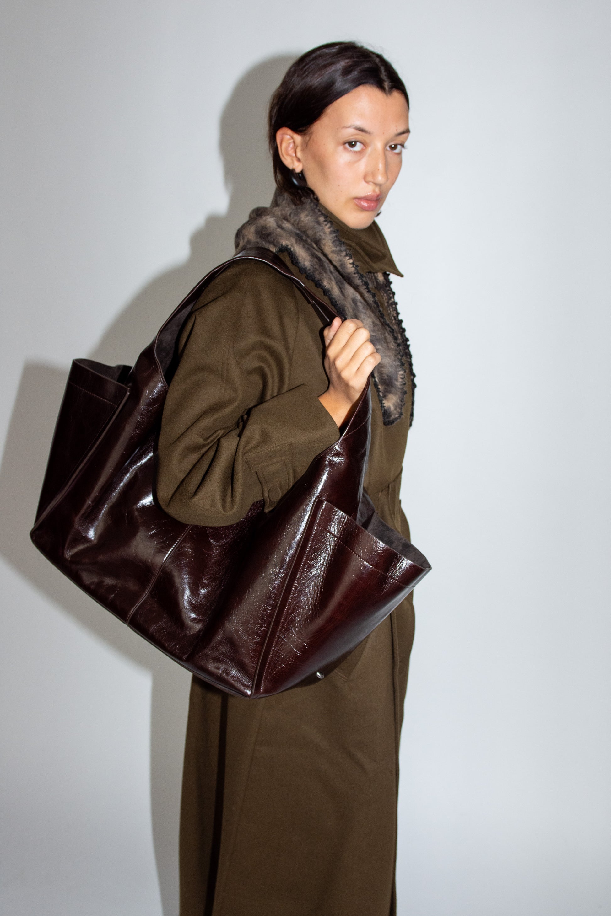 Large and roomy bag in Reddish Brown 100% glossy cow leather. Fixed shoulder strap, extended exterior pockets, and magnetic closure.