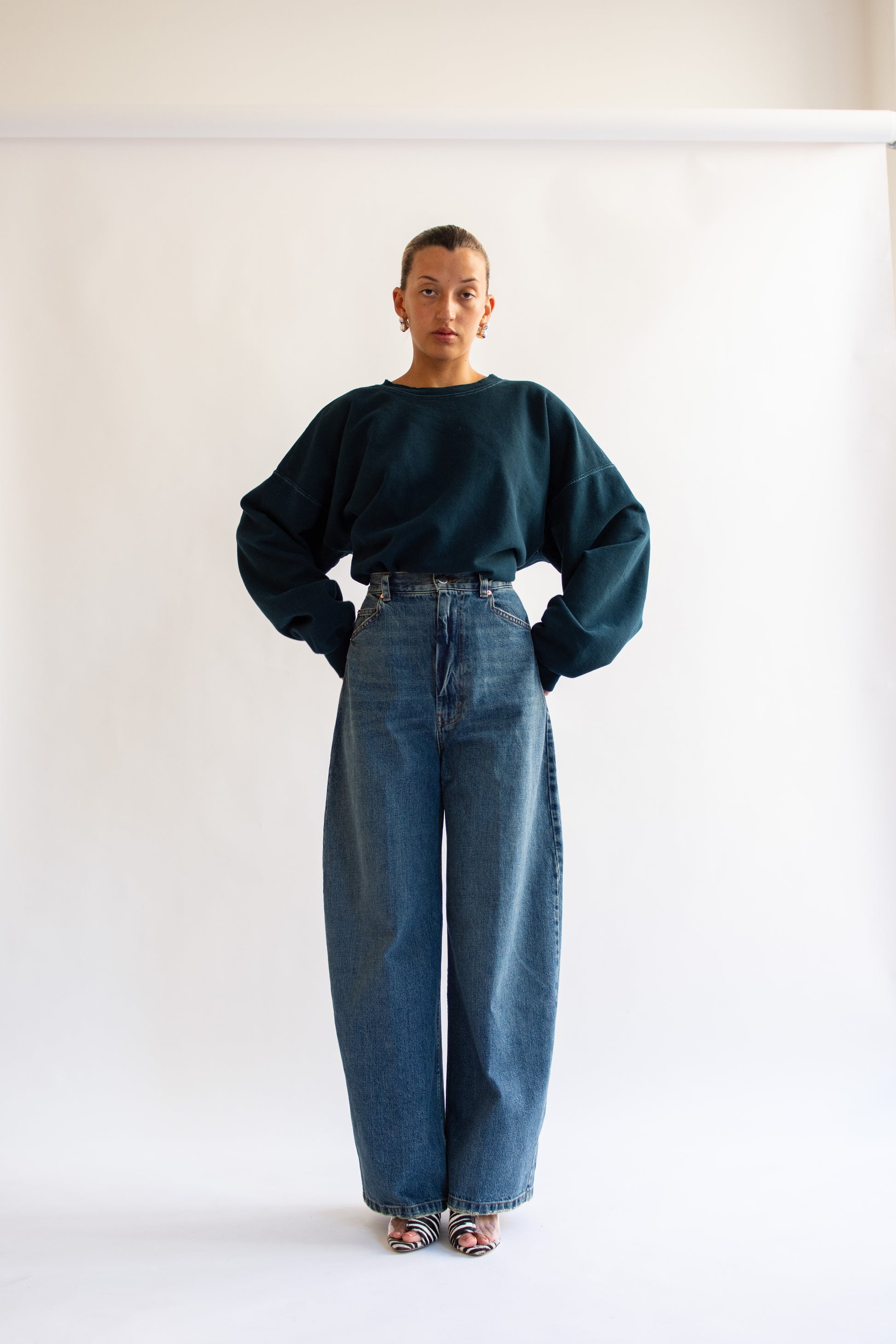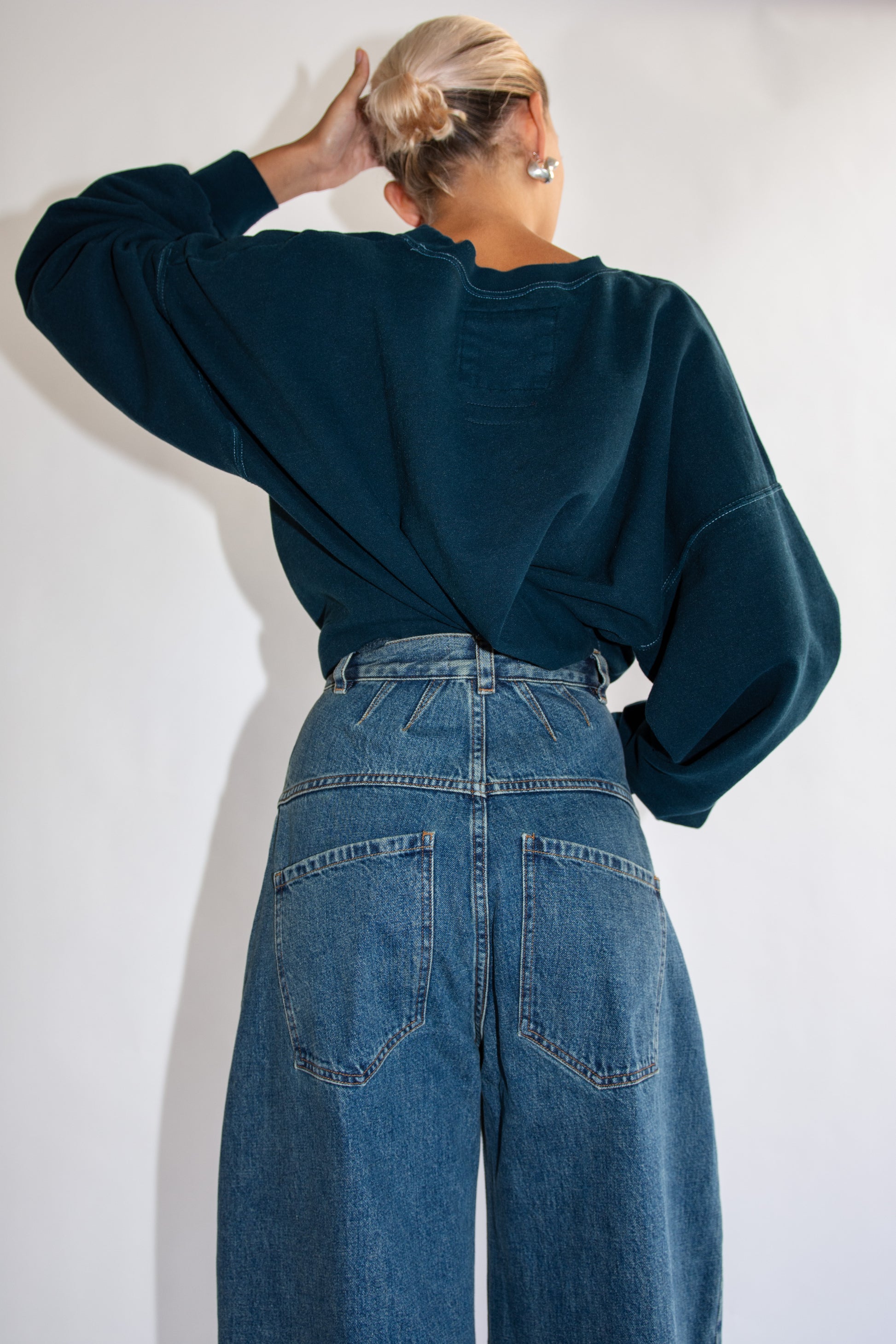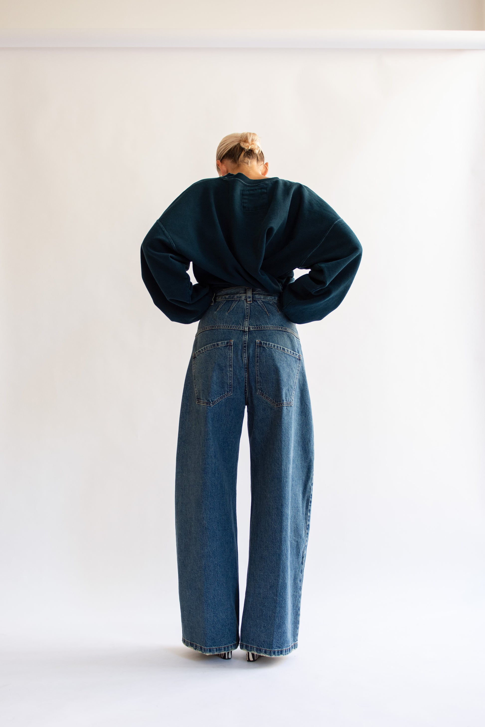 High-rise jean pant in cotton denim. Oversized silhouette. Distinct seam details on the yoke. Rear patch pockets. Zipper and button fly.