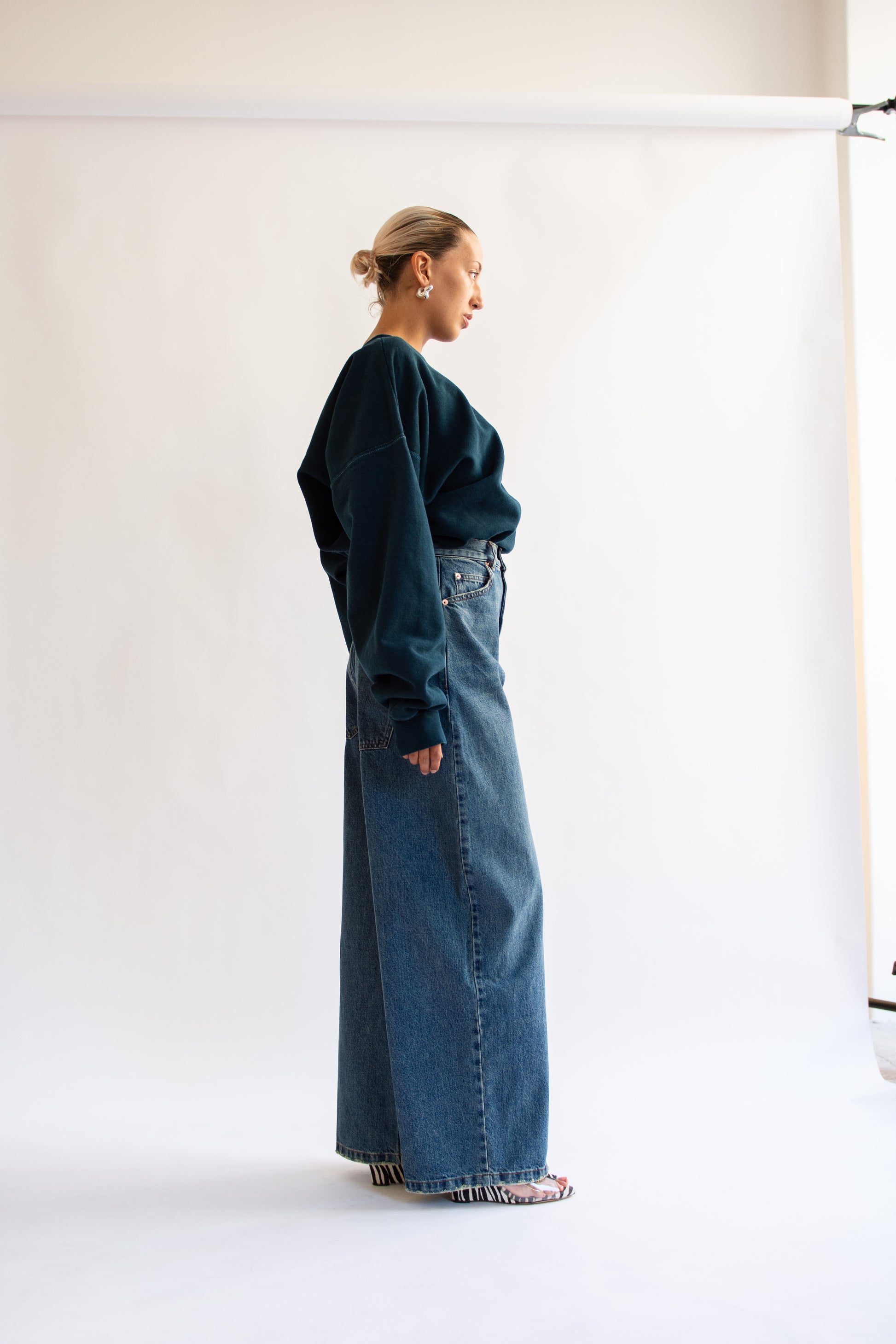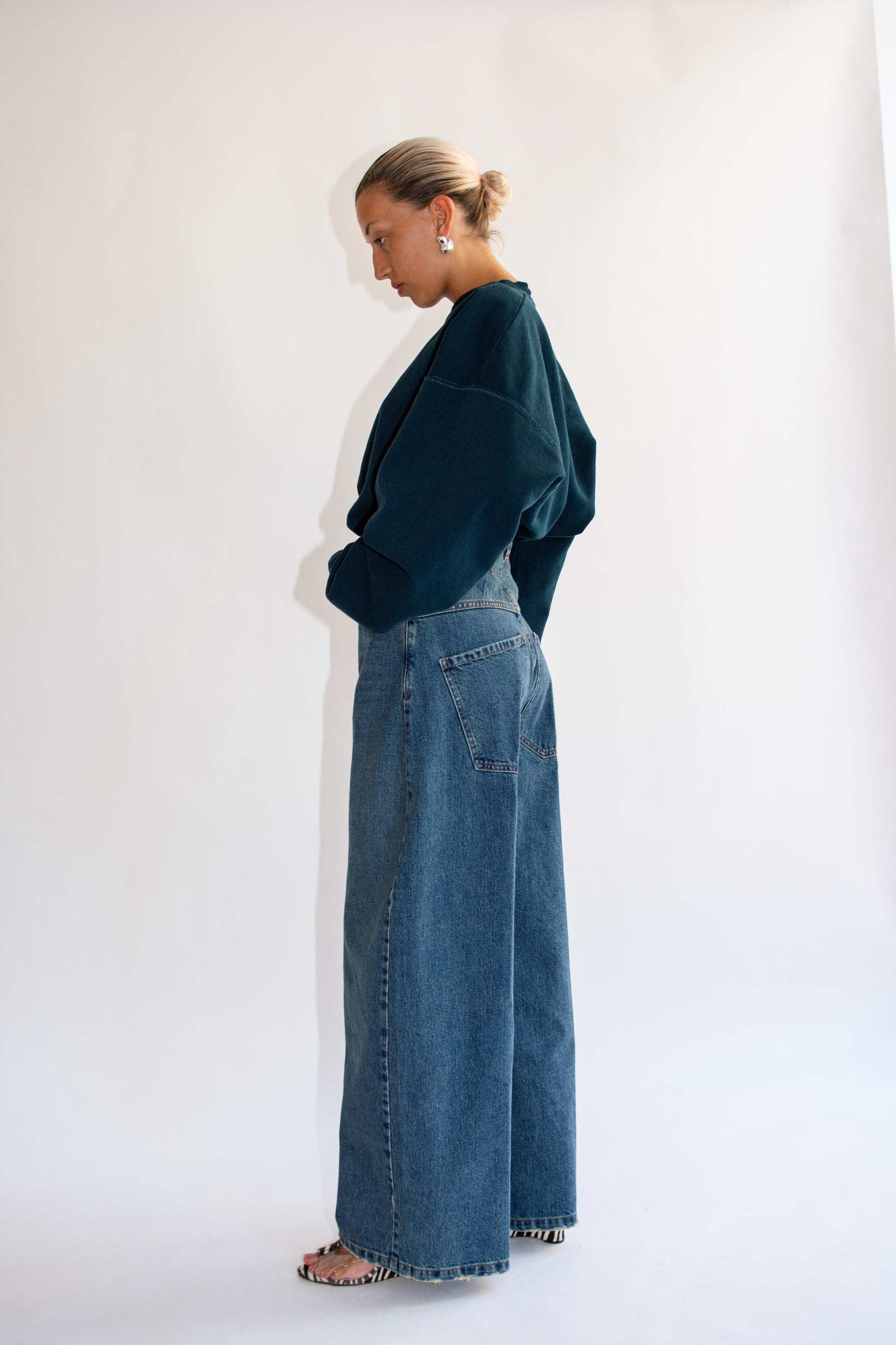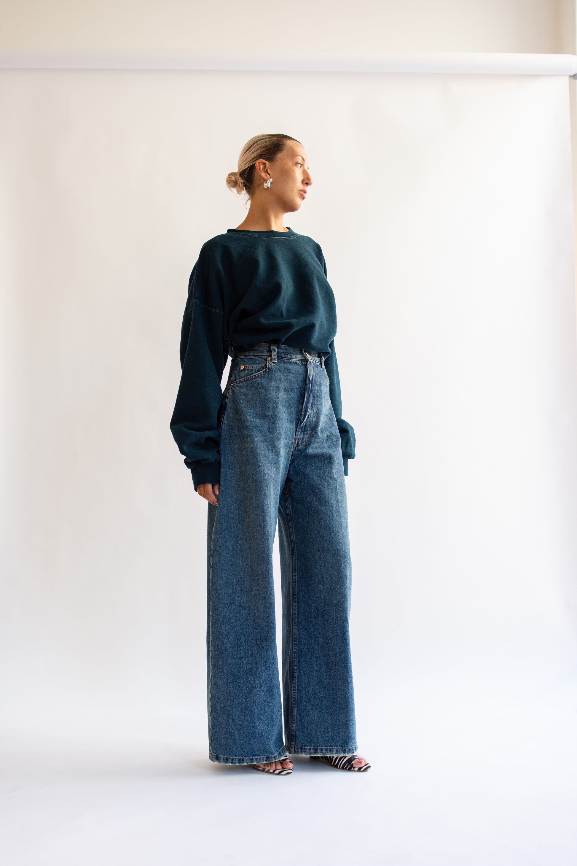 High-rise jean pant in cotton denim. Oversized silhouette. Distinct seam details on the yoke. Rear patch pockets. Zipper and button fly.