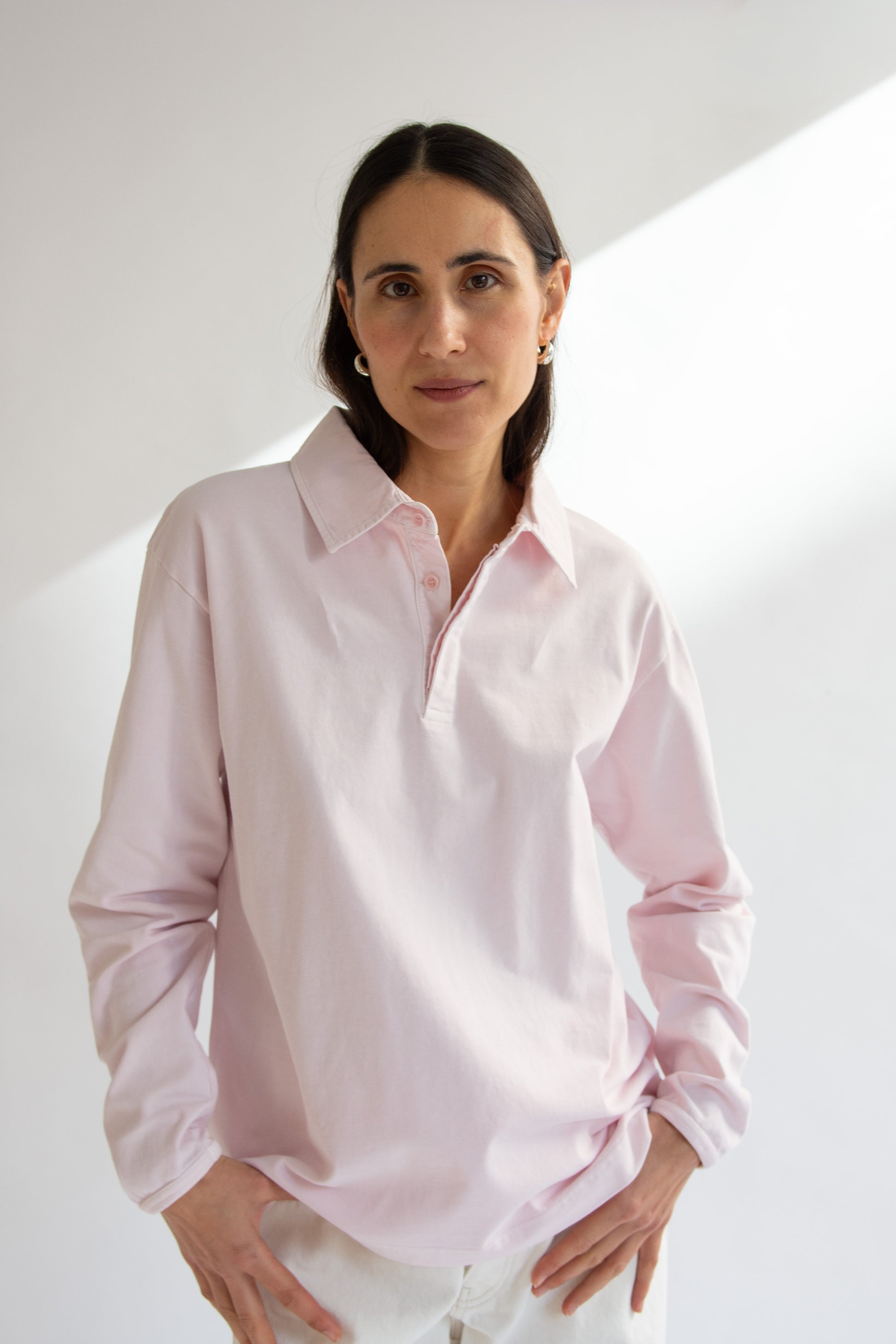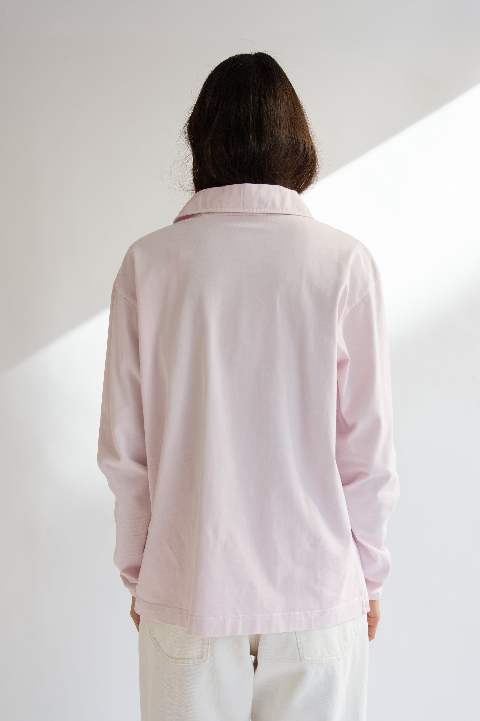 Polo shirt in pink heavy cotton jersey. Poplin collar. Placket with corozo button closure. Long sleeves with ribbed cuffs. Slits a hem side. Garment dyed and washed. Relaxed fit.