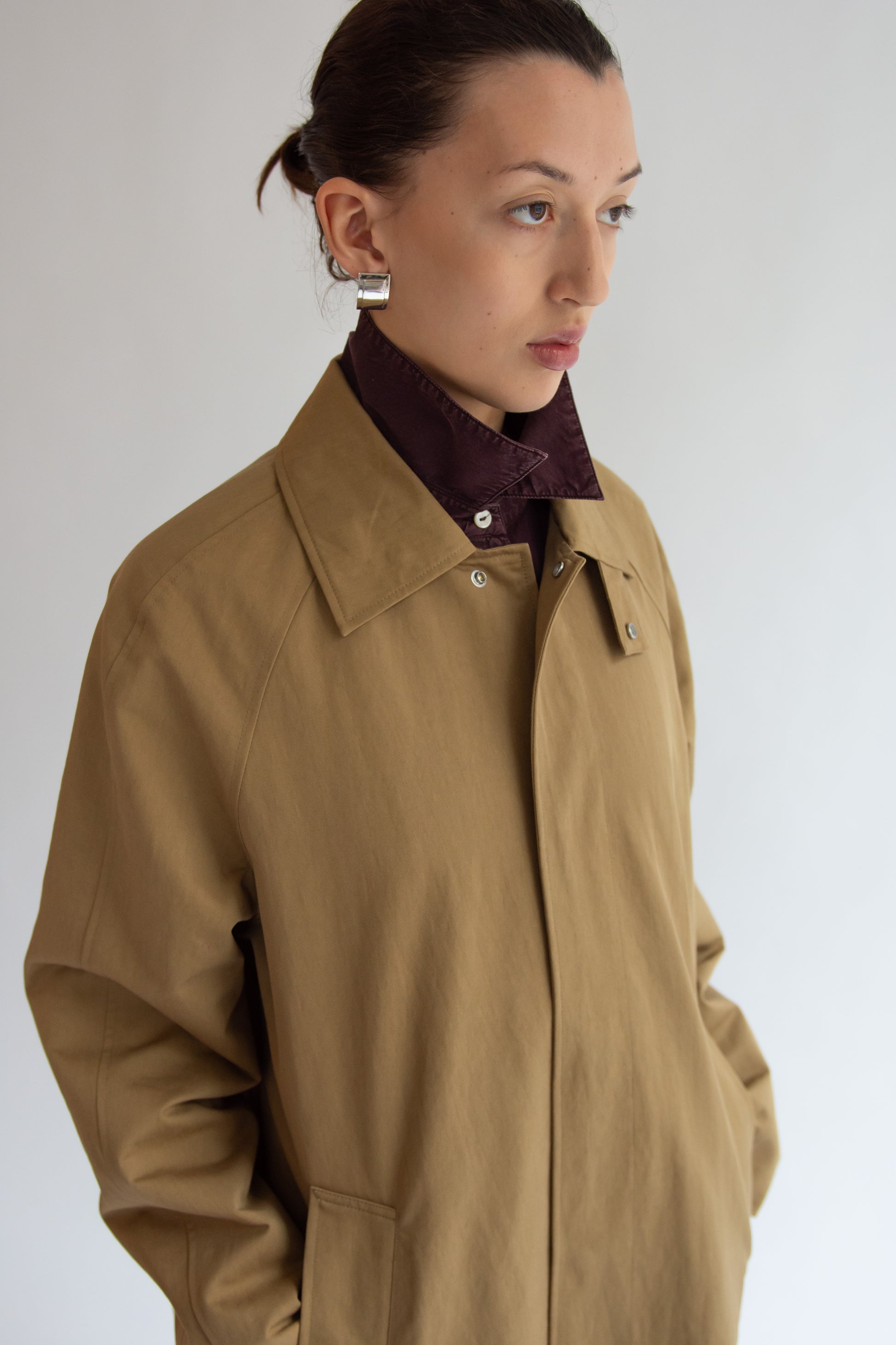 Long car coat in dark sand brushed cotton/nylon gaberdine. Storm flap at collar. Metal push button closure. Side pockets. Raglan sleeves. Slit at back. Fully lined.