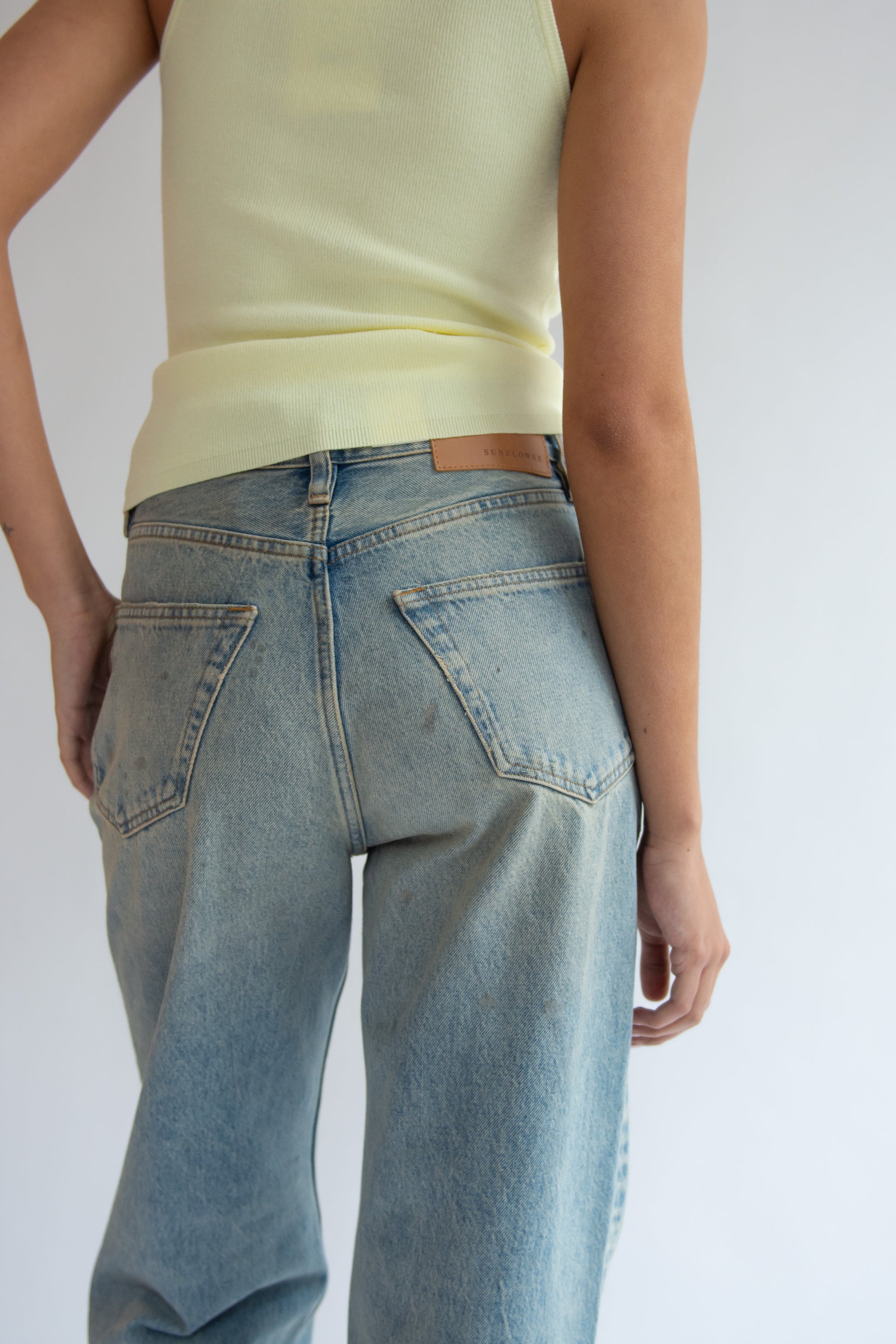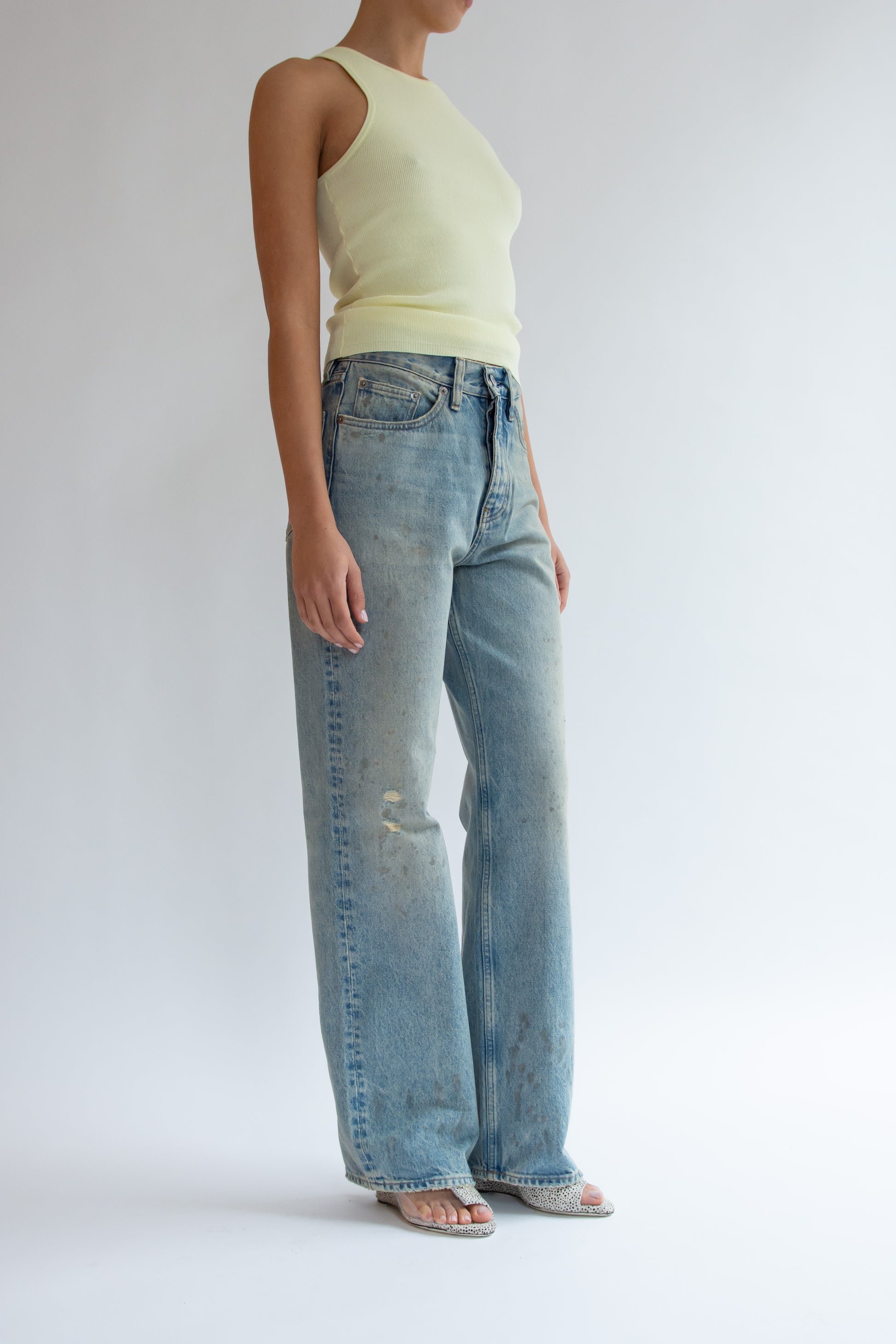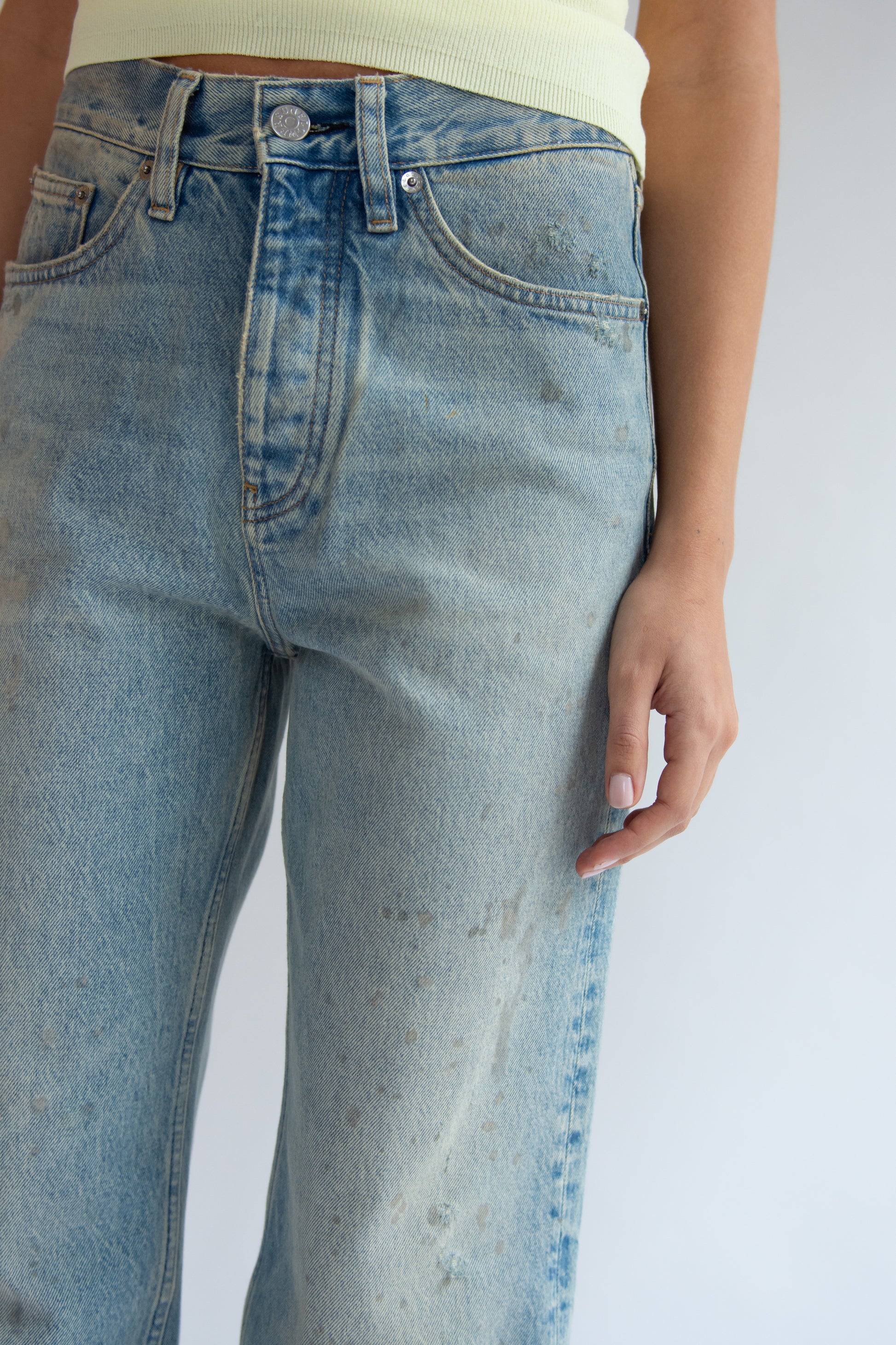 Relaxed straight leg jeans in mid blue 14 oz pure indigo organic cotton denim. High waist. Deep rise. Belt loops. Five-pocket design. Recycled silver metal hardware. Button fly with button closure. Leather logo label at back. Paint spots and distressed effect. Stonewash.