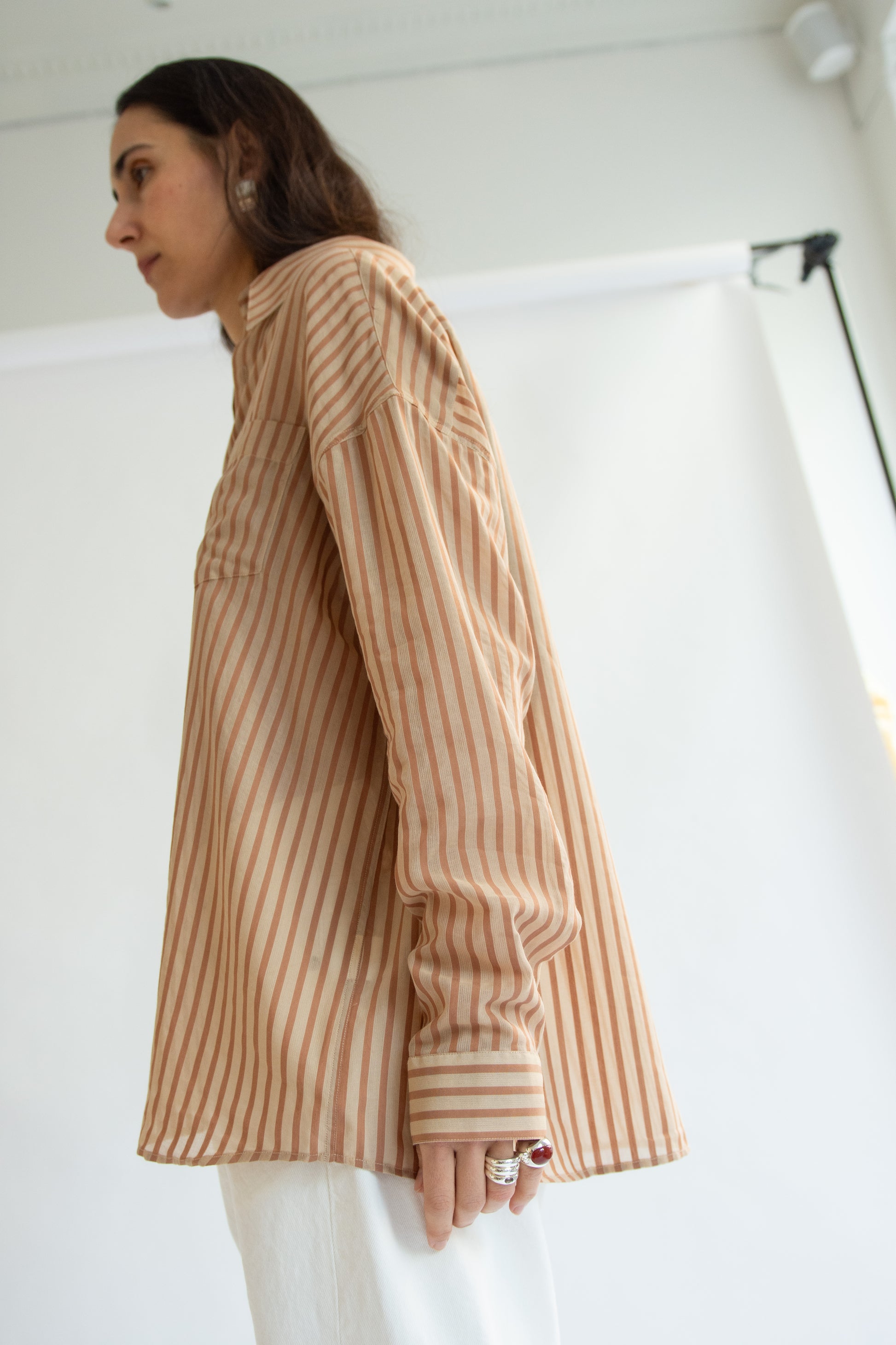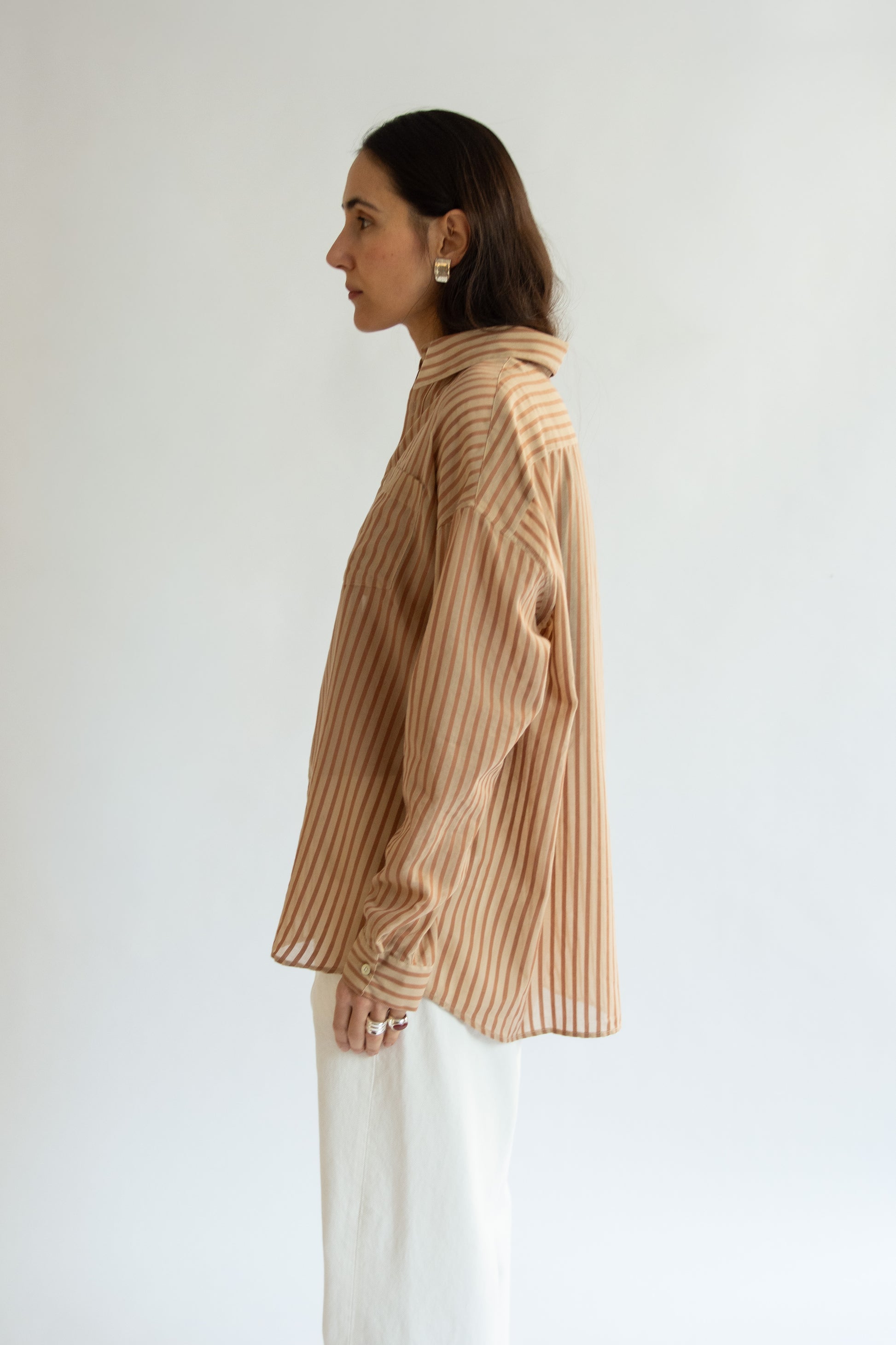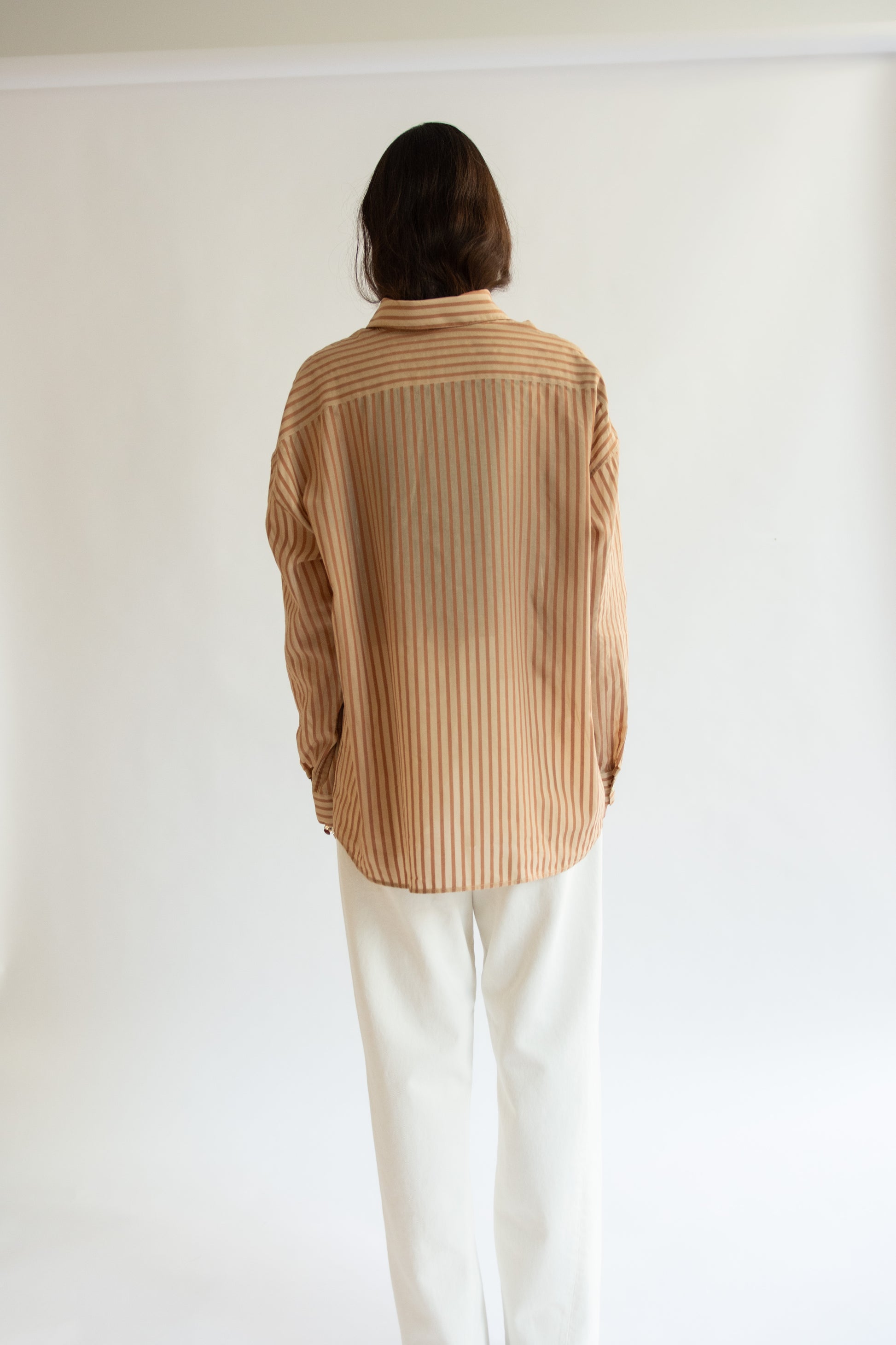 Mens collared shirt in brown pinstripe lightweight cotton tencel. Pointed split collar. Button-down front with real mother-of-pearl buttons. Chest patch pocket. Long sleeves with buttoned cuffs. Relaxed fit. Slightly sheer.
