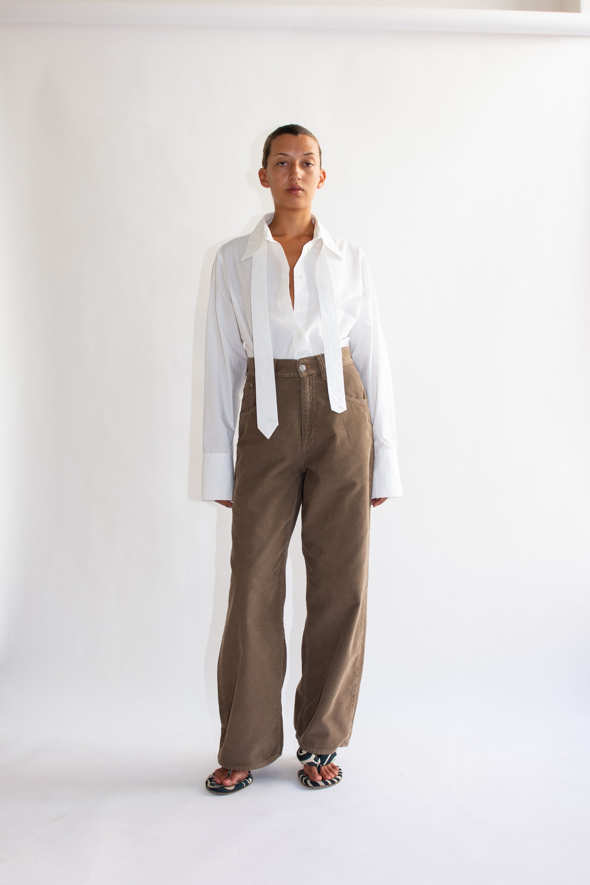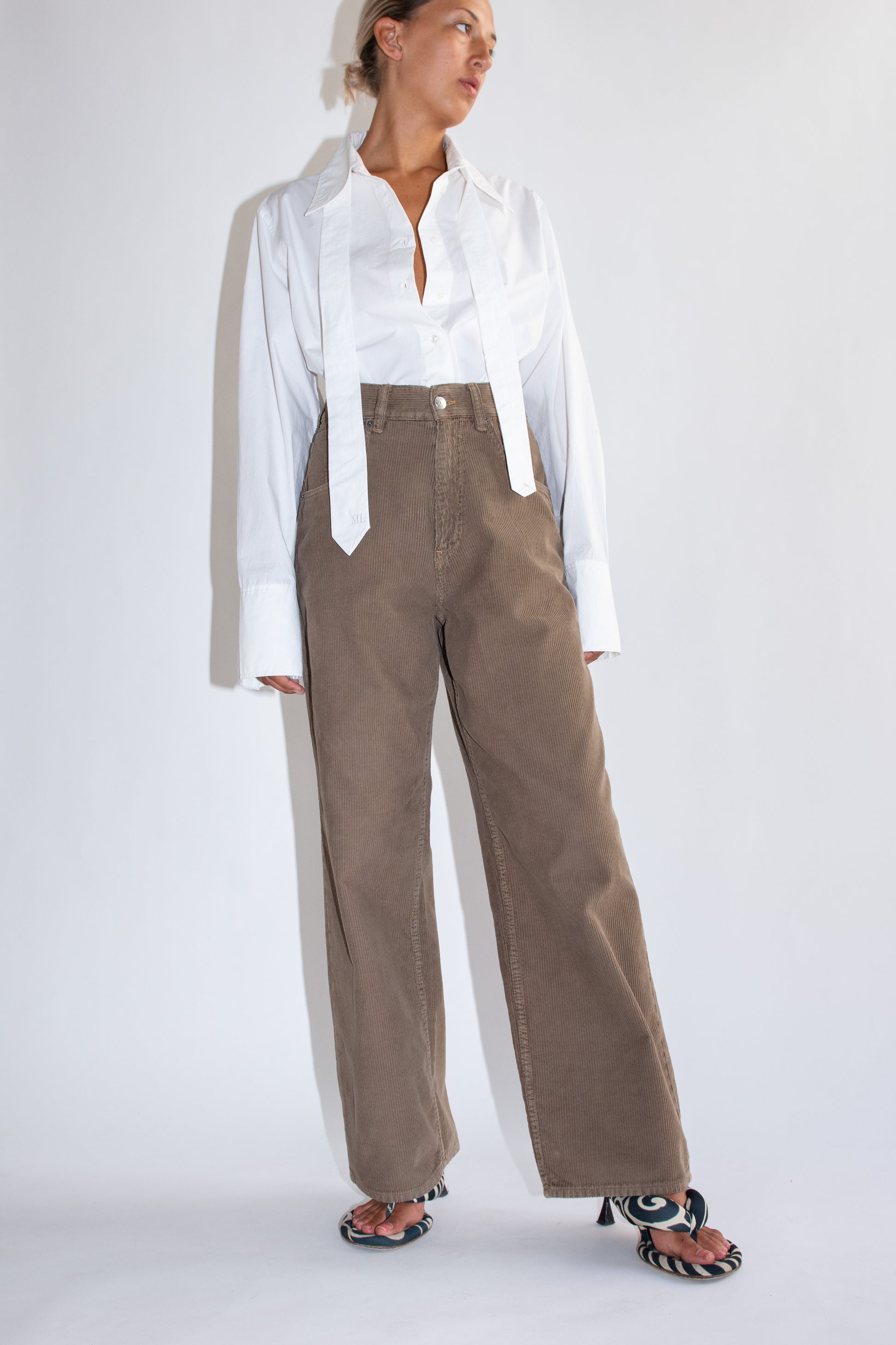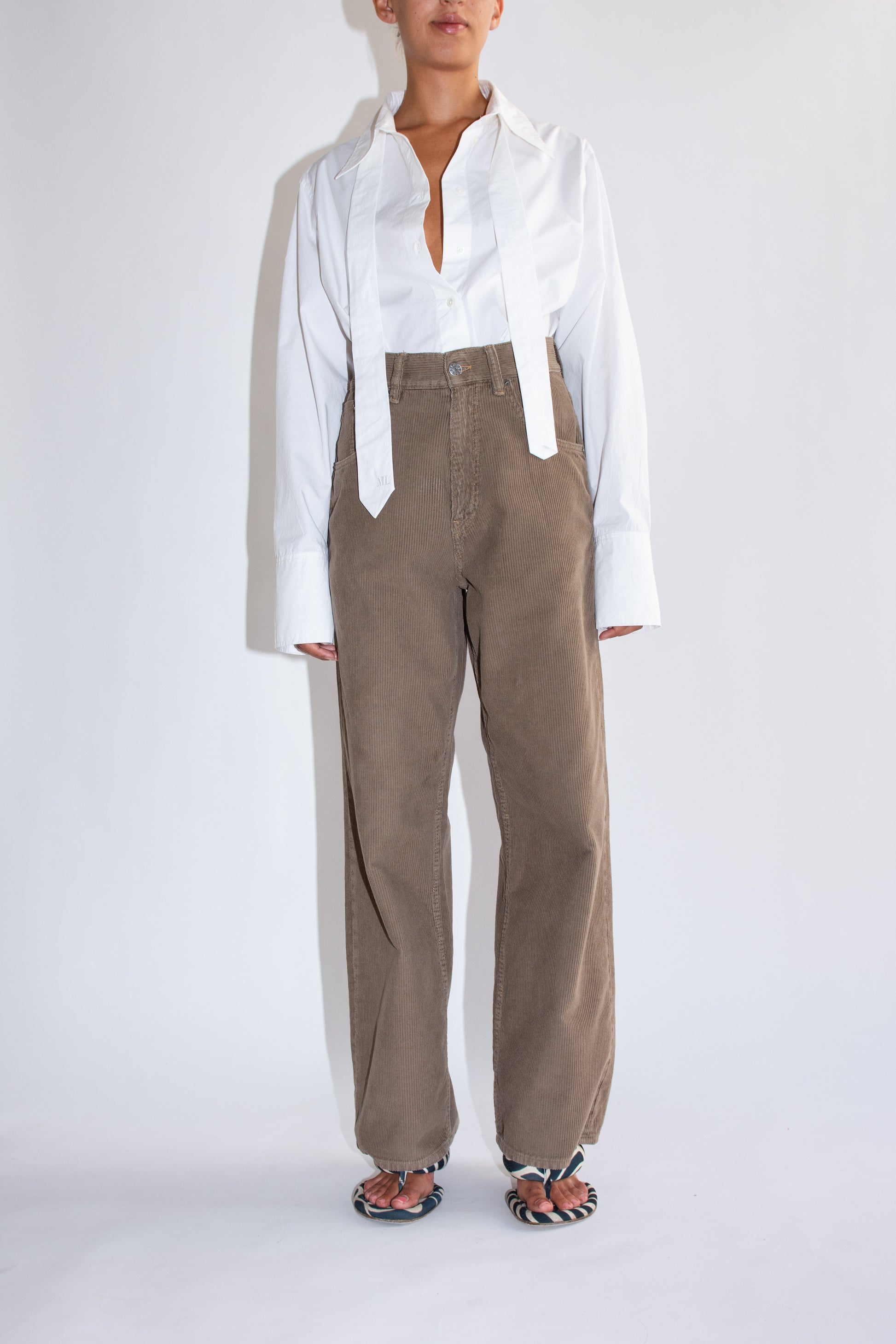 Wide fitted 5 pocket trouser in a taupe garment dyed corduroy. Belt loops. Silver metal hardware.
