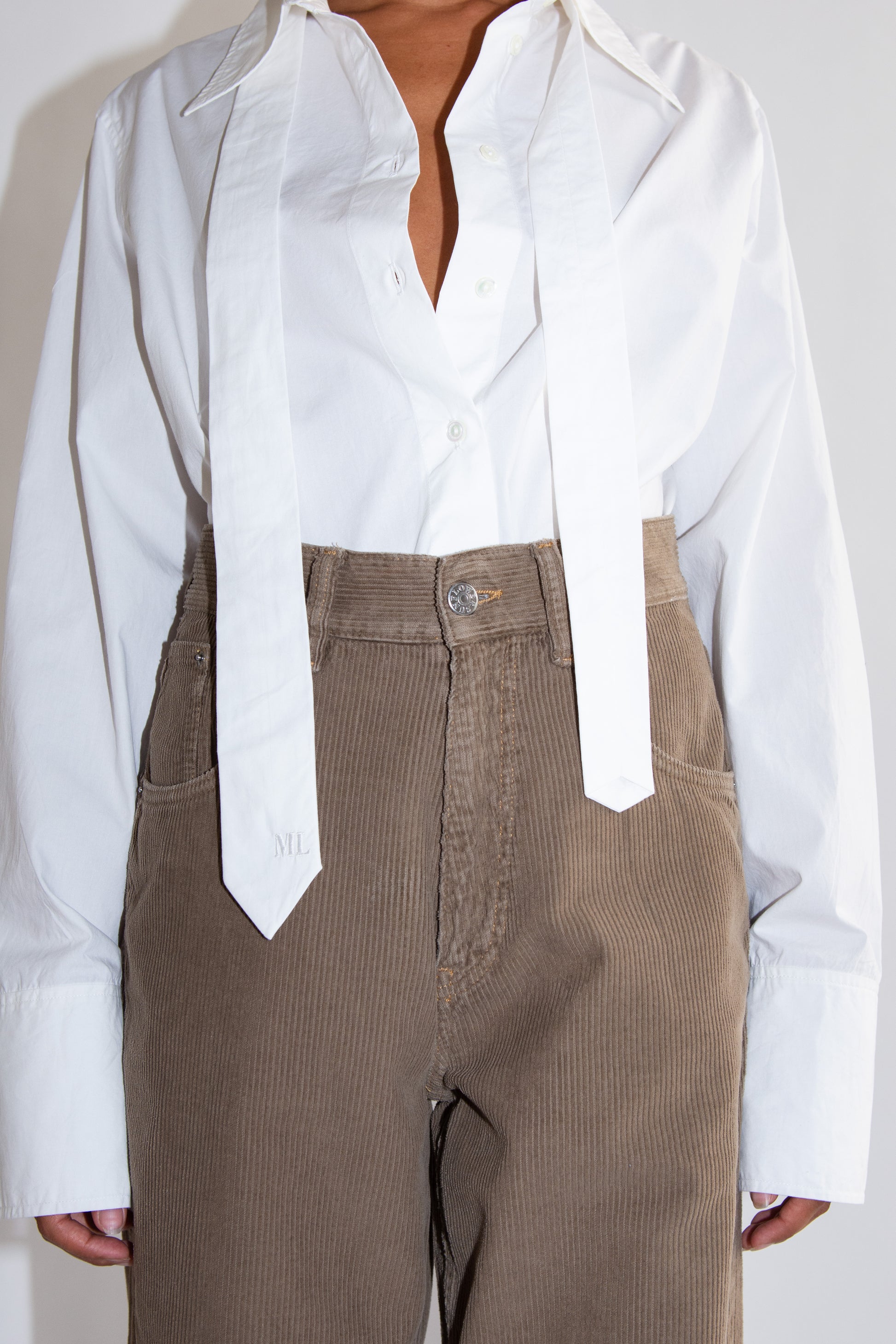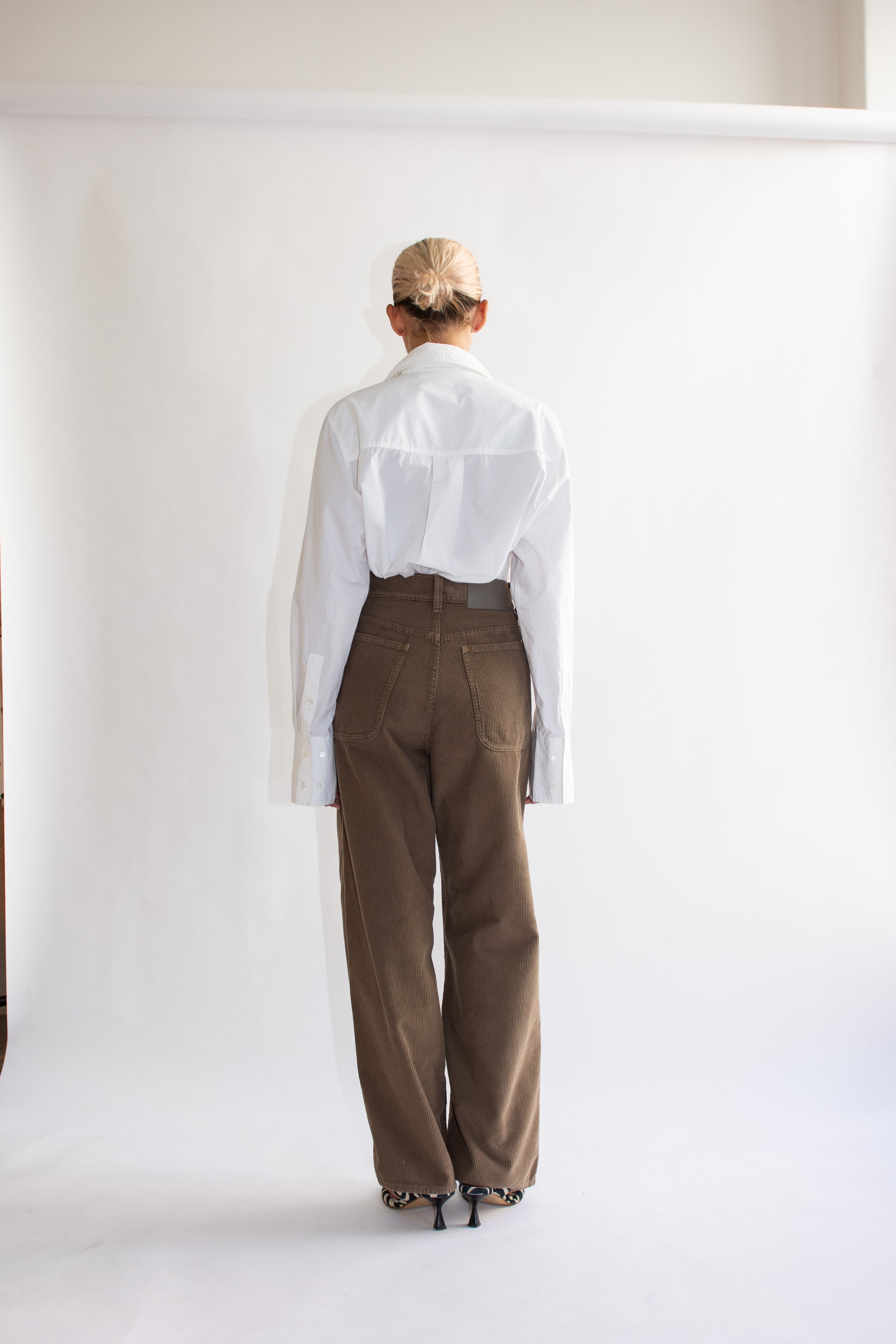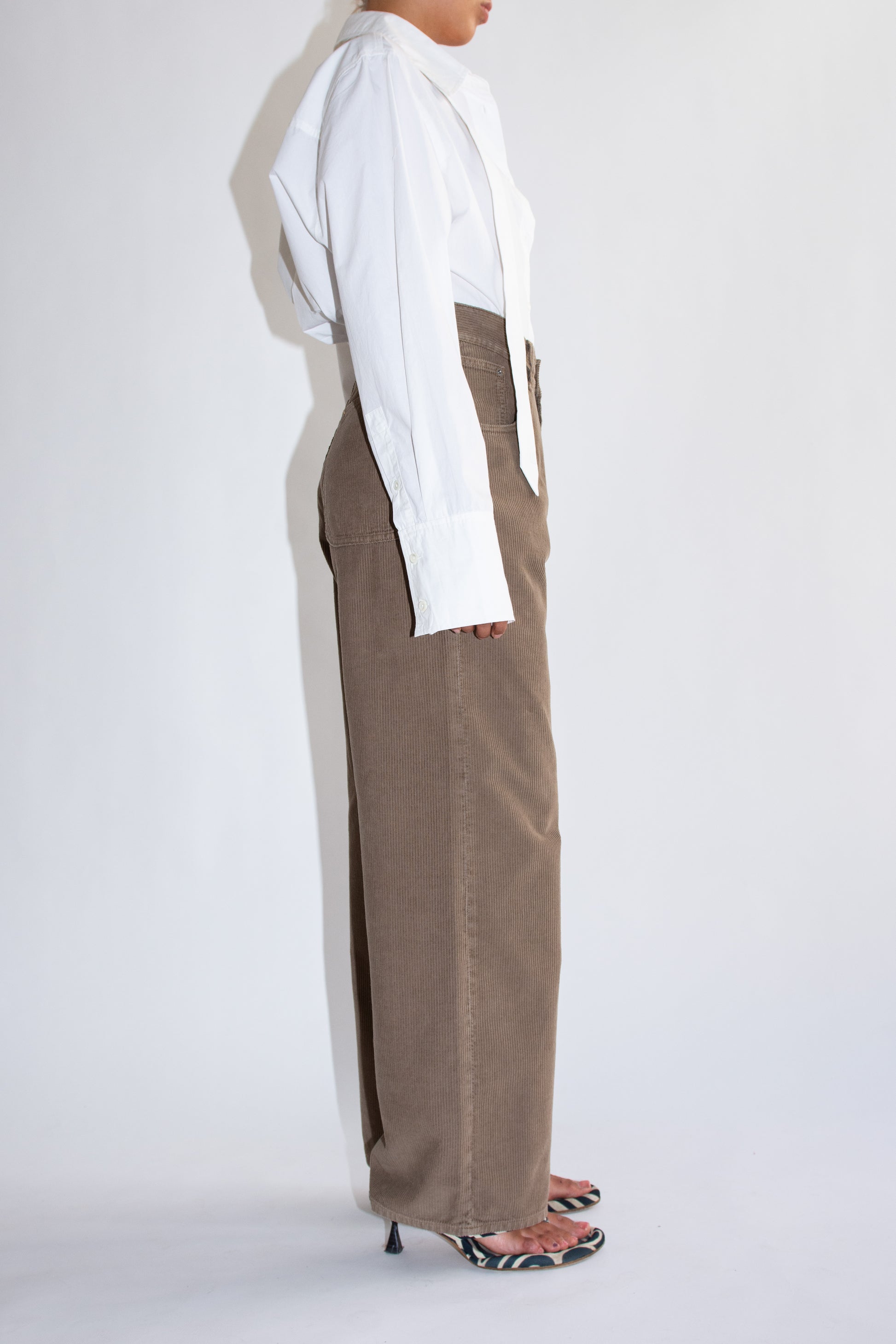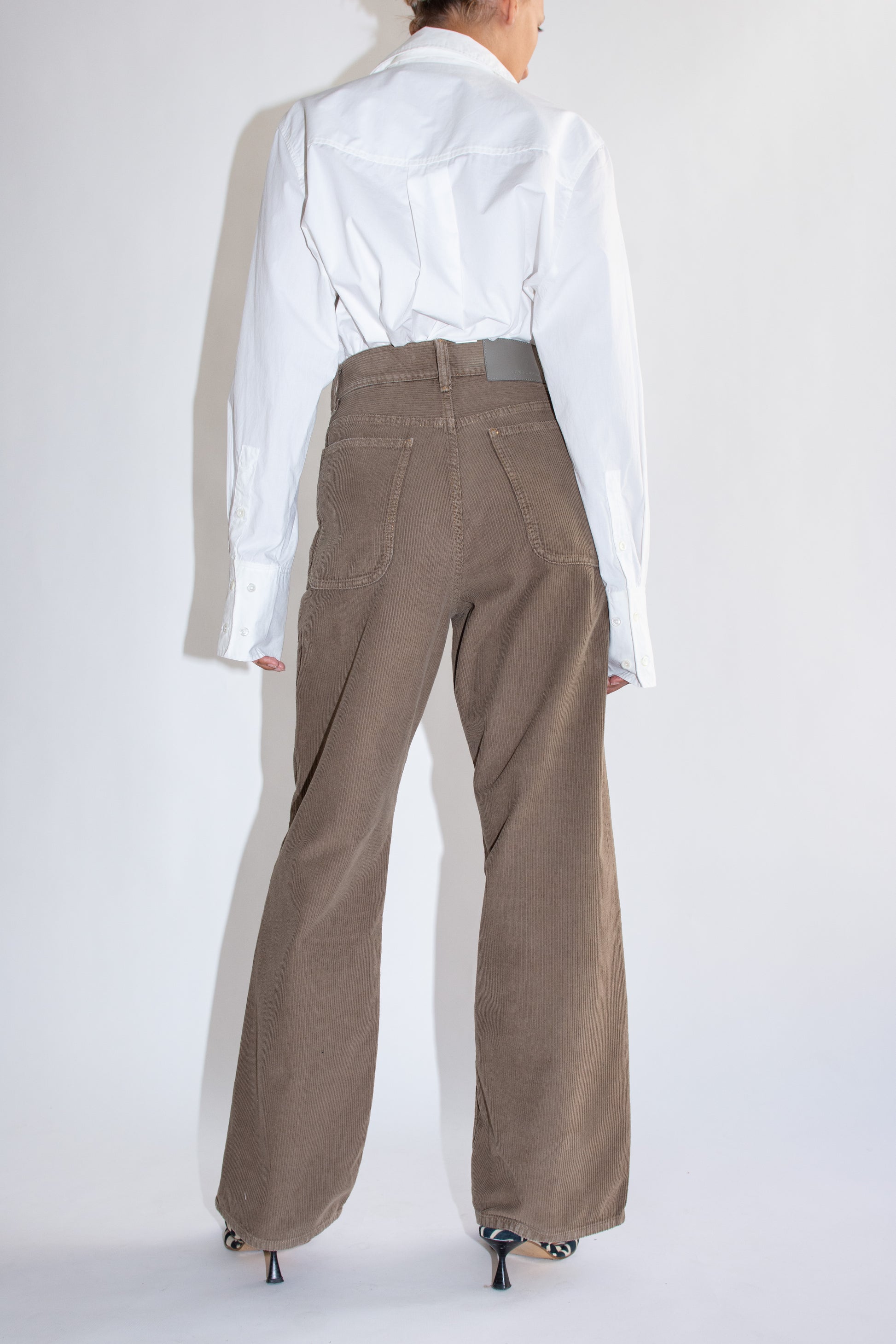 Wide fitted 5 pocket trouser in a taupe garment dyed corduroy. Belt loops. Silver metal hardware.